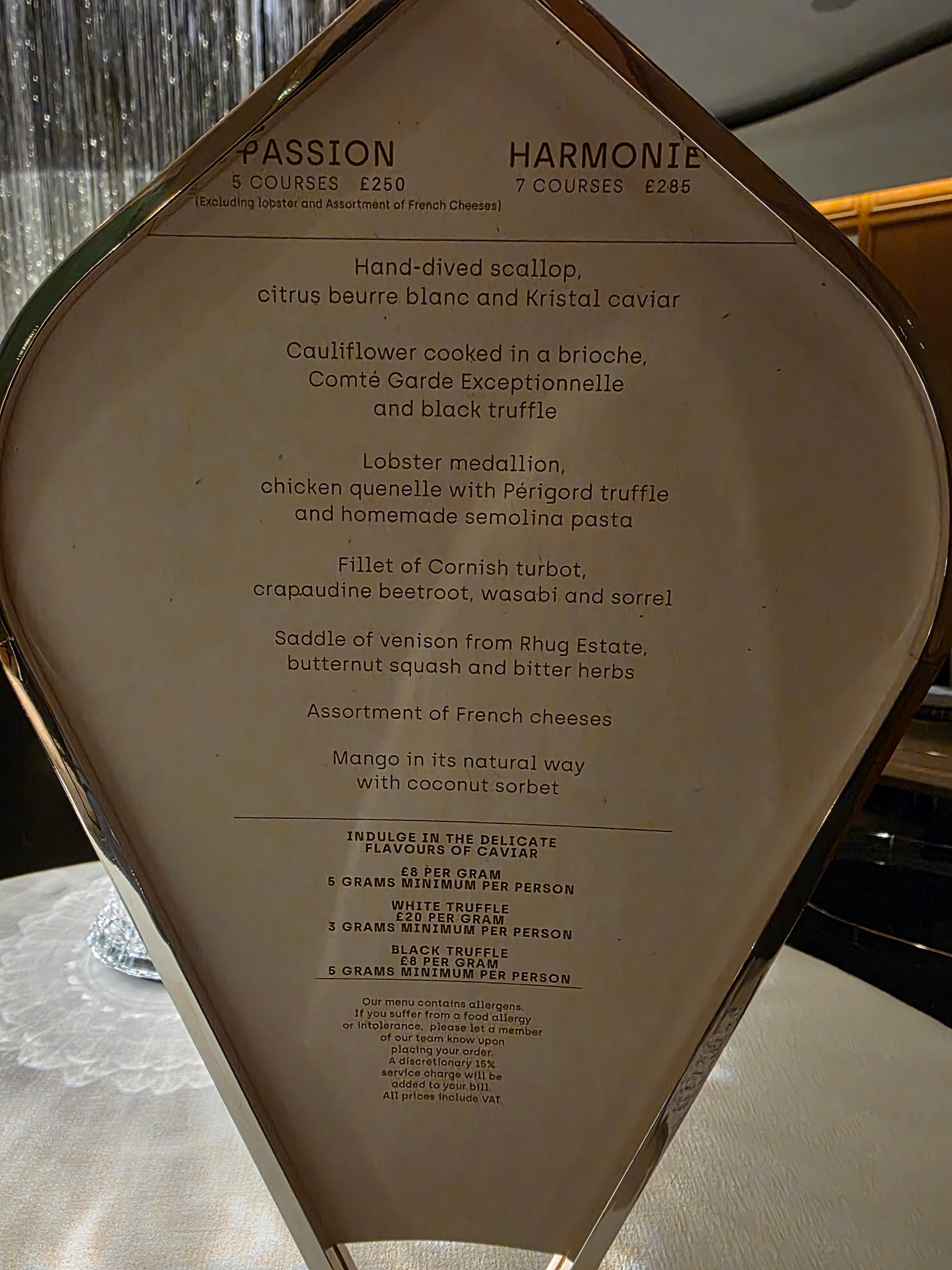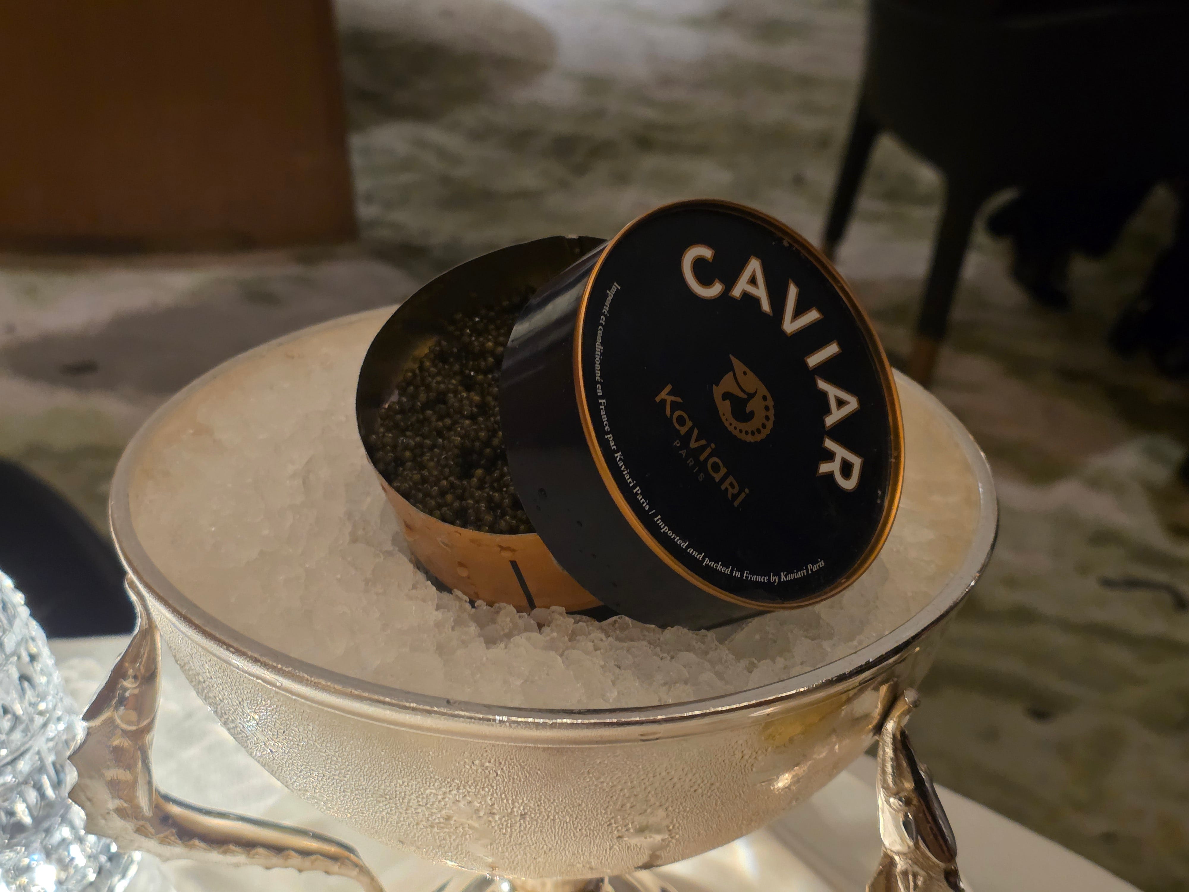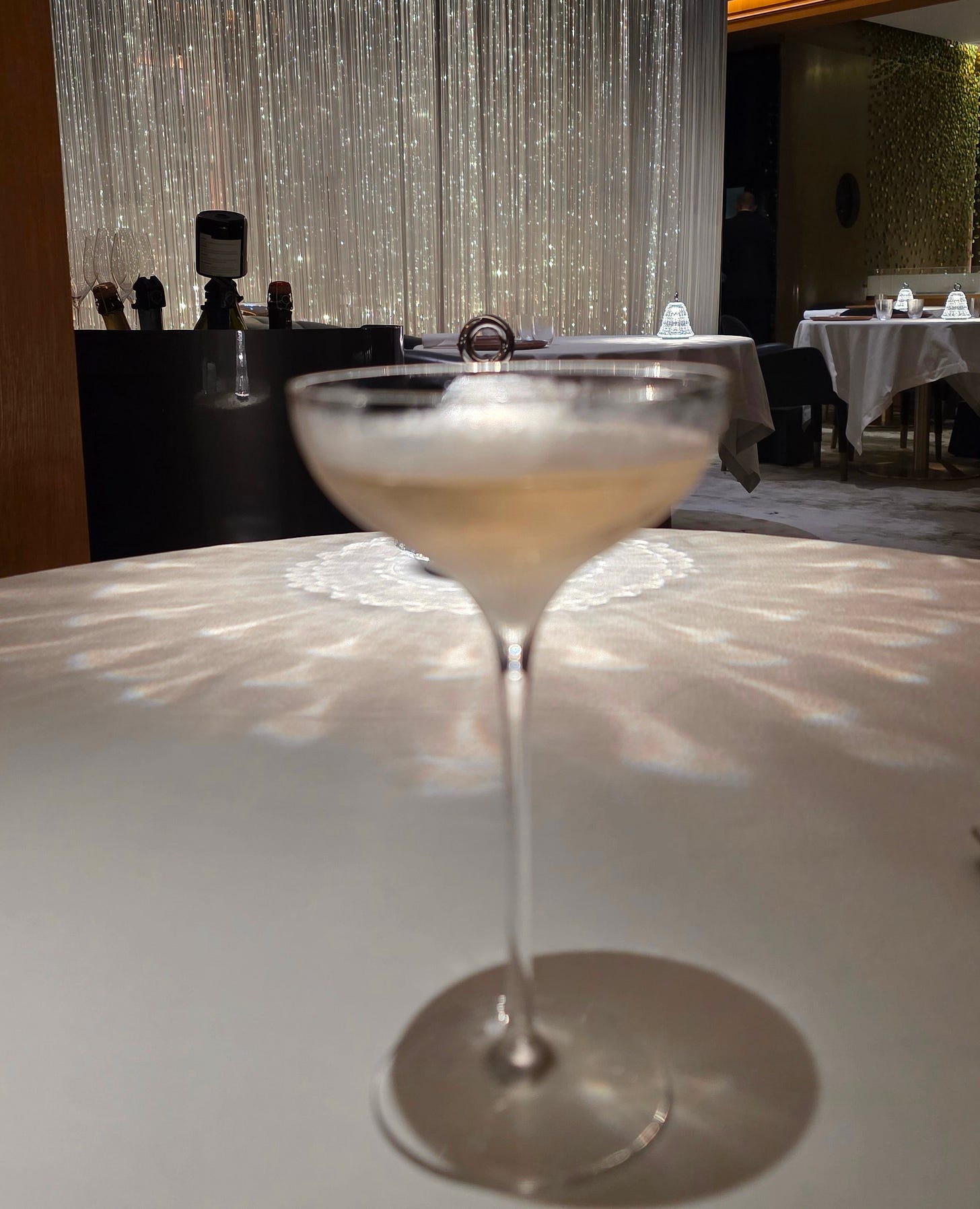 While I worked through the canapés, a server was assembling the final one tableside: two thin socca chickpea crisps (a nod, perhaps, to Blondet's native Nice, where socca is the quintessential street food) sandwiching a layer of caviar and crème fraîche, topped with Malaysian black pepper and Amalfi lemon zest. Crisp, light, zesty, creamy. I wished I had a few more of these.