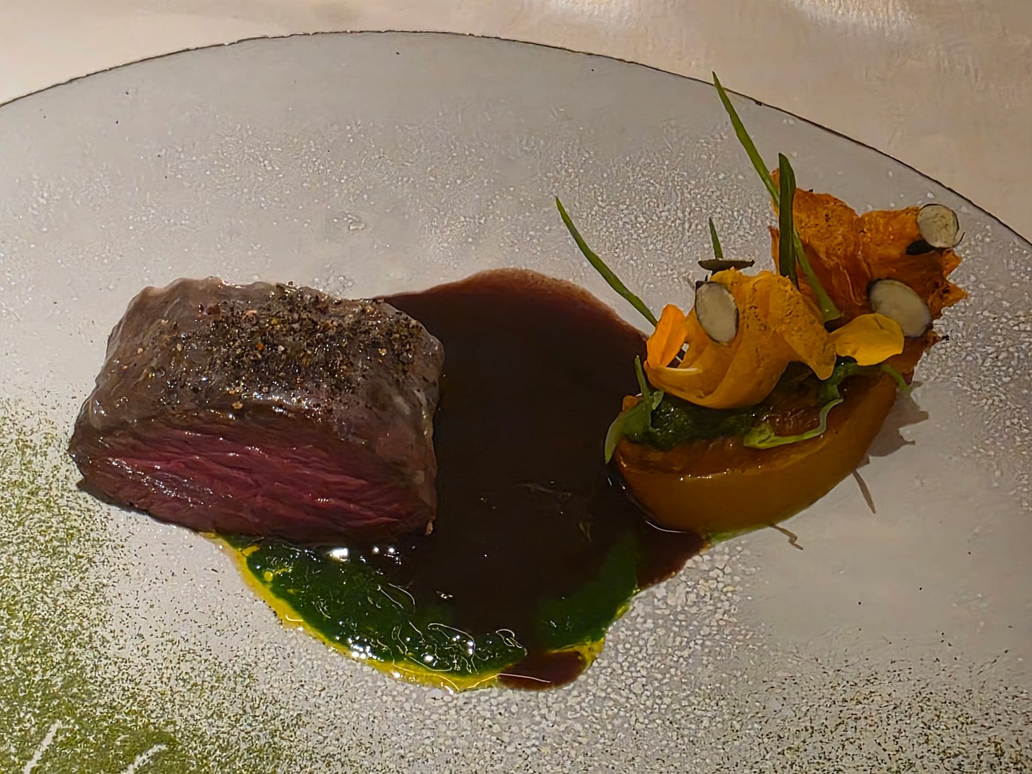 Venison saddle appeared in two preparations. The first: the loin, paired with butternut squash, juniper powder, and a herbal sauce enriched with a dark jus.