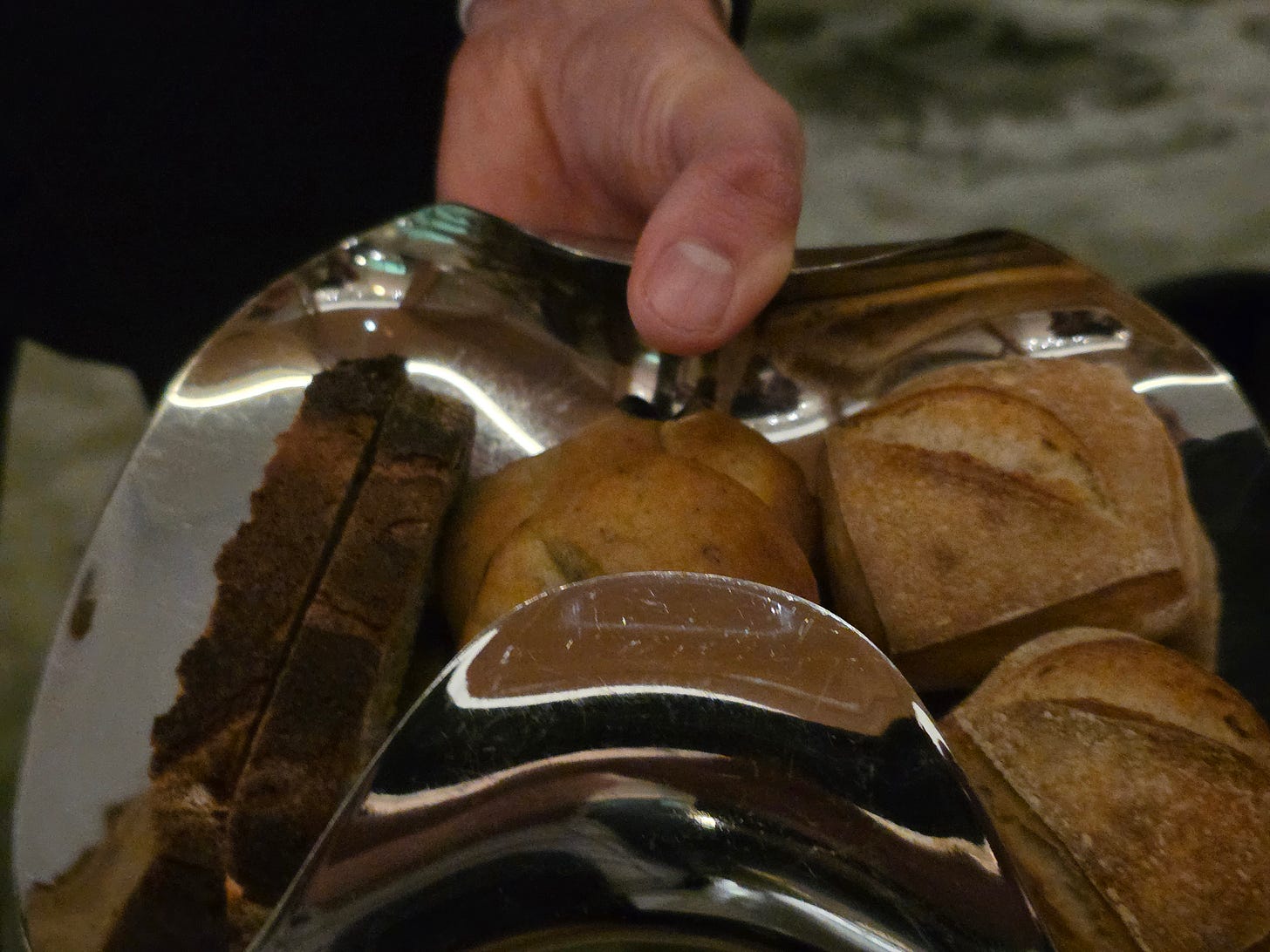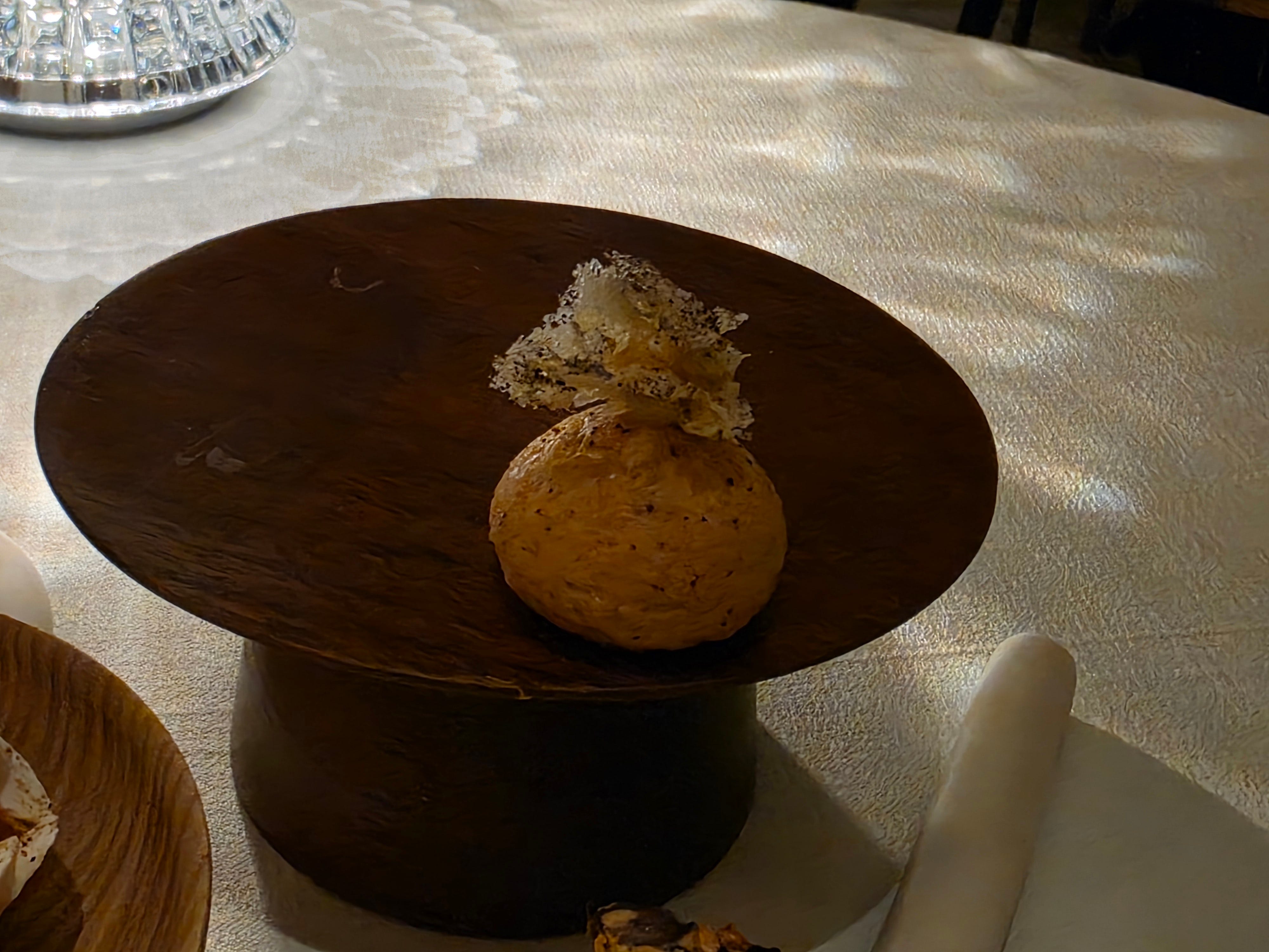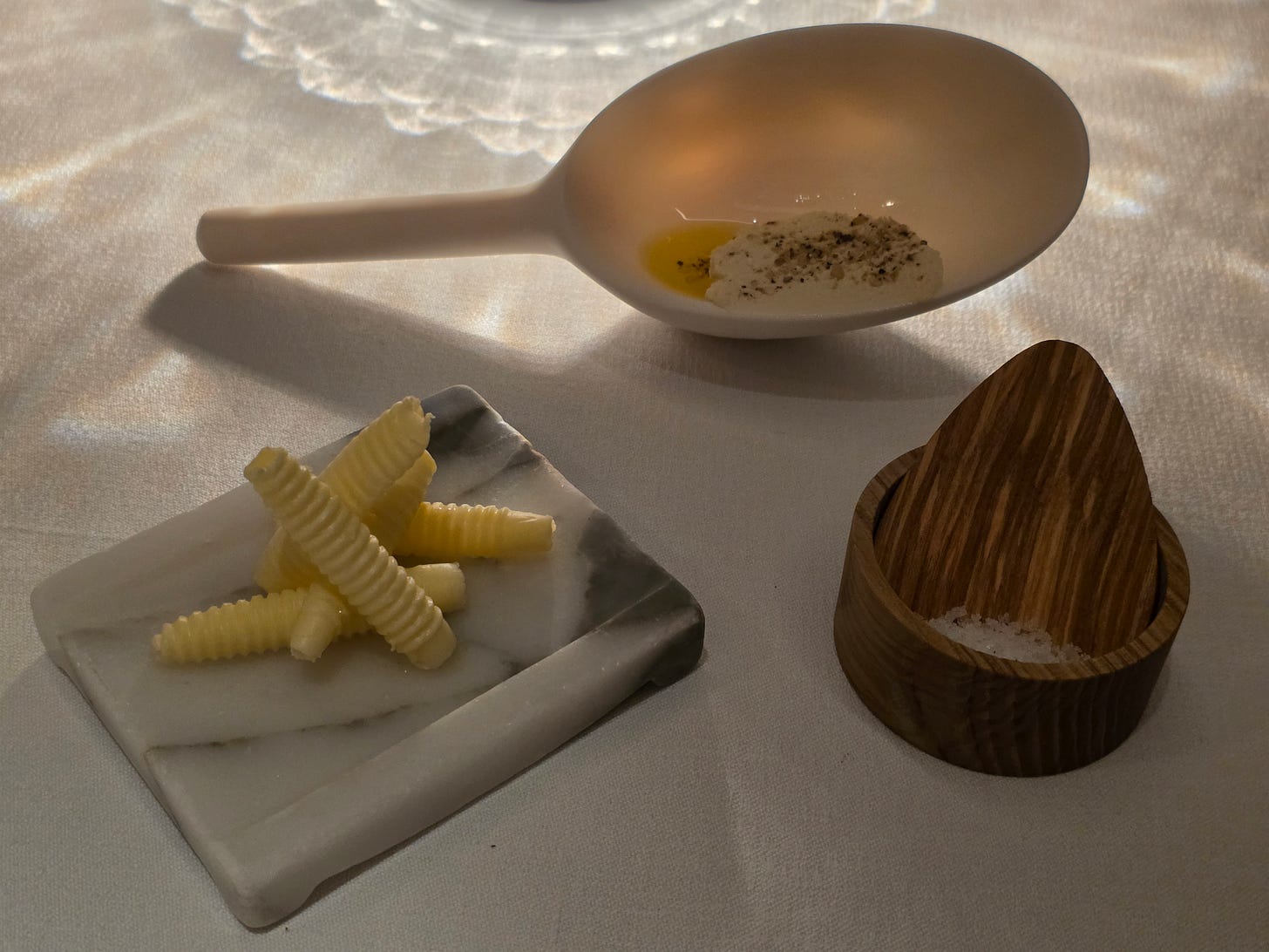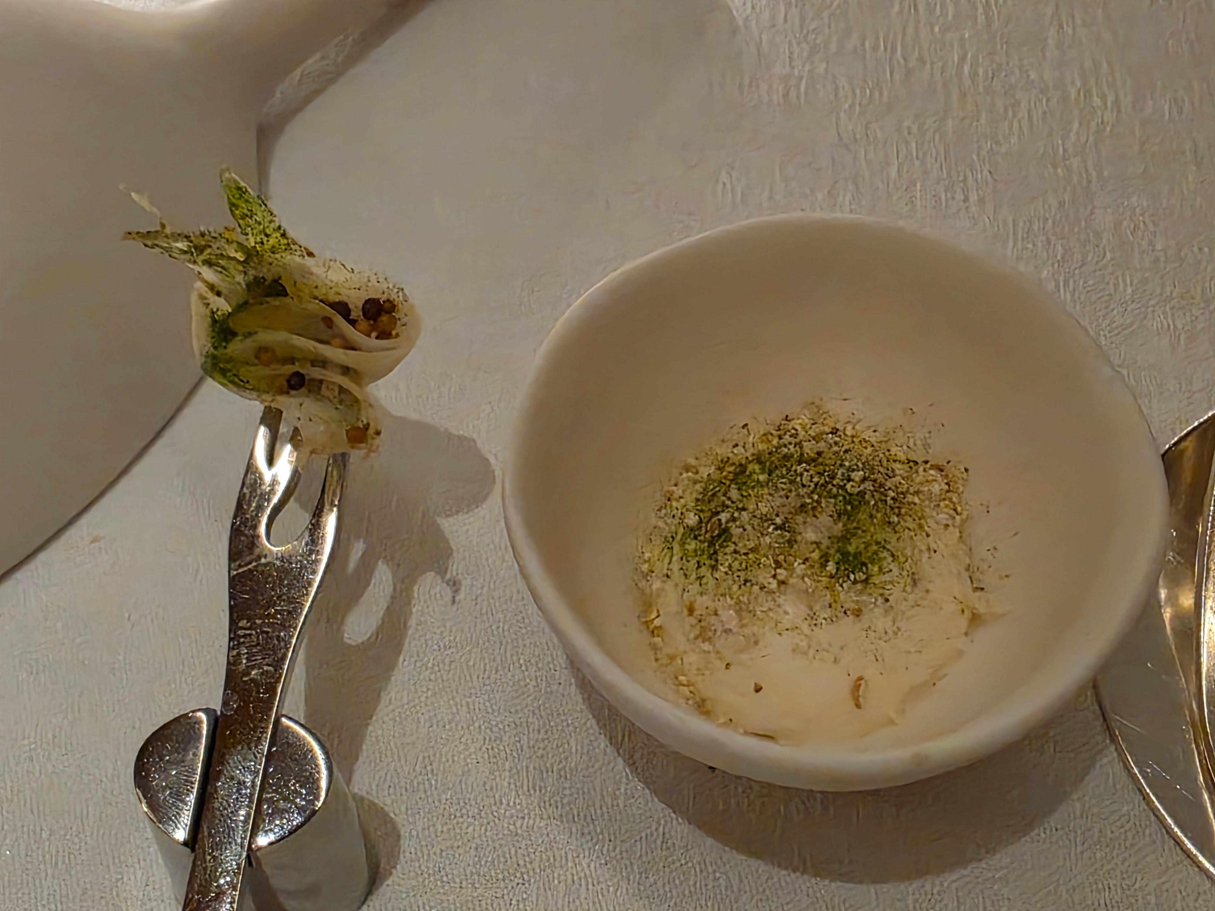 The bread course offered rye, focaccia, and white loaf, plus a signature pork lardon milk bread. I went with the signature, naturally. It came with curls of French butter and, taking a cue from Amber, a foamed soy milk with salt, olive oil, pepper, and buckwheat as a dairy-free alternative. The soy foam didn't do much for me; I stuck with the butter.