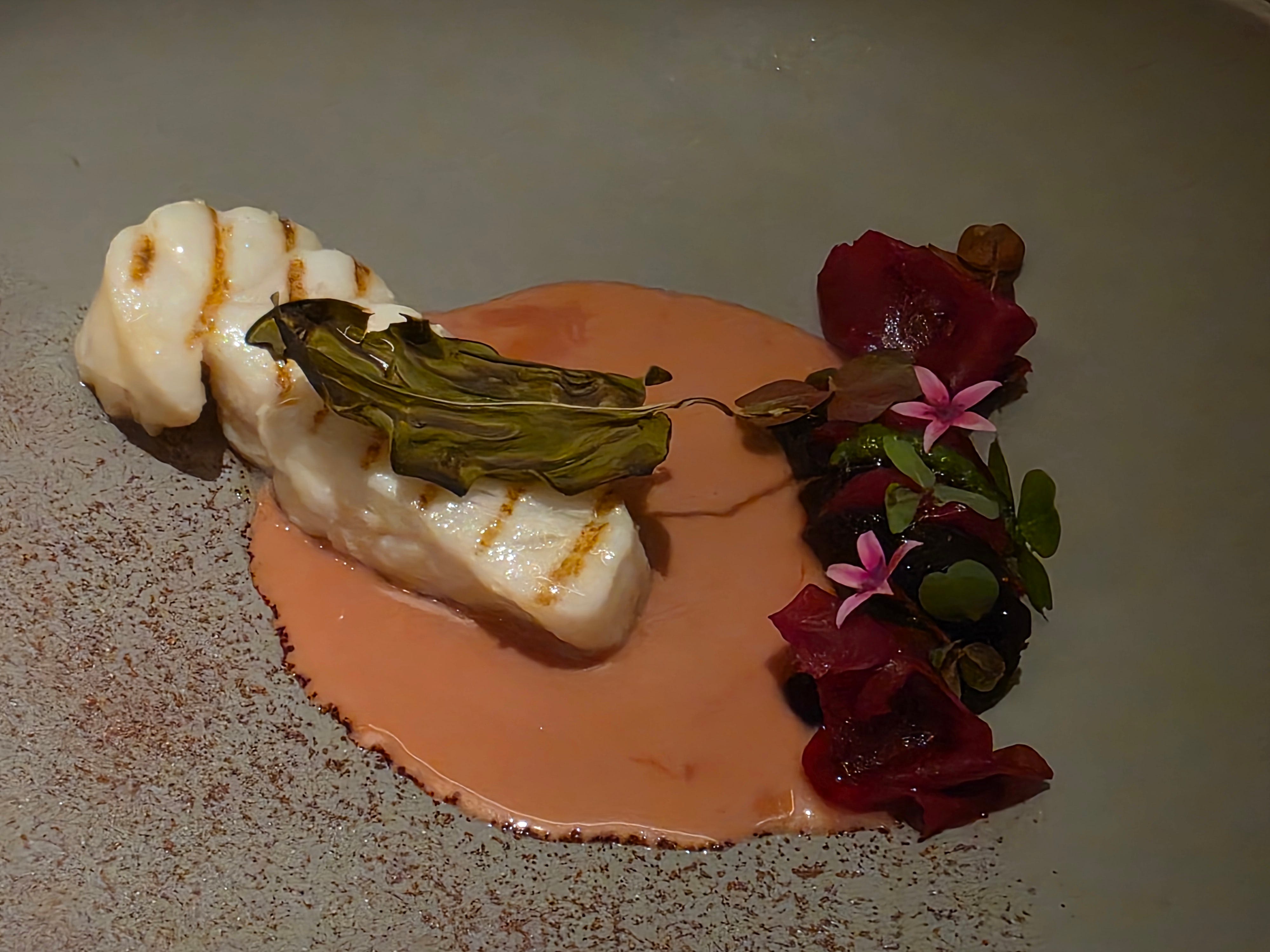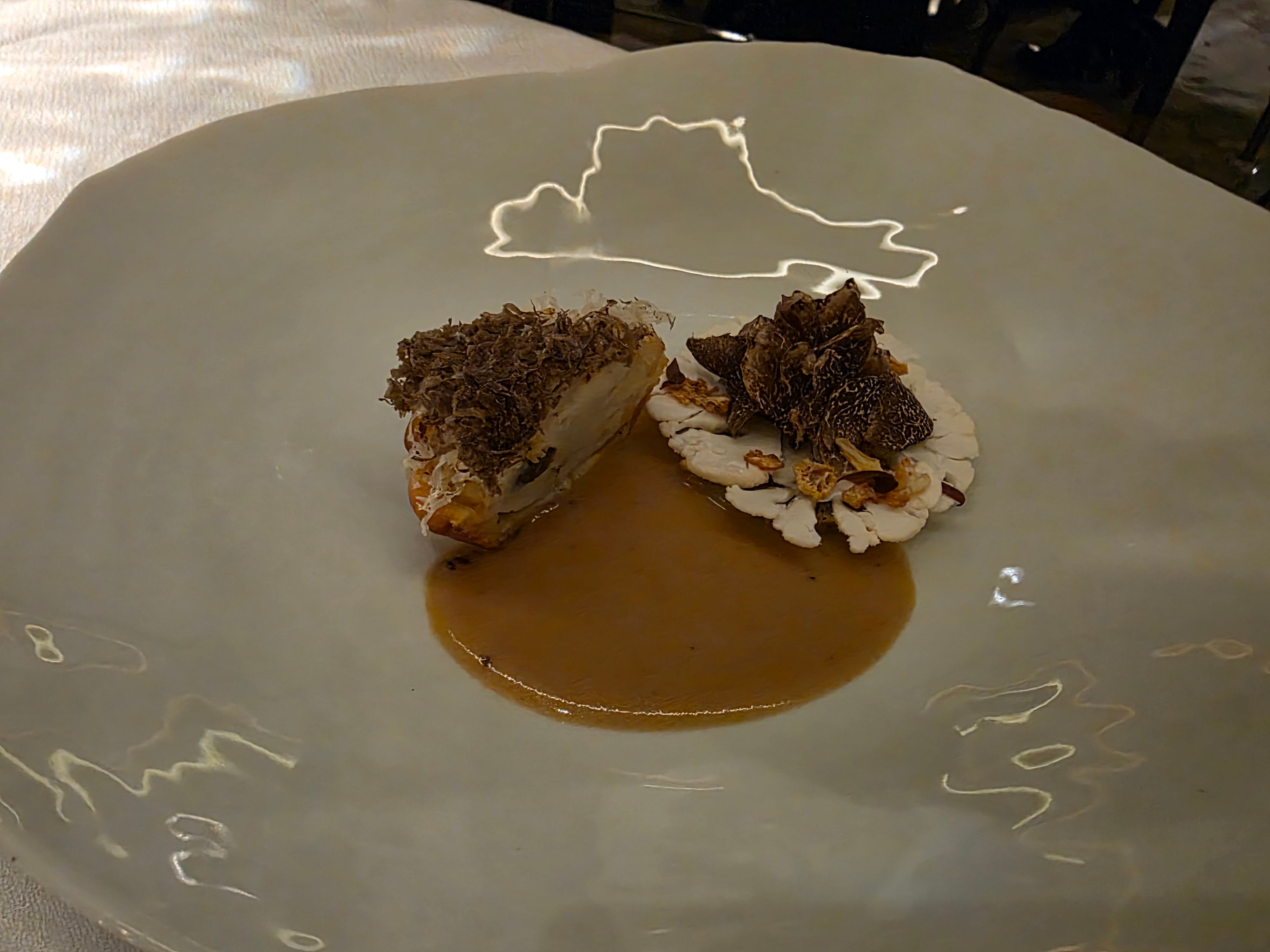 Then, cauliflower slow-cooked in milk, presented in a tart with a caramelised cauliflower sauce, flanked by raw slices of cauliflower and truffle in a cauliflower purée. Light and earthy in the first expression; richer, more layered in the second.