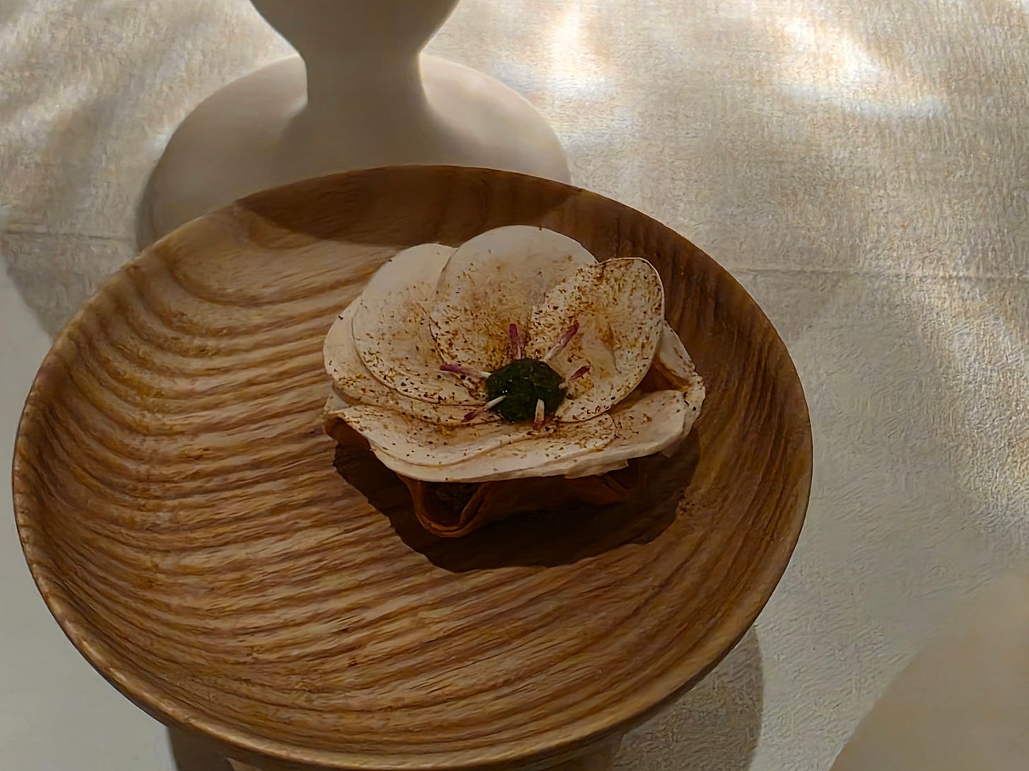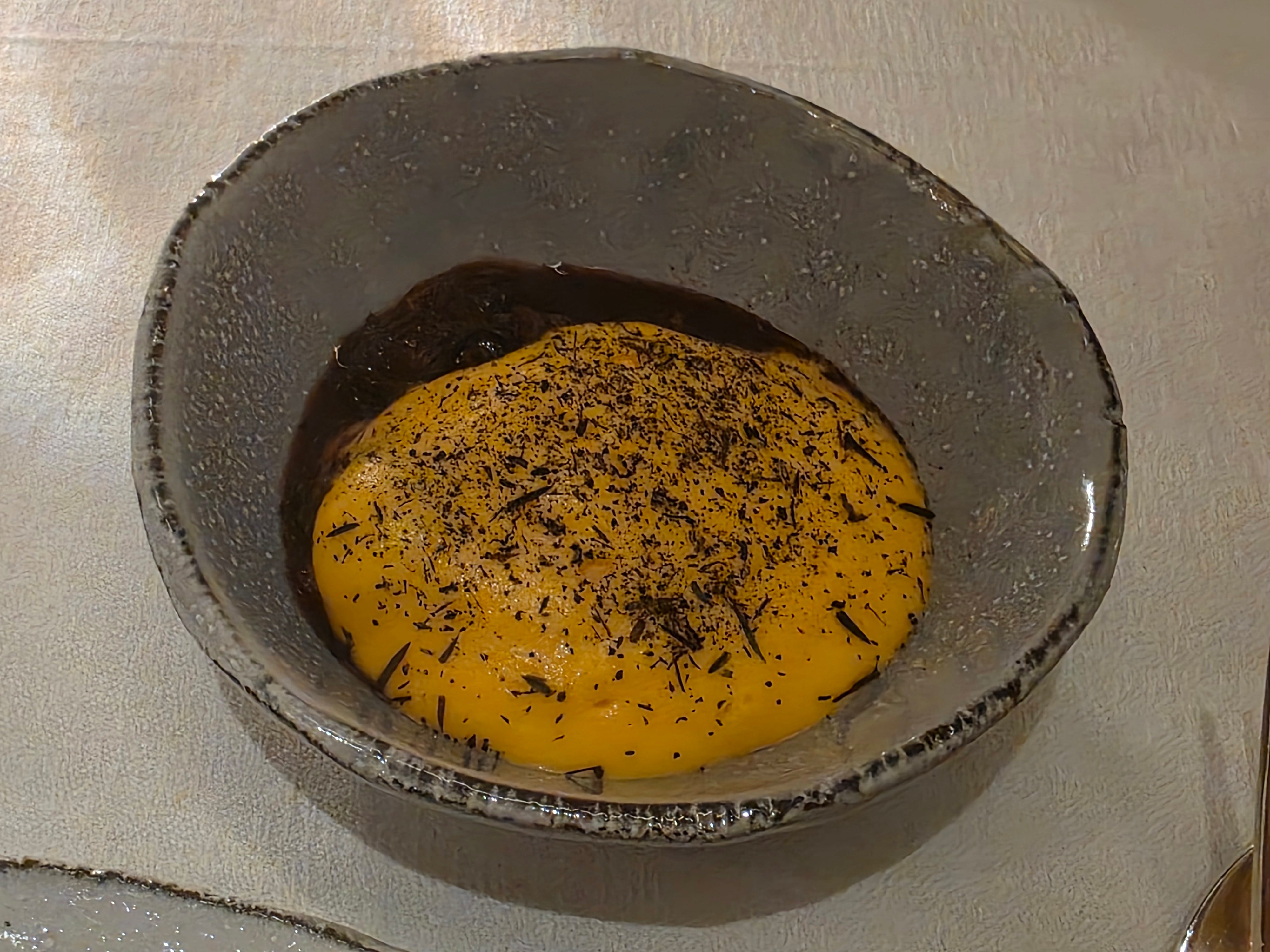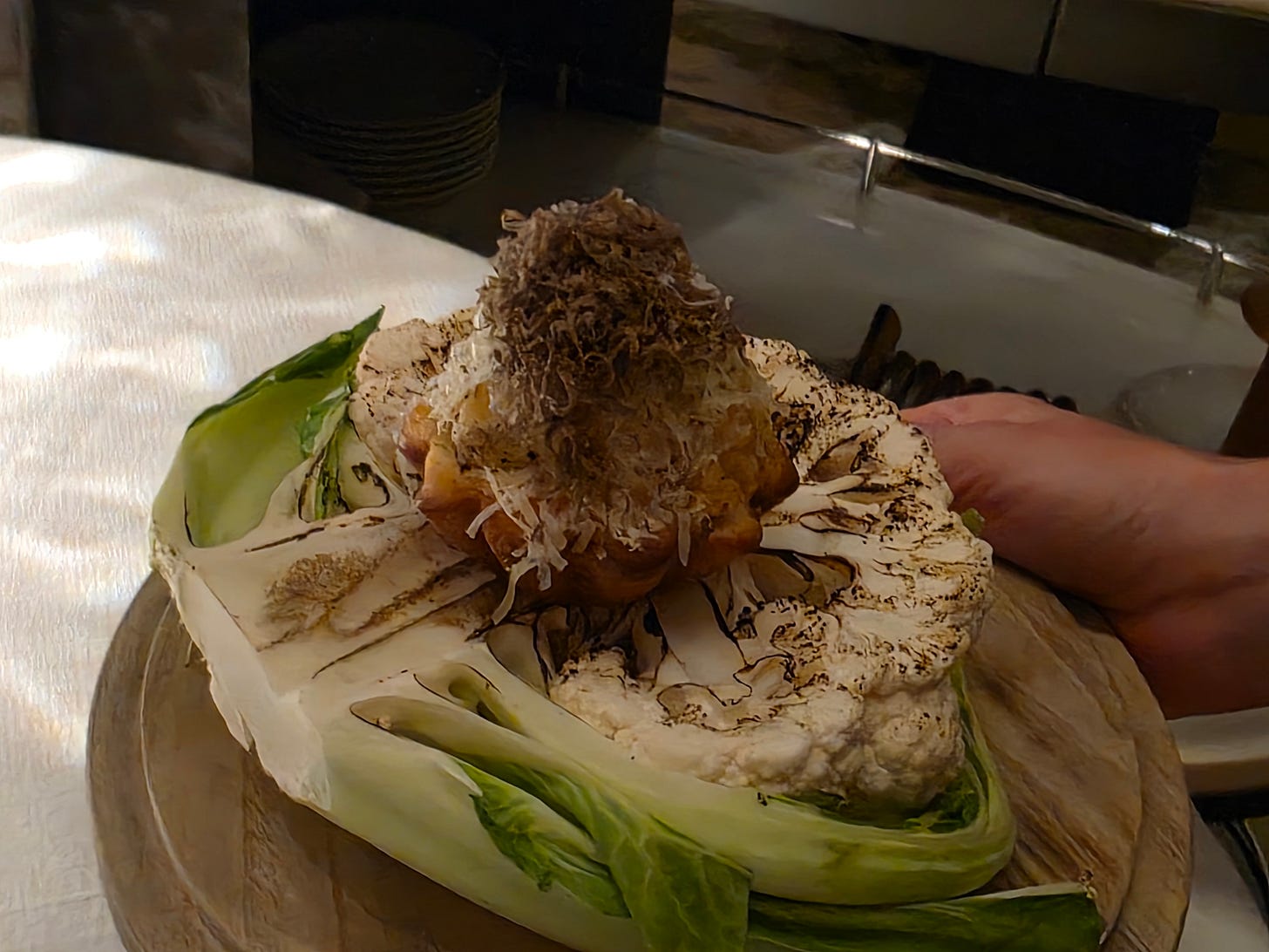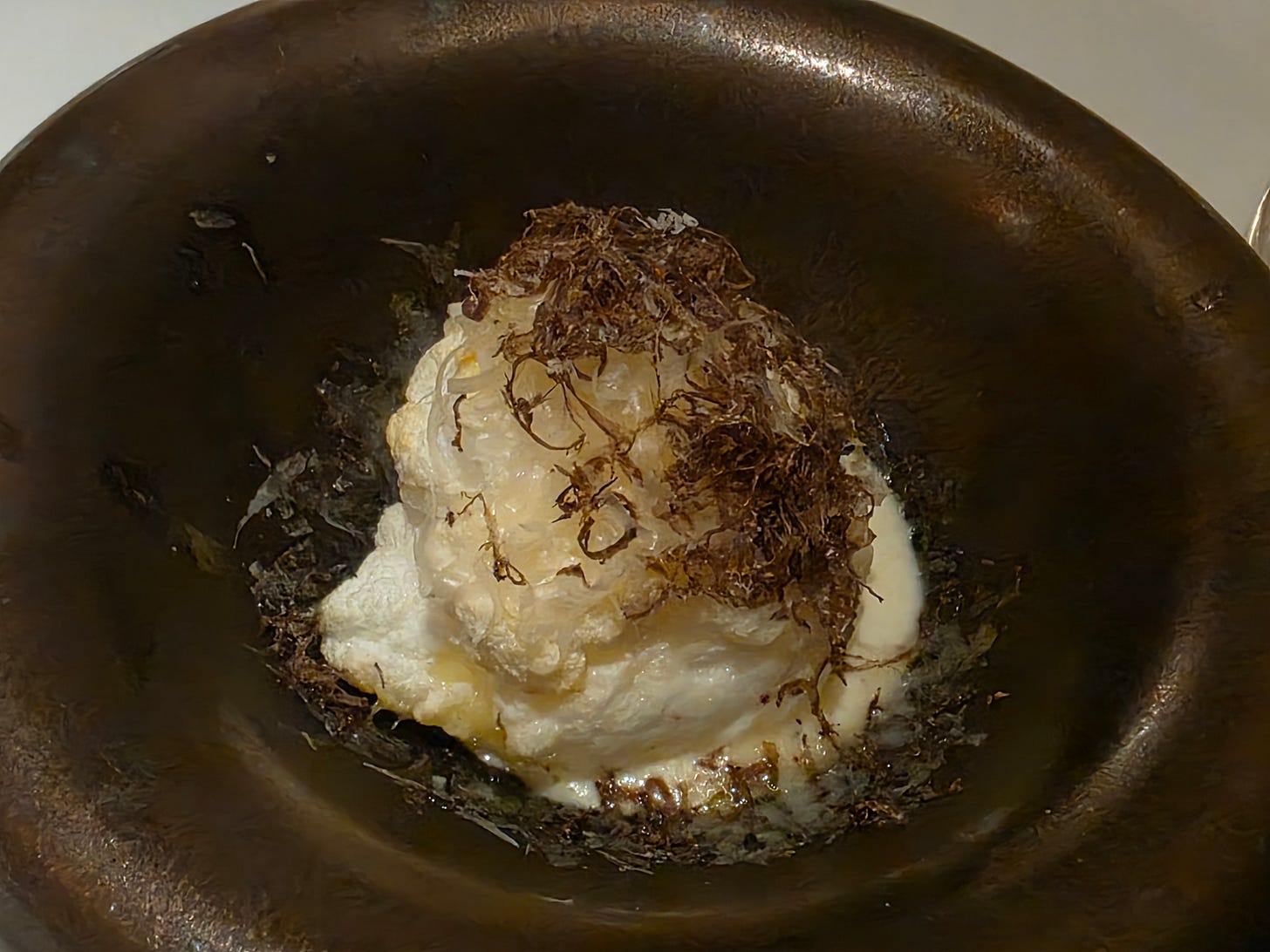 The following course came in two parts, both exploring cauliflower from every angle. First, a cauliflower soufflé, airy and golden, topped with a cauliflower velouté and shaved truffle.