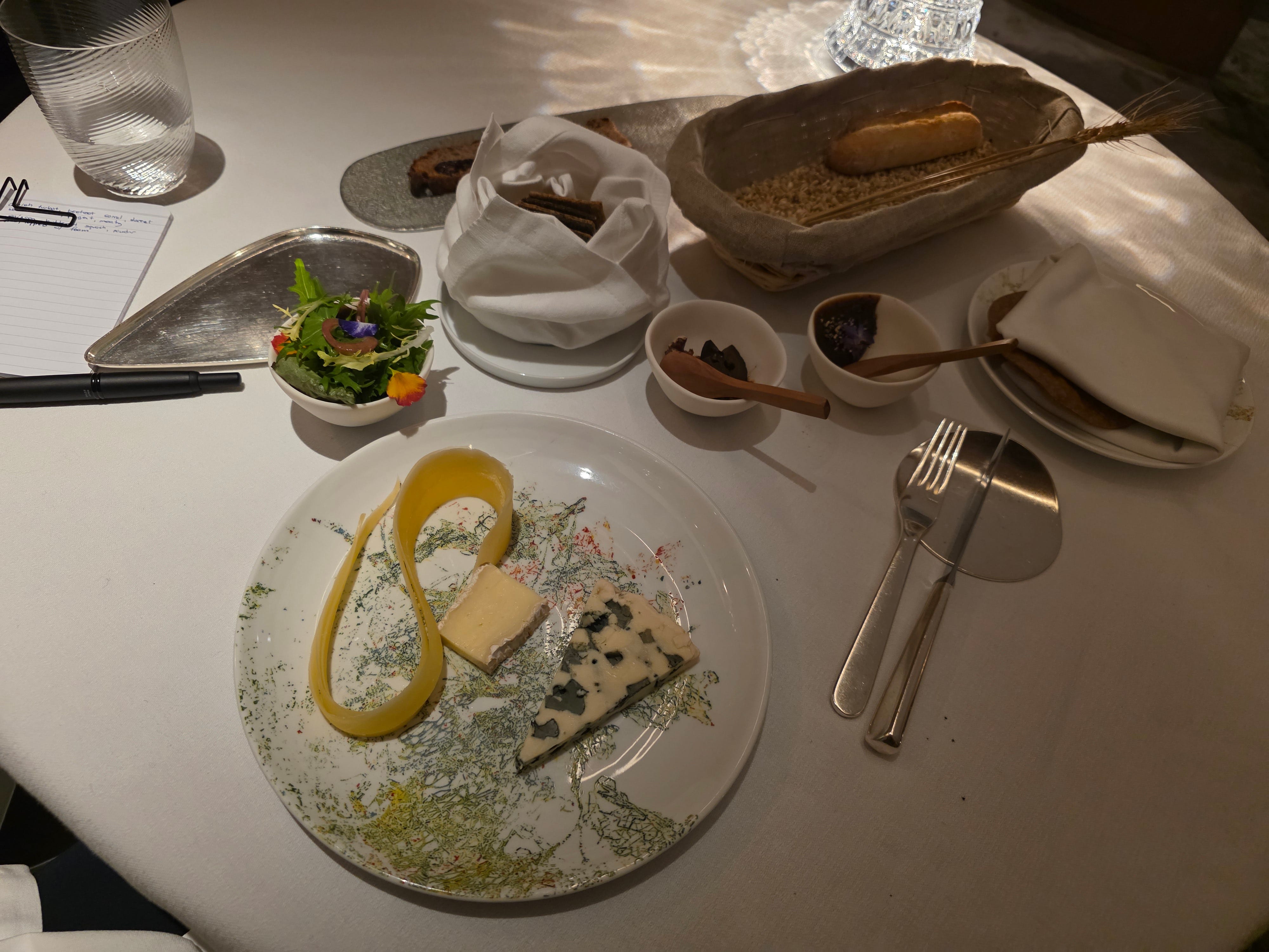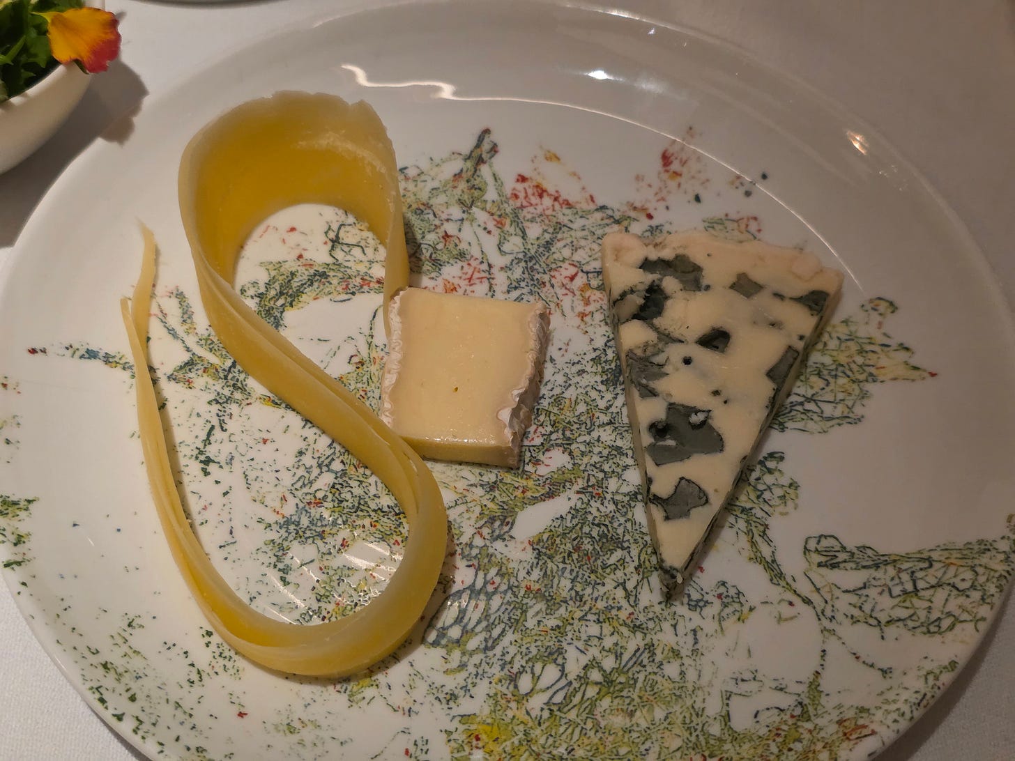 The cheese course arrived with a generous spread of accompaniments. Jet lag was hitting hard by this point, but three selections kept me awake: a forty-month-aged Comté, a bold Roquefort, and a Bergamino di Capra. I usually skip the cheese course, so I am glad I was not given the option.