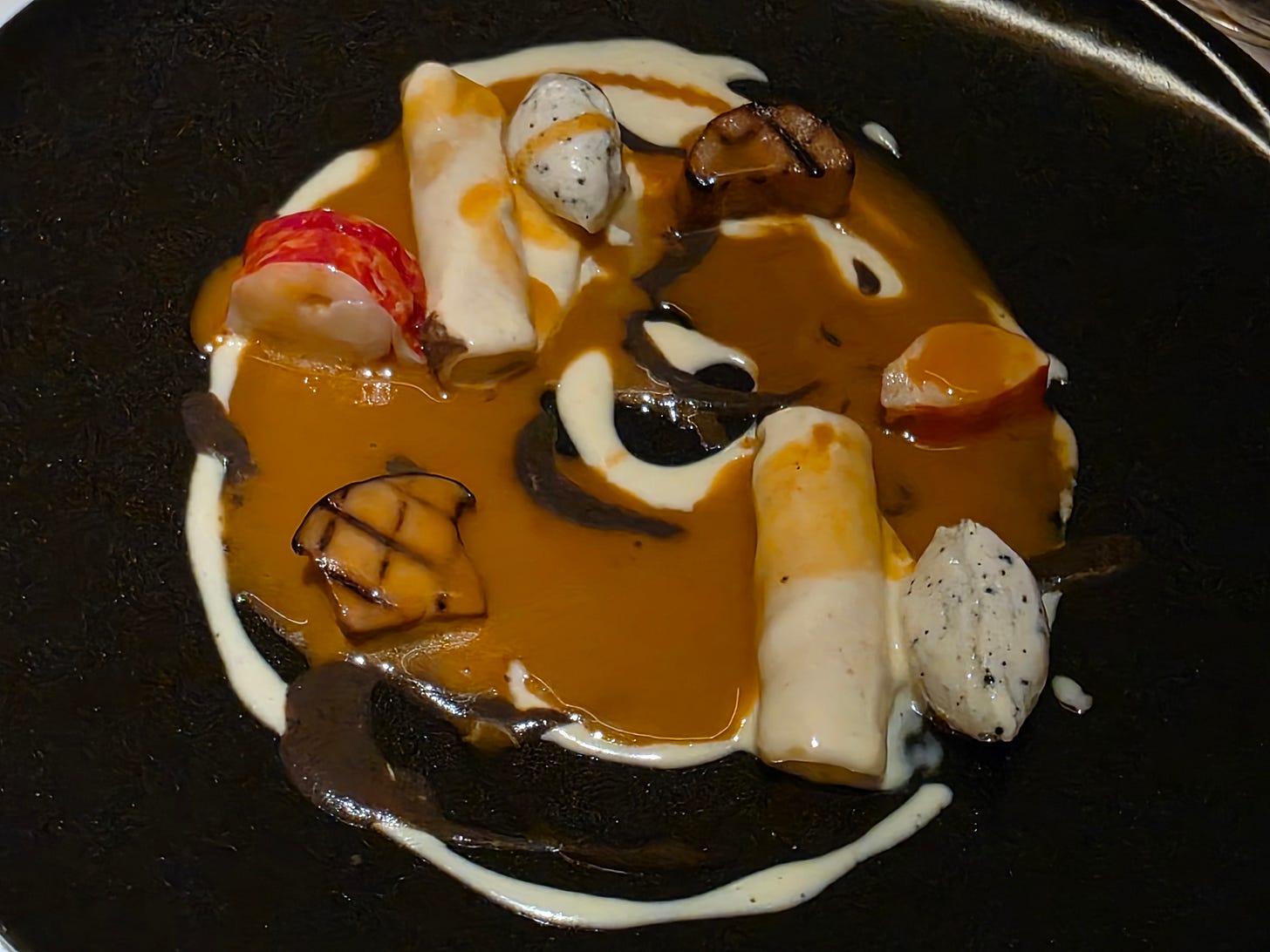Next, a signature that has been on the menu since the restaurant opened in 2007: lobster medallions with grilled mushrooms, chicken quenelle mousse with Périgord truffle, all bound together in a lobster bisque sauce over homemade semolina pasta.