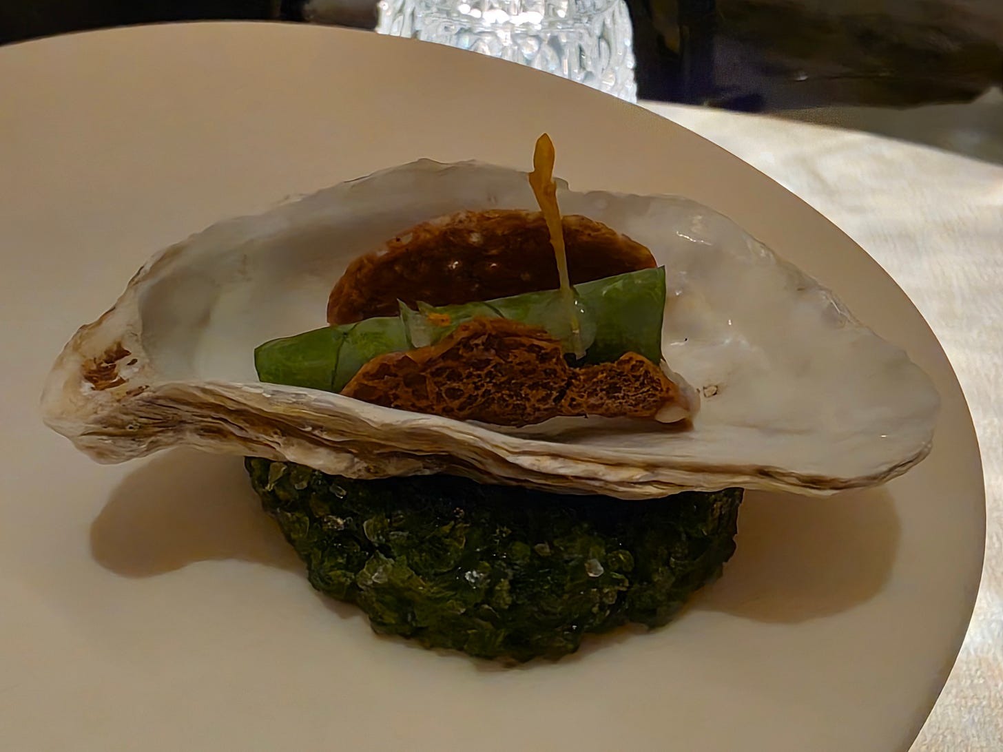 A poached oyster wrapped in a leaf came alongside a buckwheat cracker.