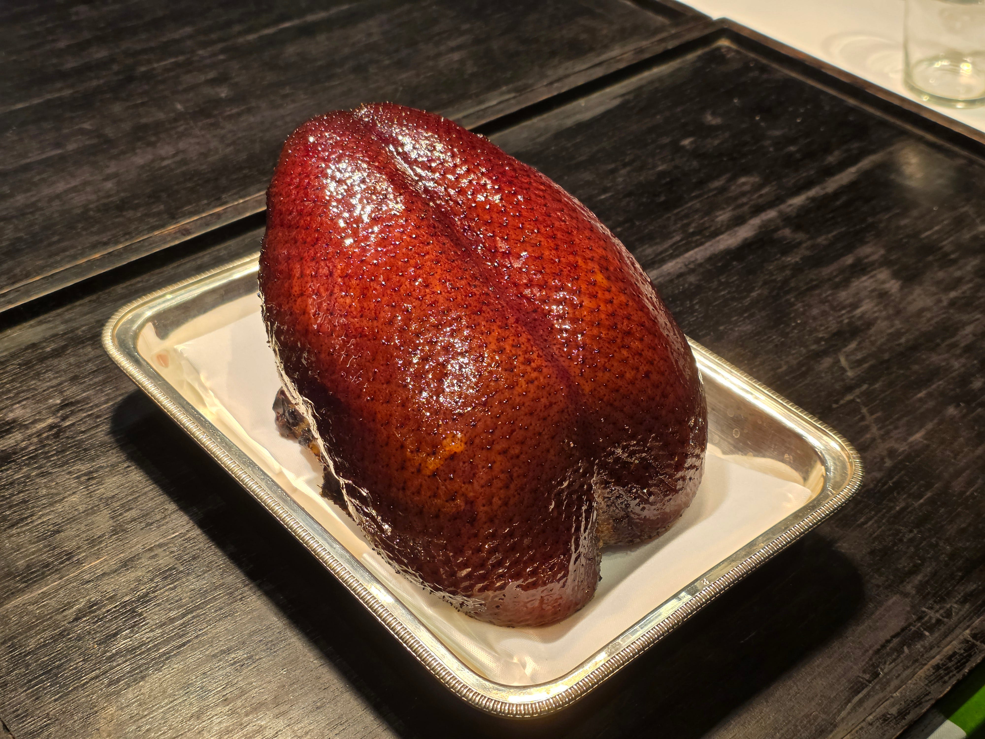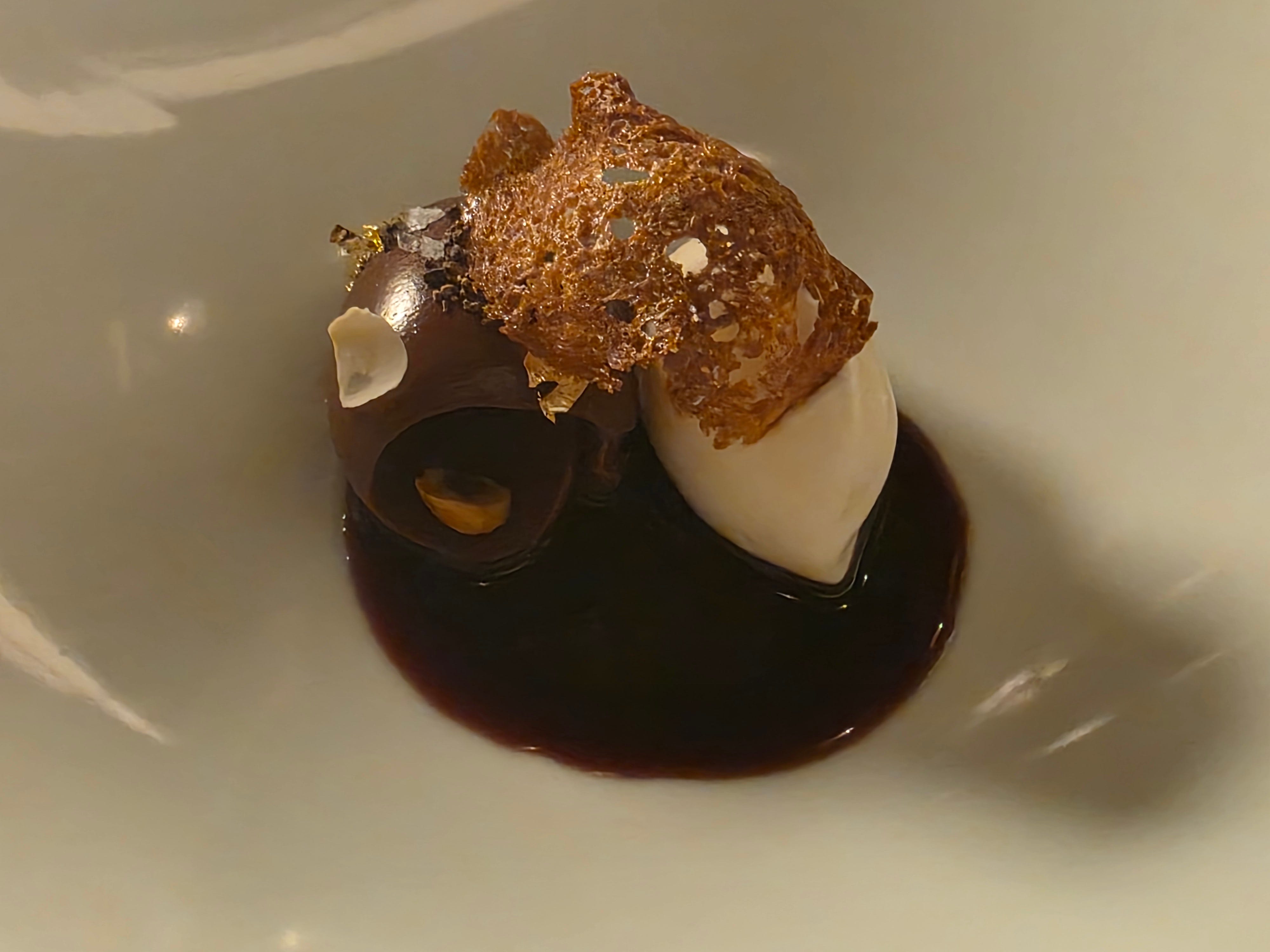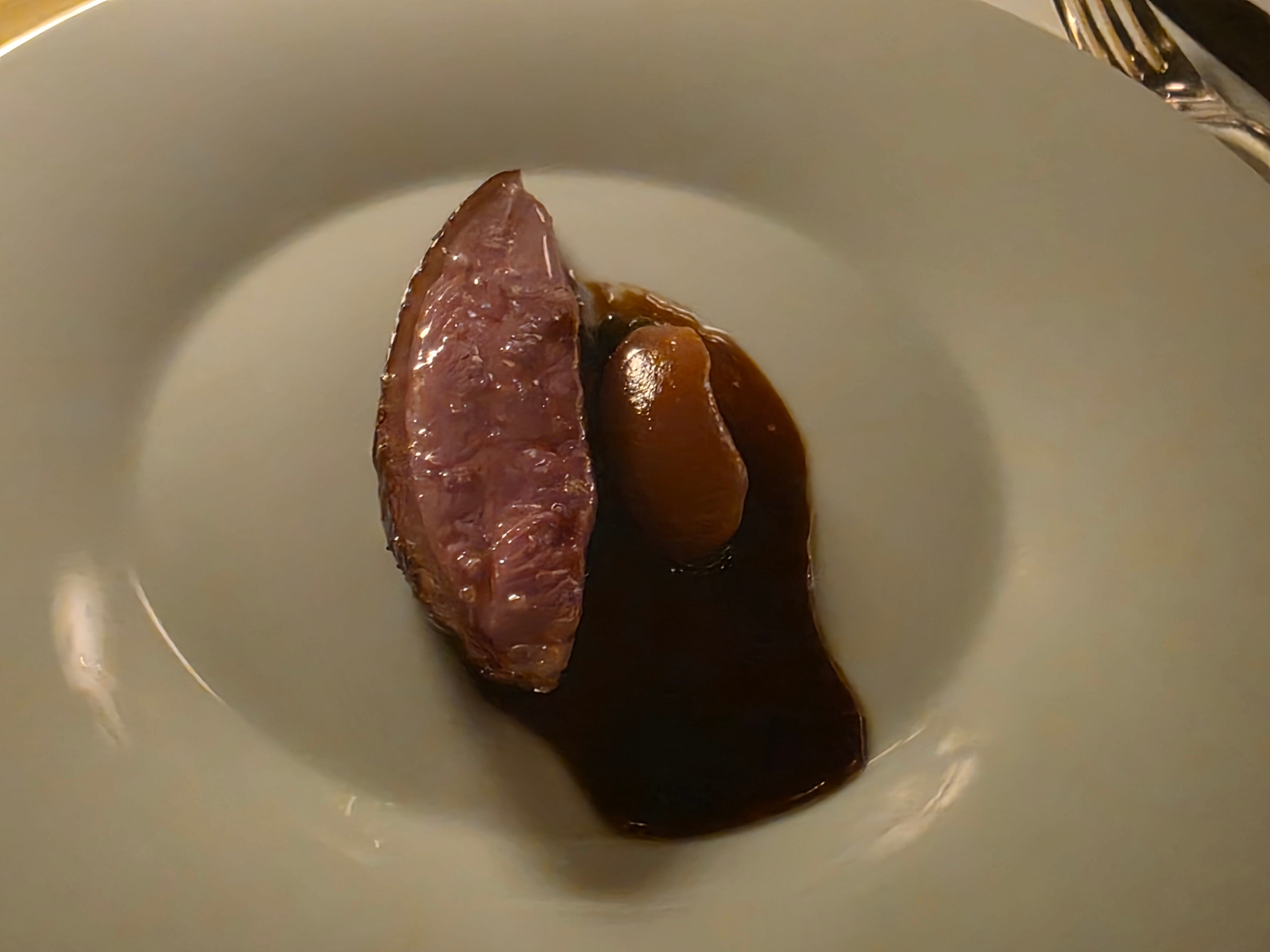 He explained that the duck breast course drew on his memories of Peking duck: the skin treated with a vinegar and sugar mixture, briefly smoked, then roasted to a fierce crispness, served with a quince and duck jus. It didn't have the papery delicacy of a traditional Peking preparation, but the skin was extraordinary, shattering on contact, and deeply flavourful.