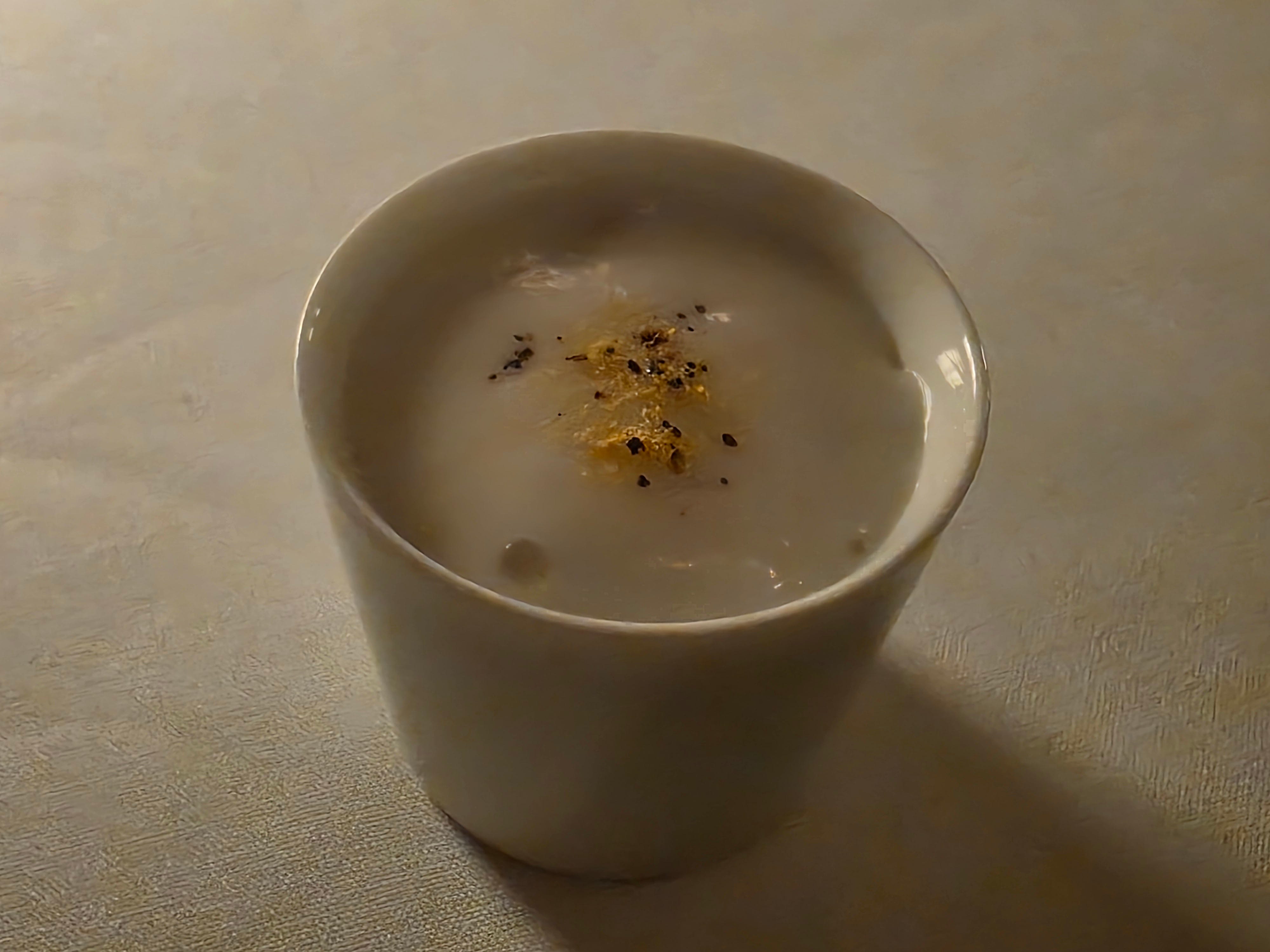 Midway through the meal, I was invited into the kitchen for a brief conversation with Chef Dilling. The space reminded me of the Connaught kitchen, and he confirmed without prompting that he had indeed worked there. We talked about The Greenhouse, which I'd visited before the pandemic, and about his travels through Southeast Asia, which had clearly left a mark.
