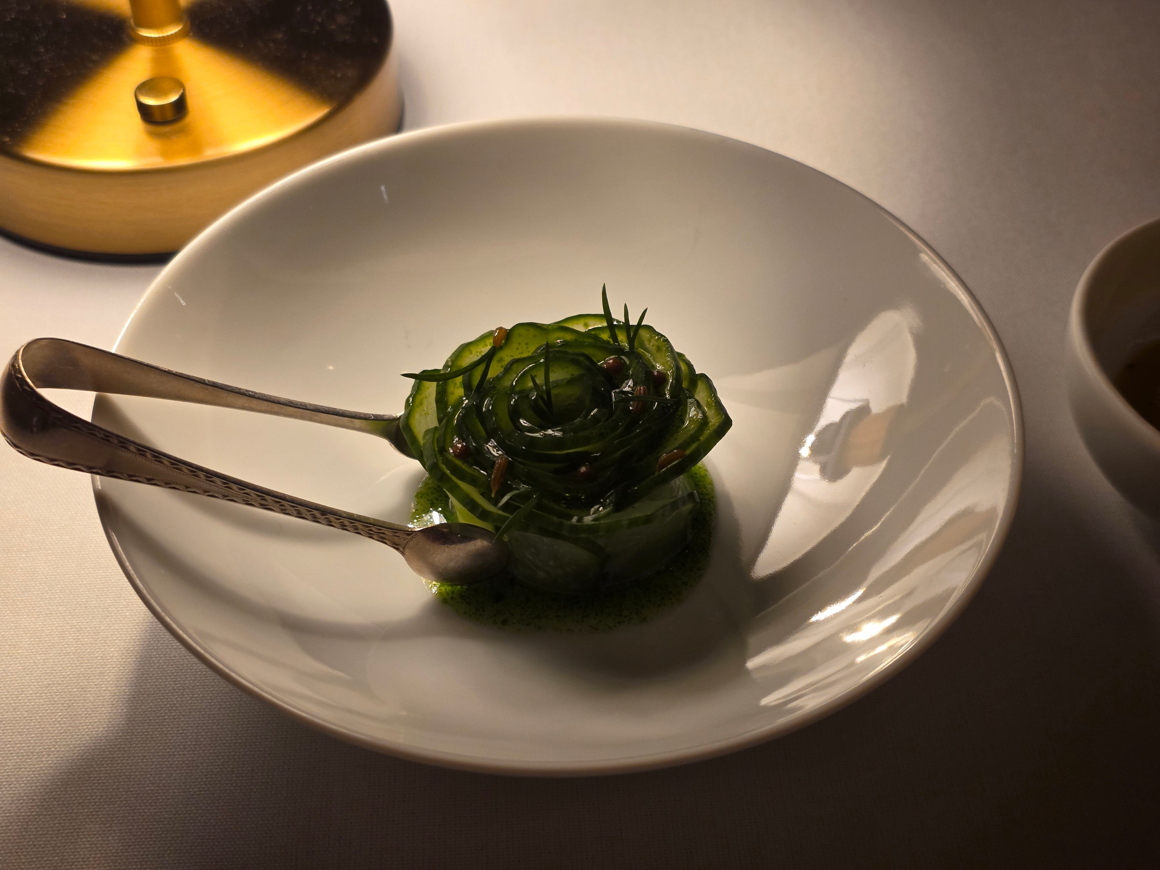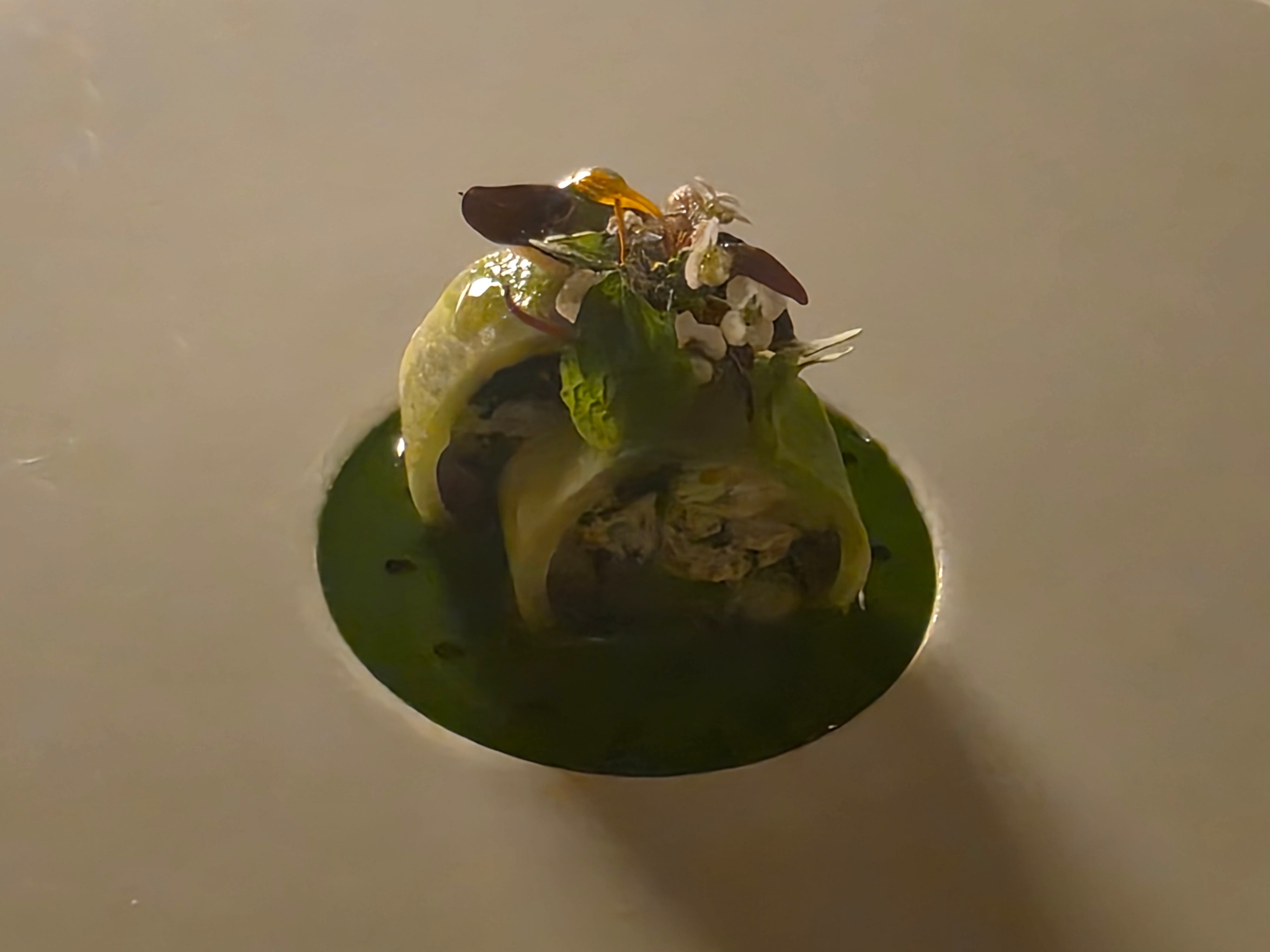 Next came a green sardine roll, wrapped in cucumber skin and served in a mint and coriander sauce. The inspiration was Vietnamese, and the effect was genuinely refreshing — herbal and clean, with the brightness of the sauce doing excellent work against the oiliness of the sardine. It called to mind a Vietnamese summer roll.