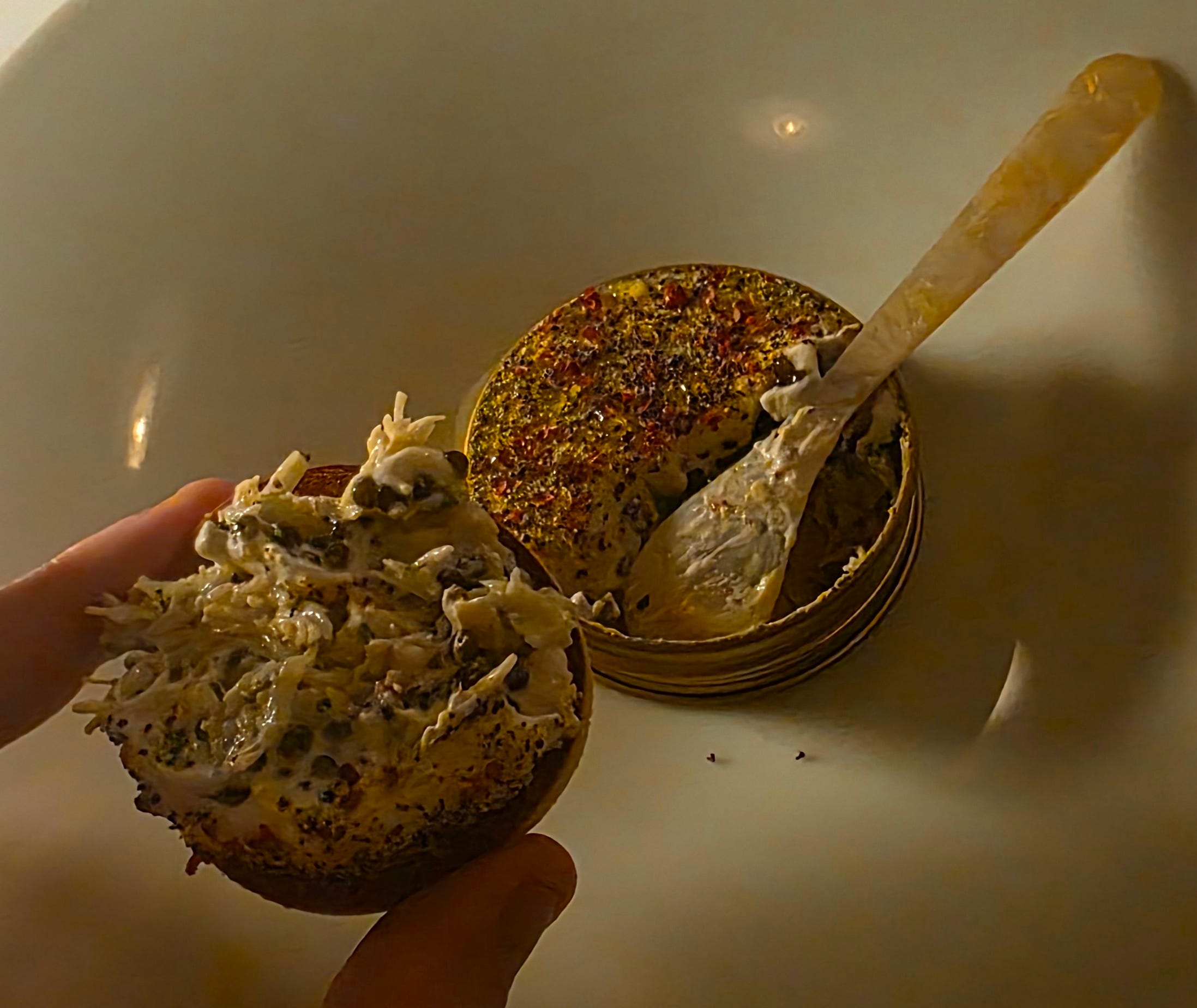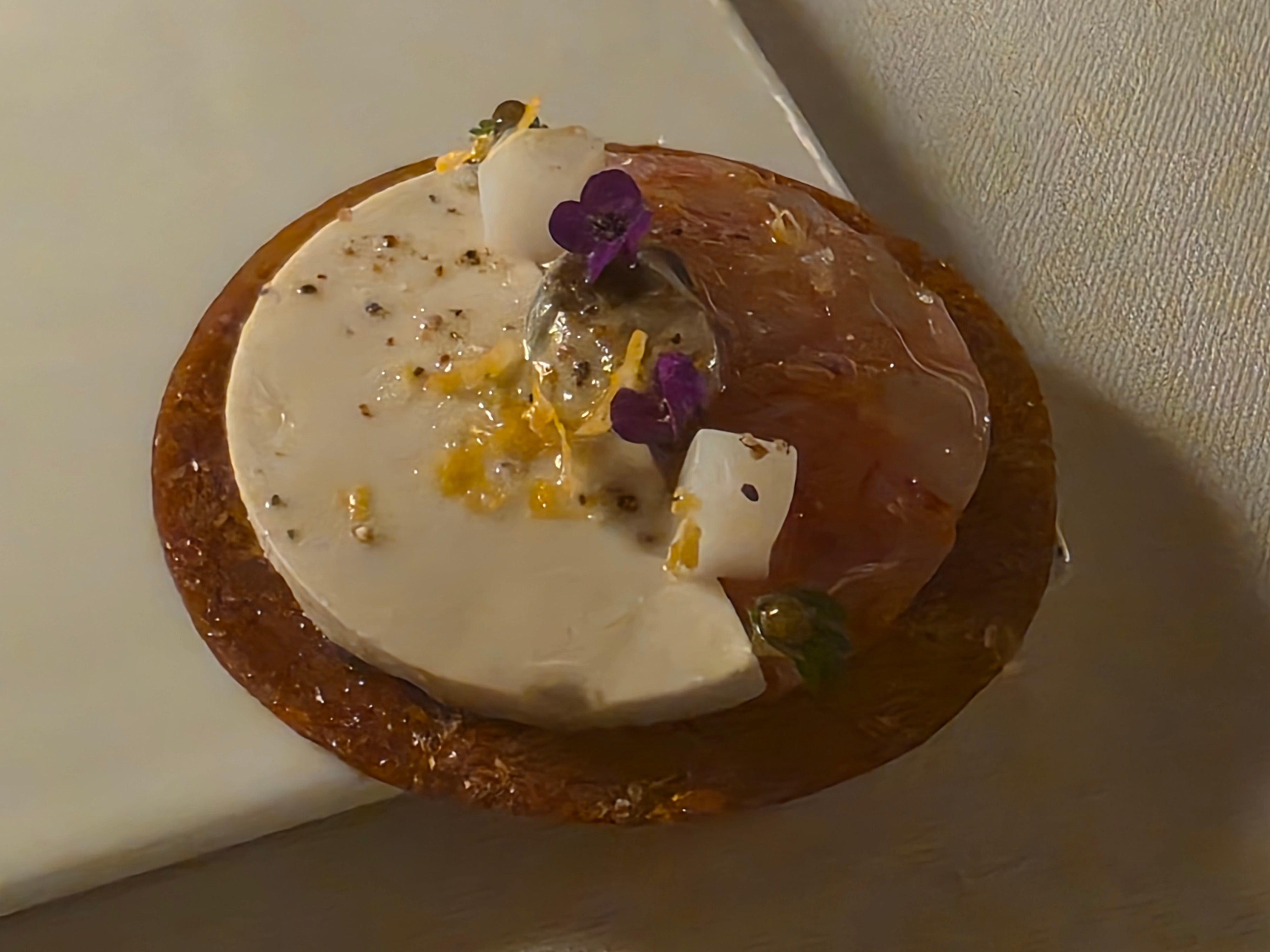 A crisp, paper-thin cracker followed, split between an oyster mousse and a shrimp tartare, offering mineral freshness and a pillowy richness in equal measure.