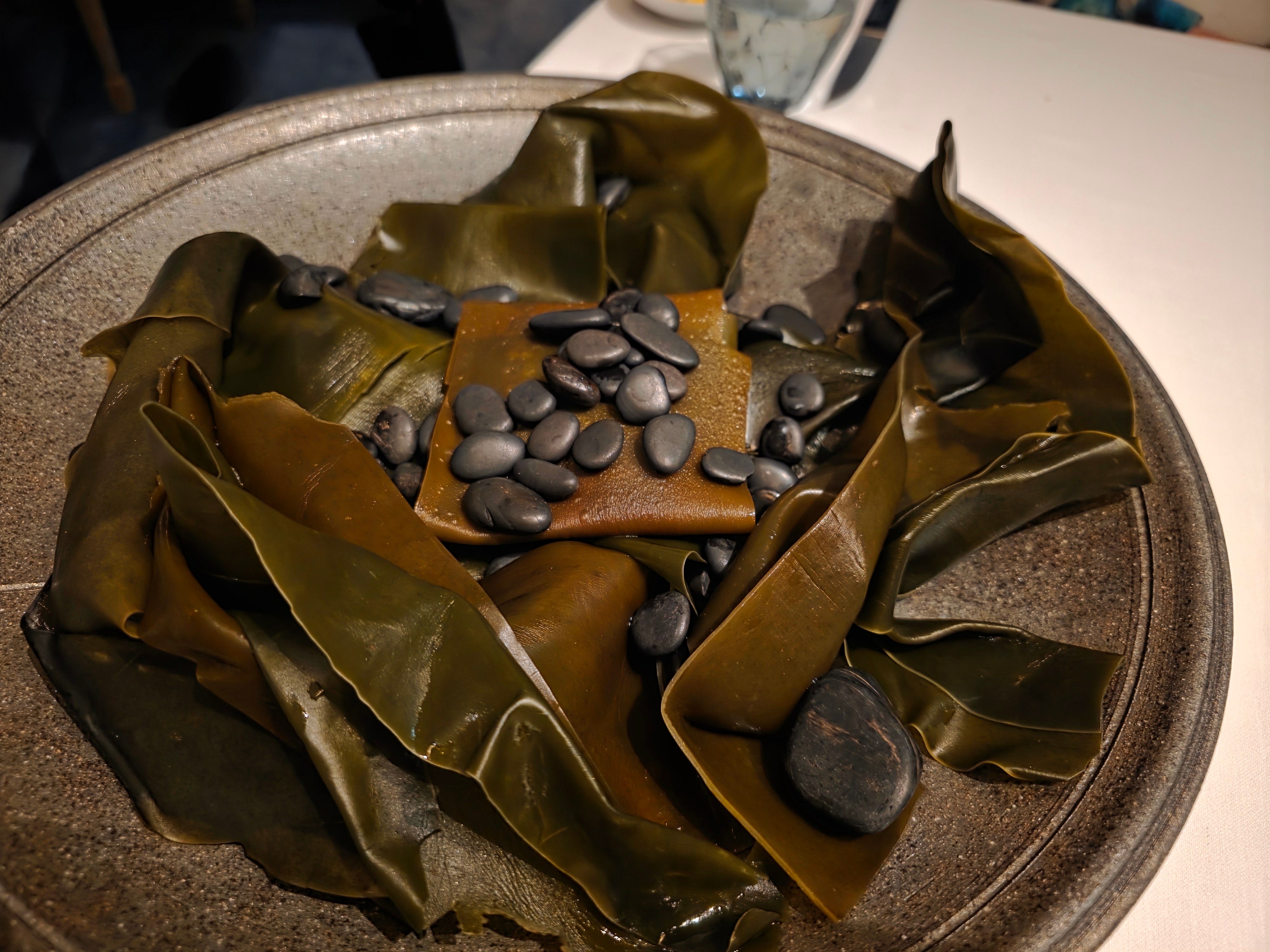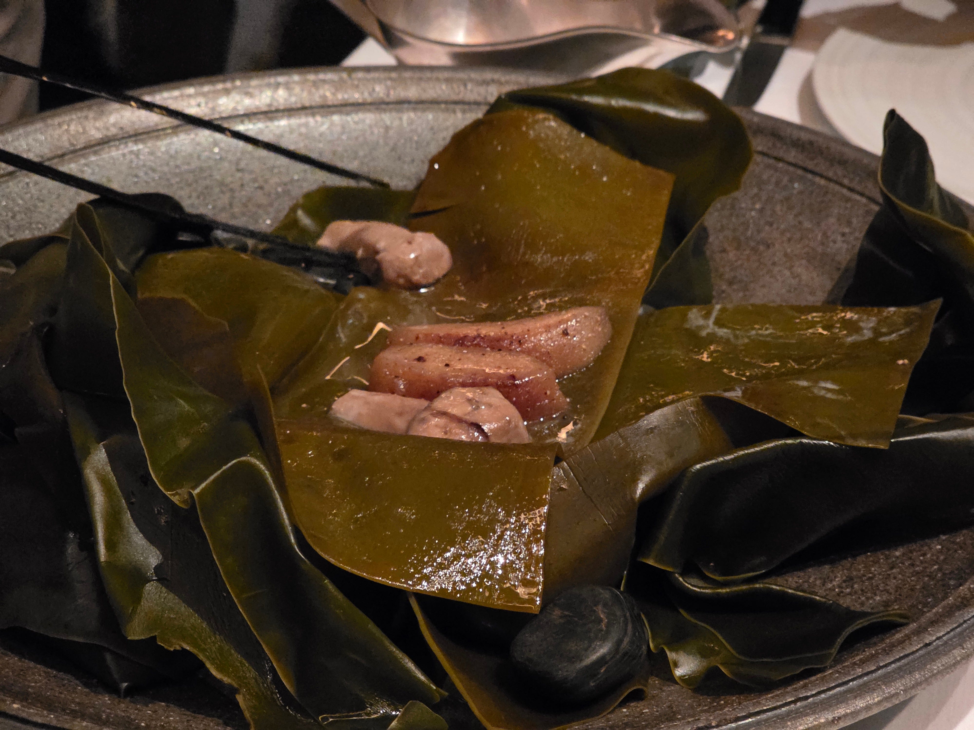 As we returned to our table, we found a large package wrapped in kombu. Unwrapped, we found some Japanese pear and matsutake mushrooms braised within the kombu. These were the accompaniment to our next dish.