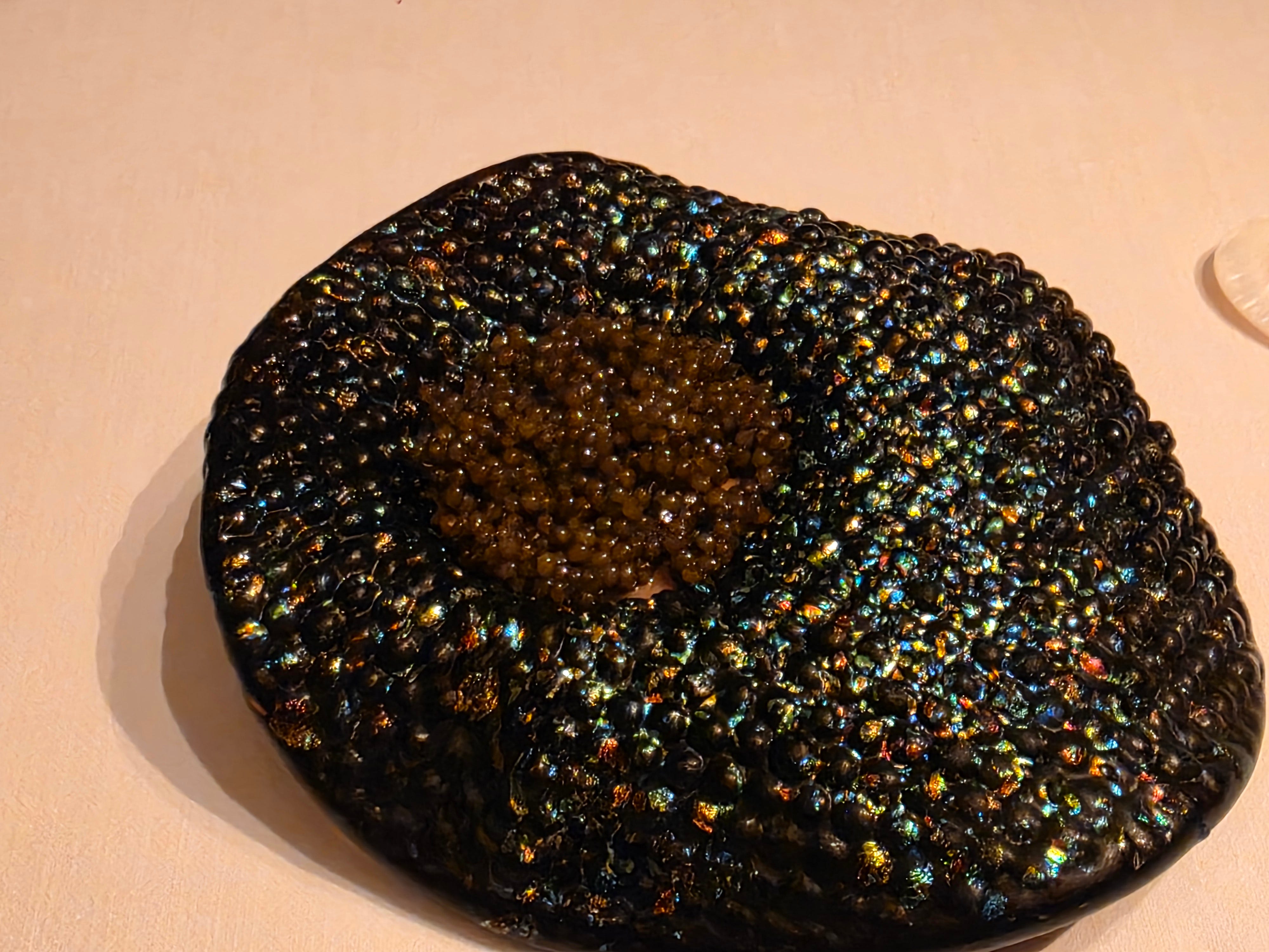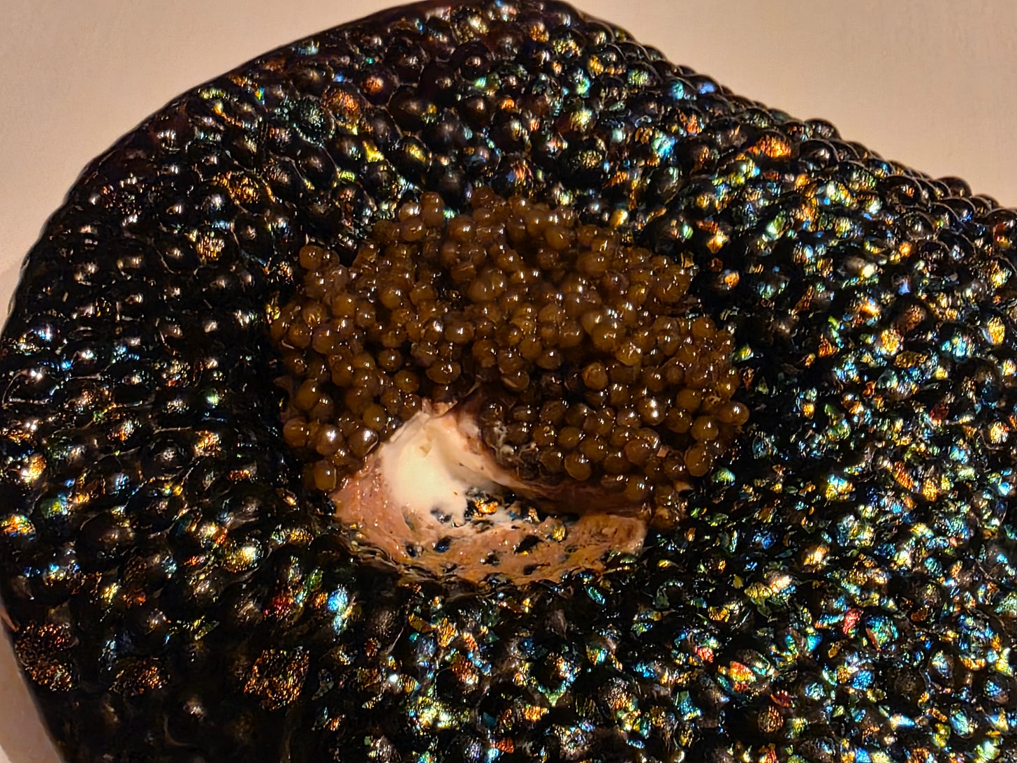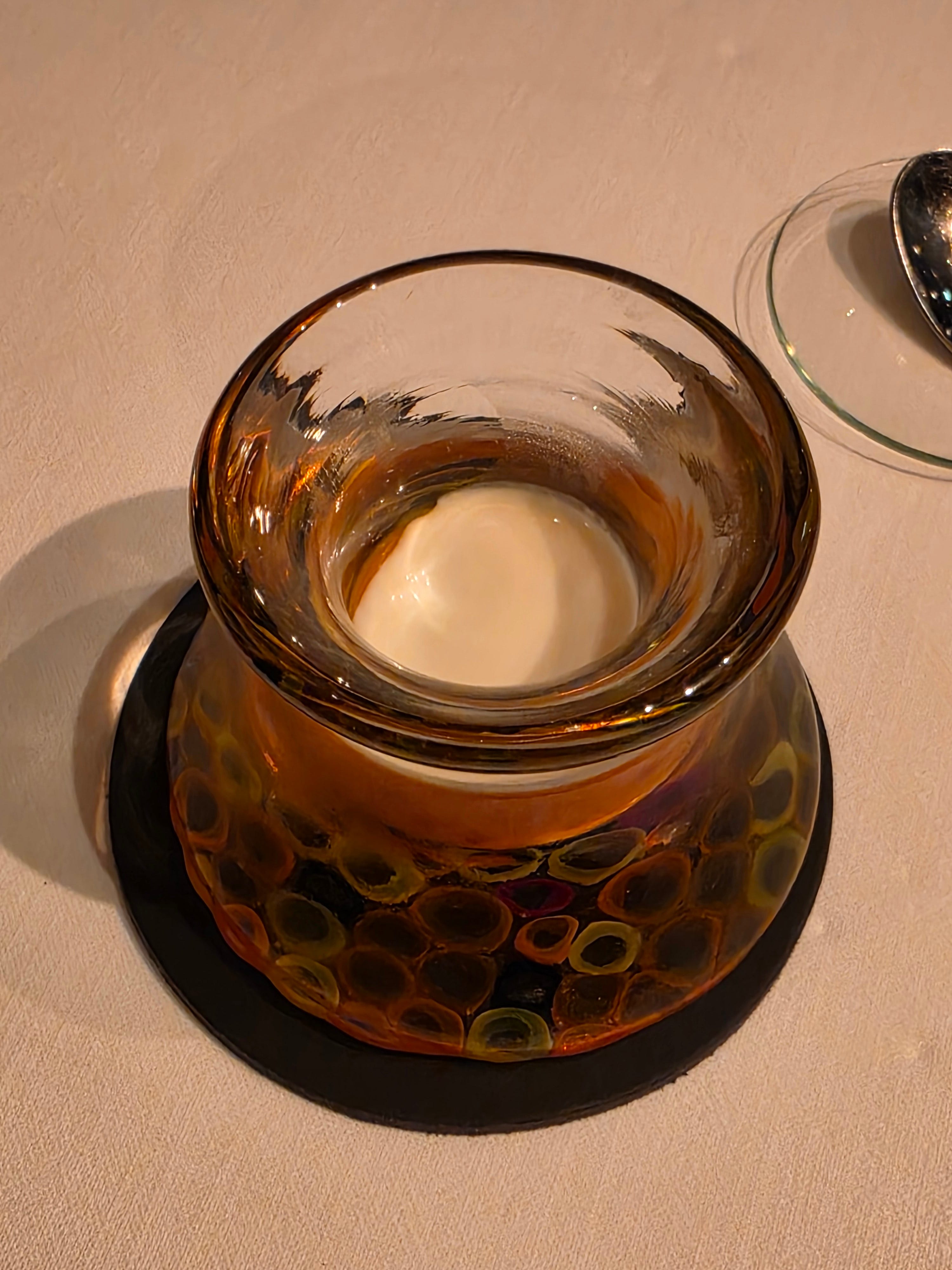 Served on a caviar textured dish with a mussel-like sheen, a generous portion of caviar on top of a soybean custard and sake leas cream. The server remarked that this dish tried to incorporate Japanese ingredients and was a modification of a classic Alinea dish.