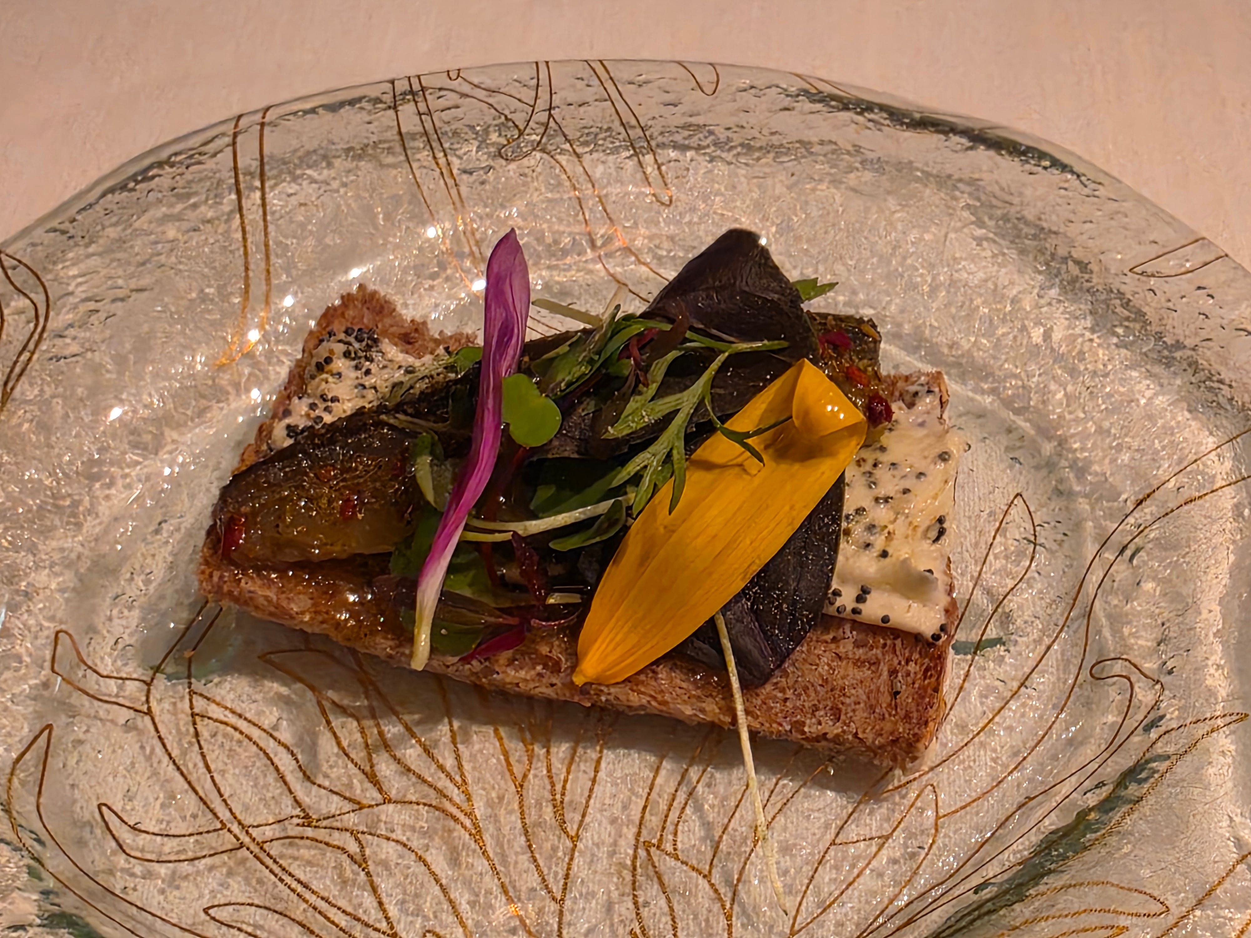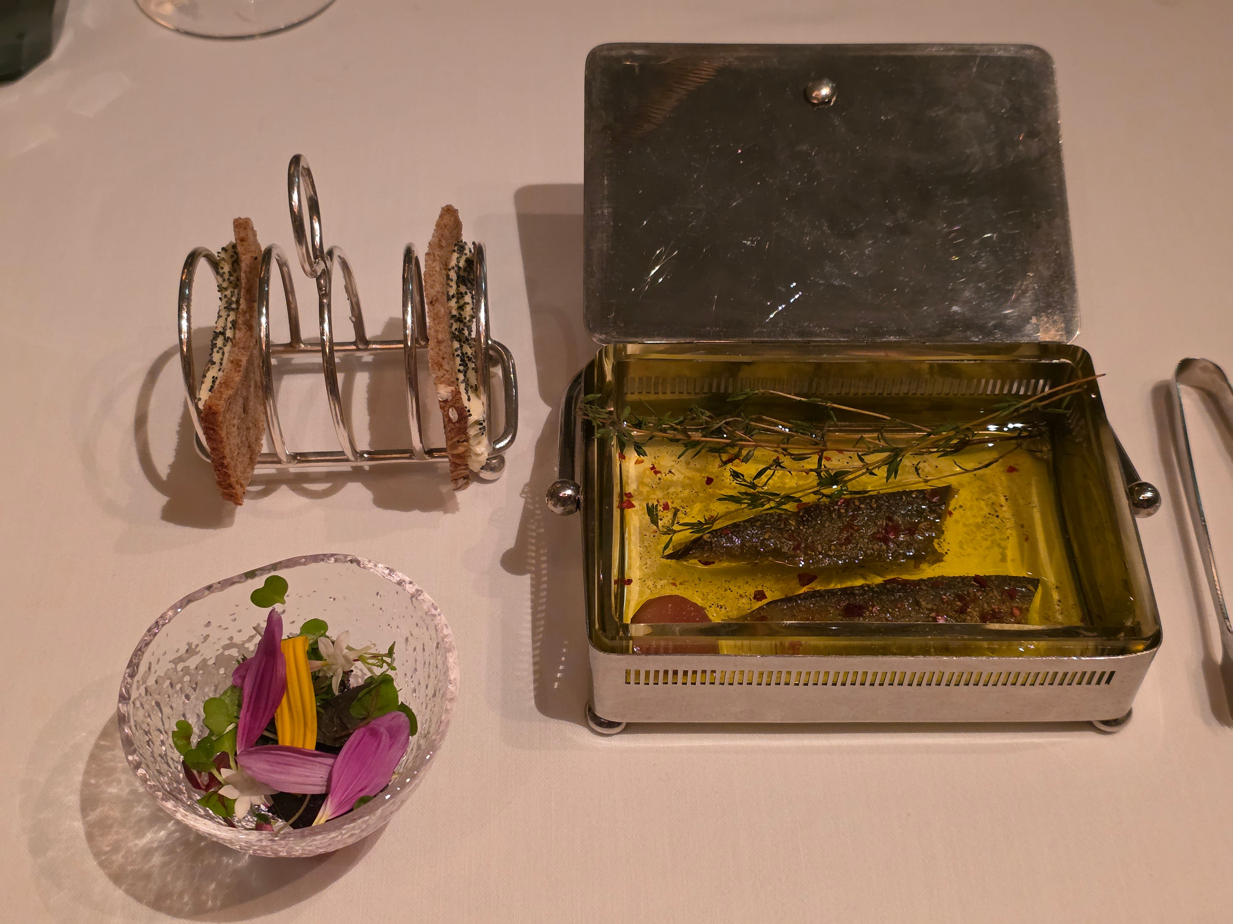 To prepare the classic British favourite, sardines on toast, they brought out thin slices of melba rye toast, fermented Hokkaido butter, opened the box of rosemary and garlic infused “sardines” and some microherbs for toppings. As it turns out, the “sardines” were actually quick-limed Aubergines and contained no fish whatsoever. Aptly, the dish is called “auberdines”. Looks, smelled and tasted exactly like sardines on toast.