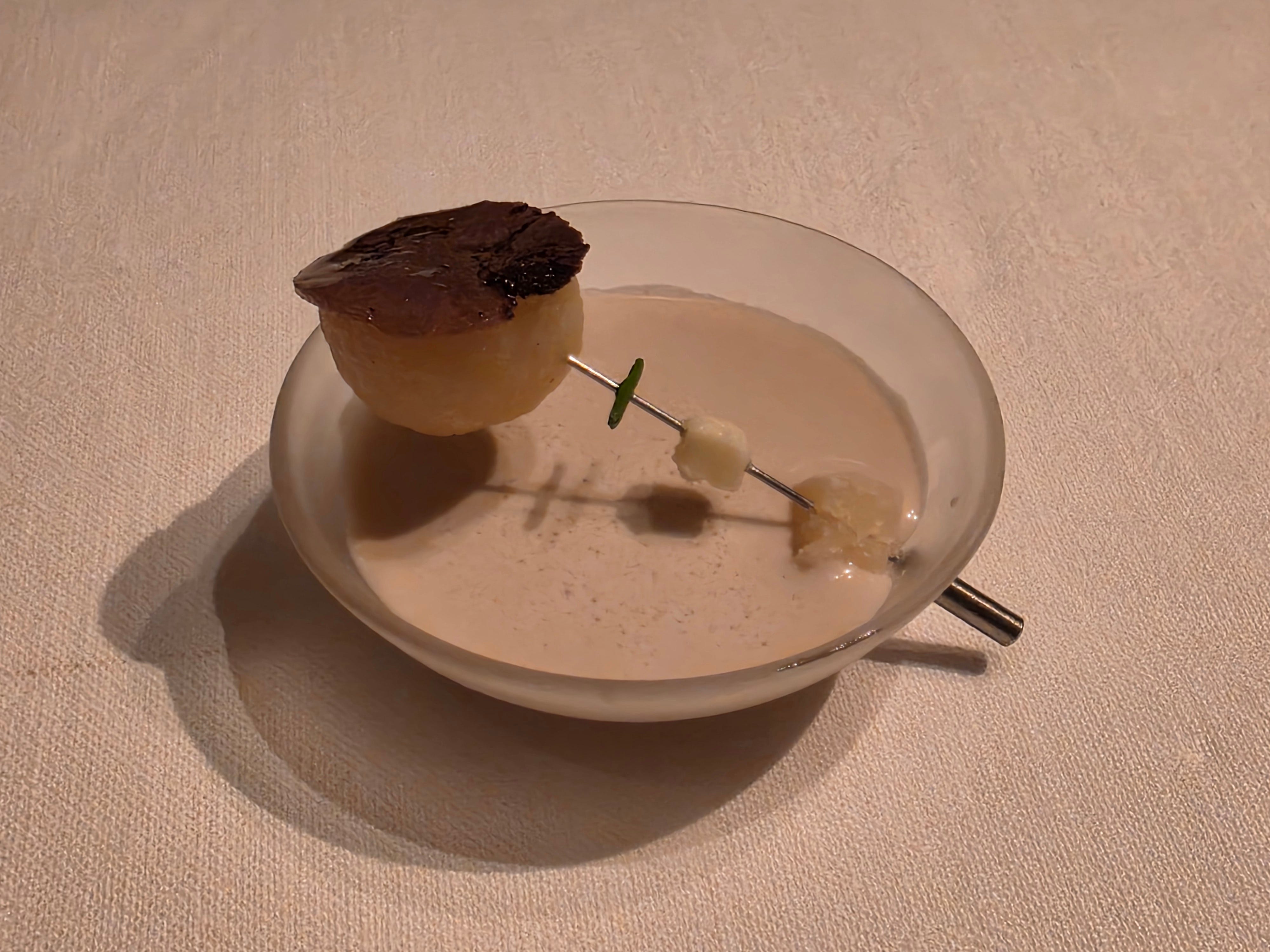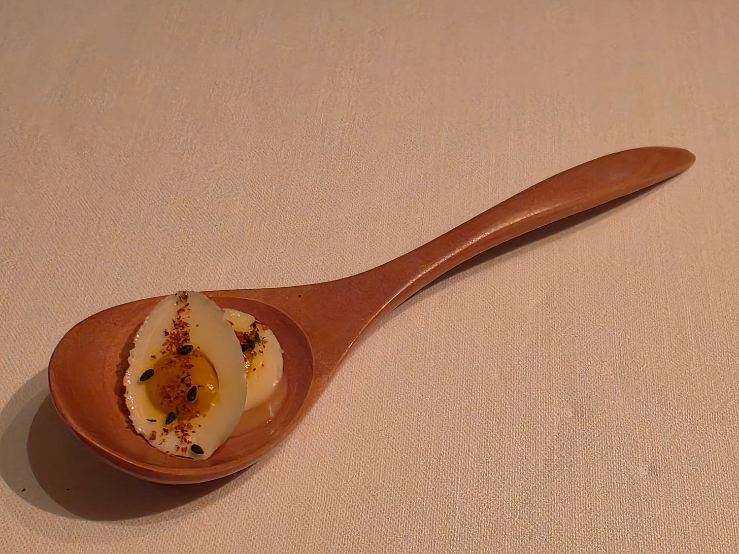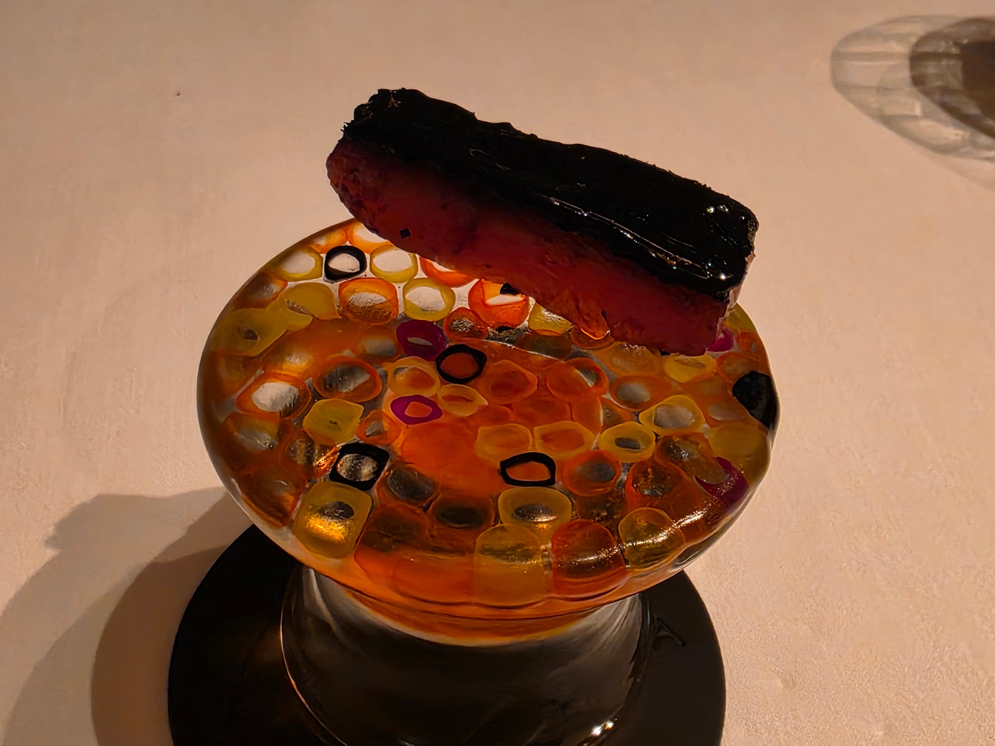 The next dish was called “ramen egg” and contained all the flavours in ramen, condensed into a tiny quail egg. The egg white formed off cream and white pepper, the yolk formed from chicken stock and ramen noodle puree. Interesting, but a bit “meh”.