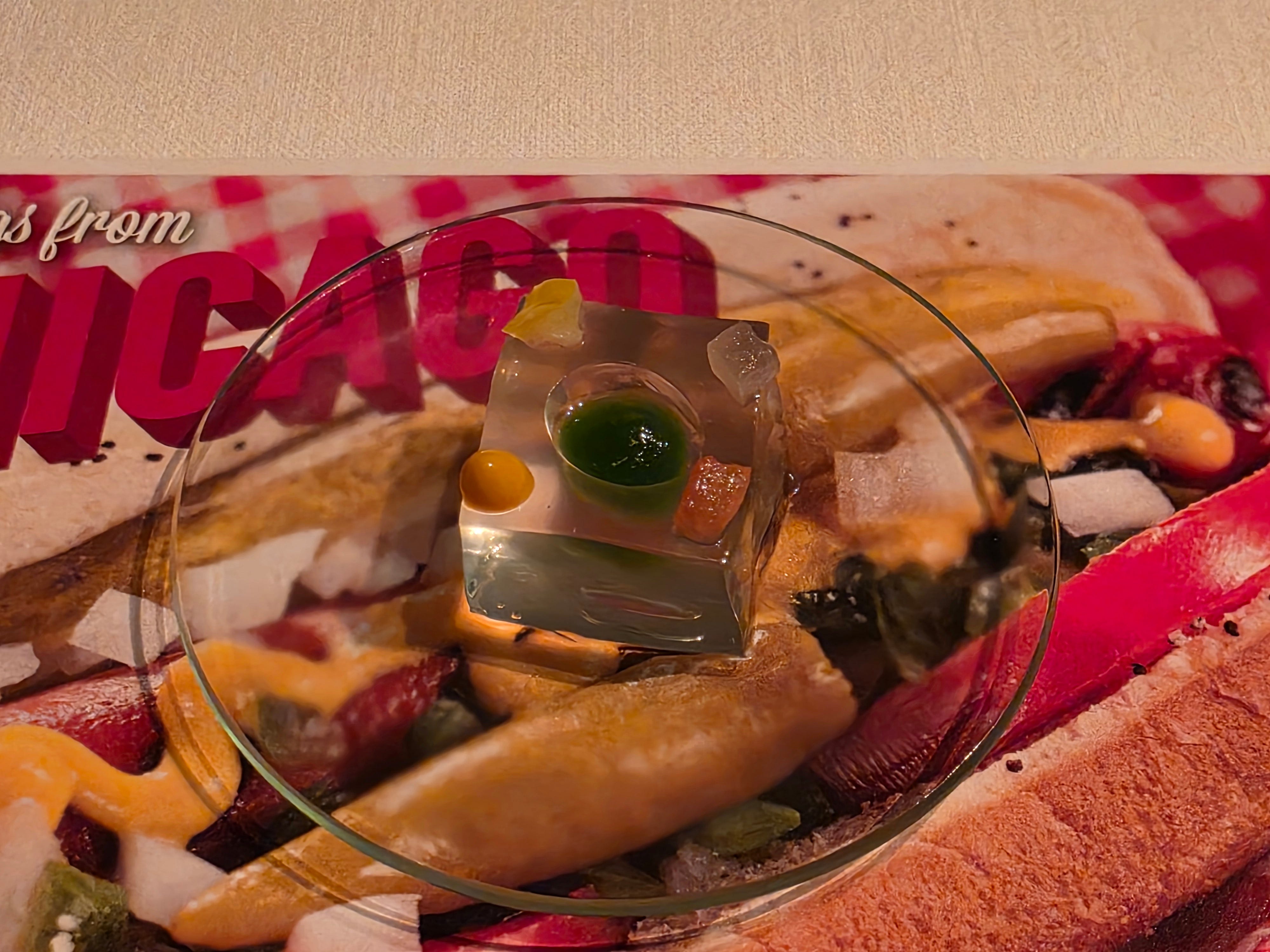 The amuse bouche, which was Alinea’s take on the Chicago style hotdog. All the flavours condensed into a gelatinous cube. It doesn’t seem particularly appealing visually, but once you popped it into your mouth, you got hit with Chicago flavours - hot mustard, tomato, dill pickle and celery salt as well as the all-beef sausage flavour.