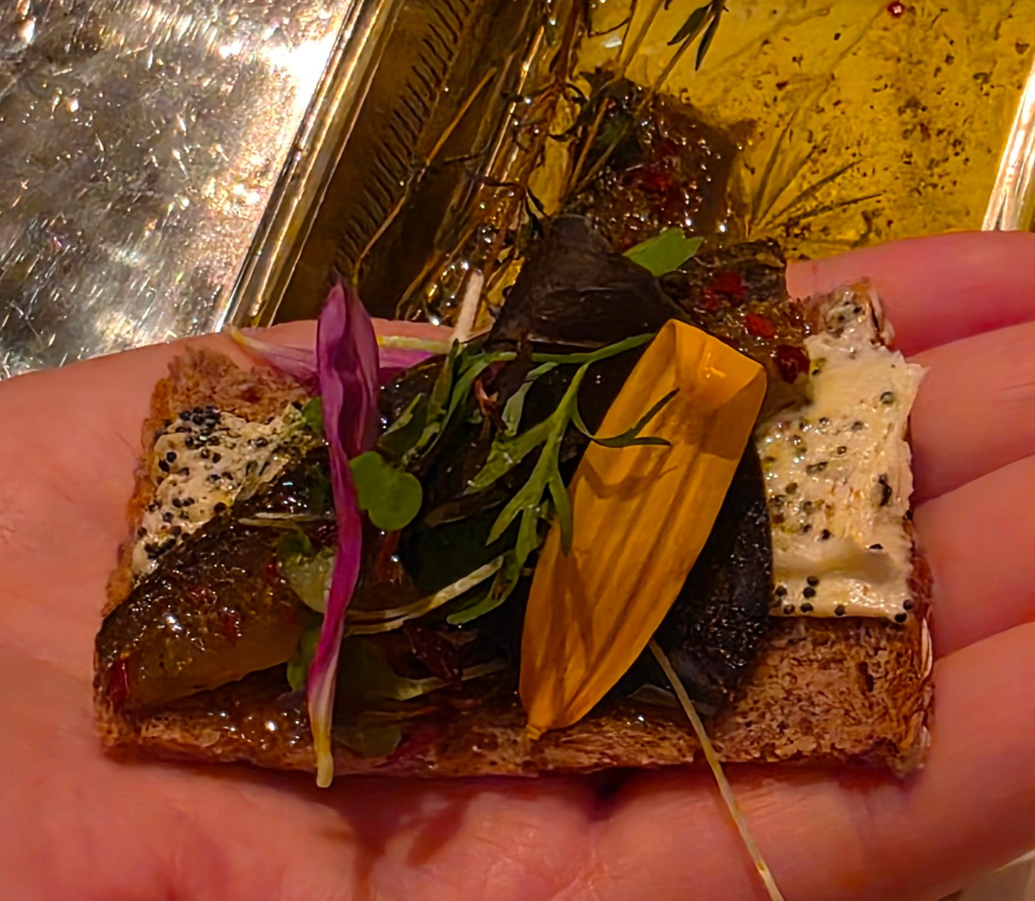 The next dish was called Char Charred. Okay, that seems pretty straightforward. A piece of sweet Arctic Char jerky that is crispy and well charred with a bit of ash flavour on top. Little did I know that there was another surprise waiting for me.