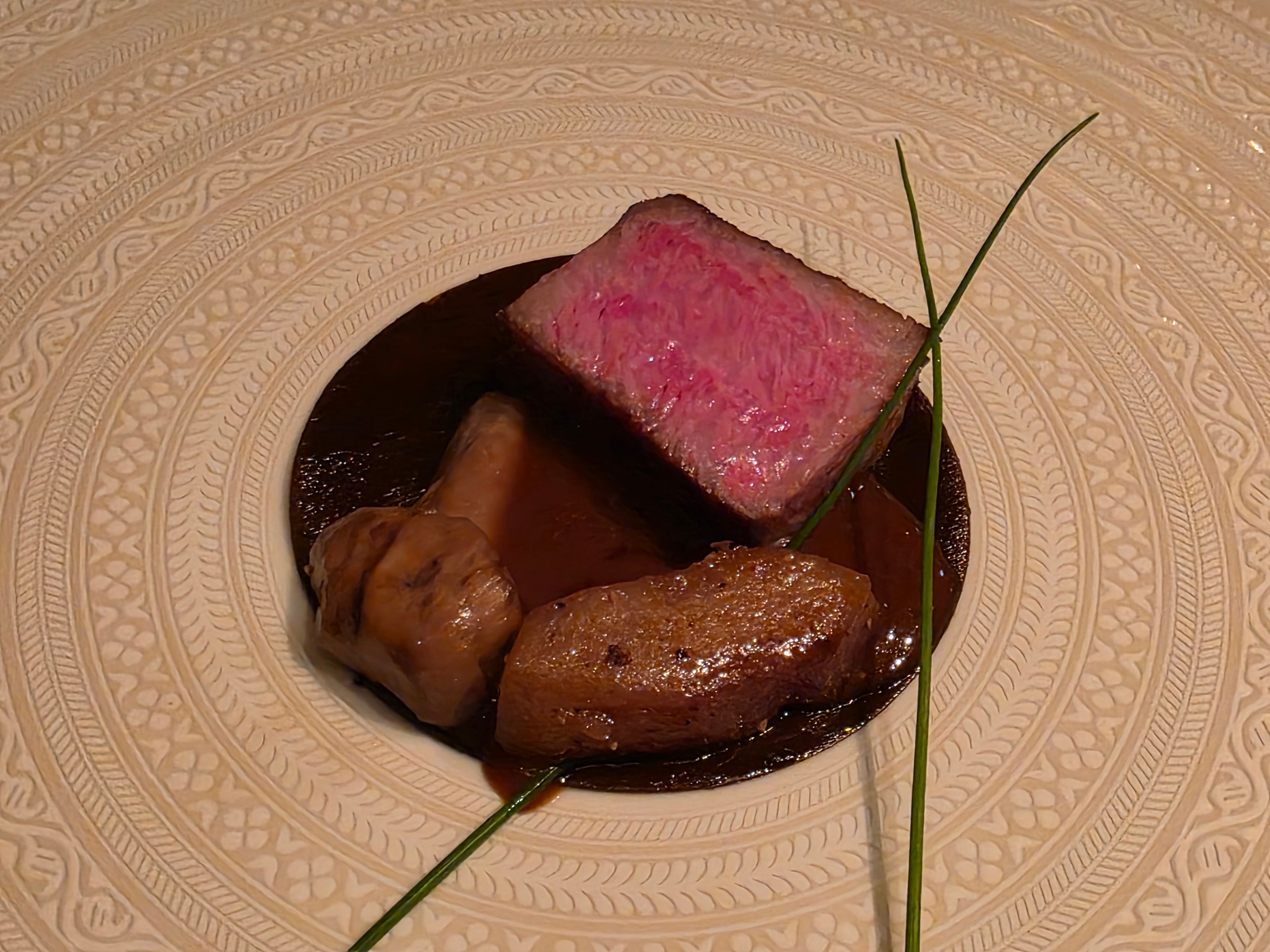 A piece of Akaushi Kumamoto steak, served on a disc of kombu with the braised pear and mushroom.