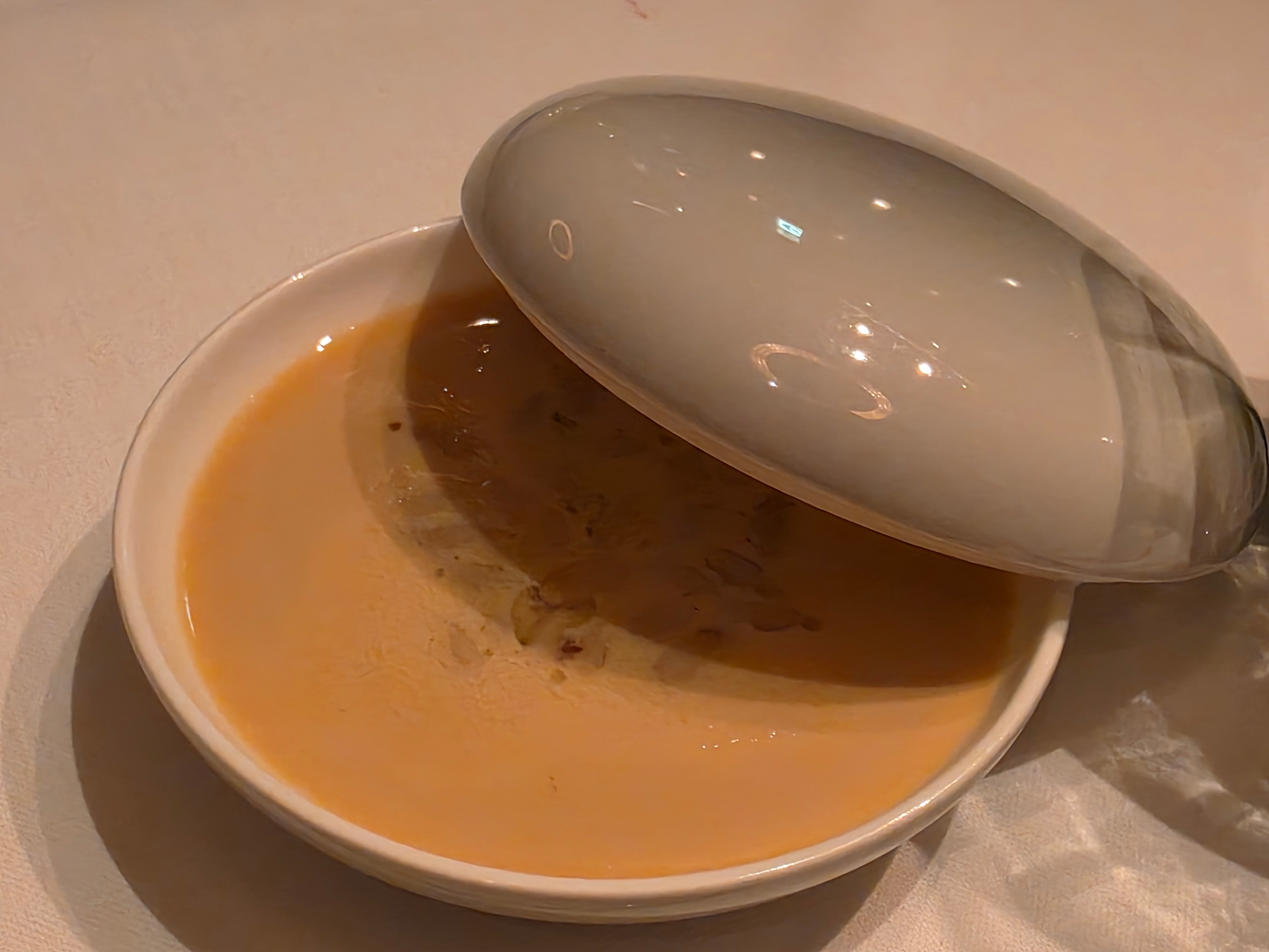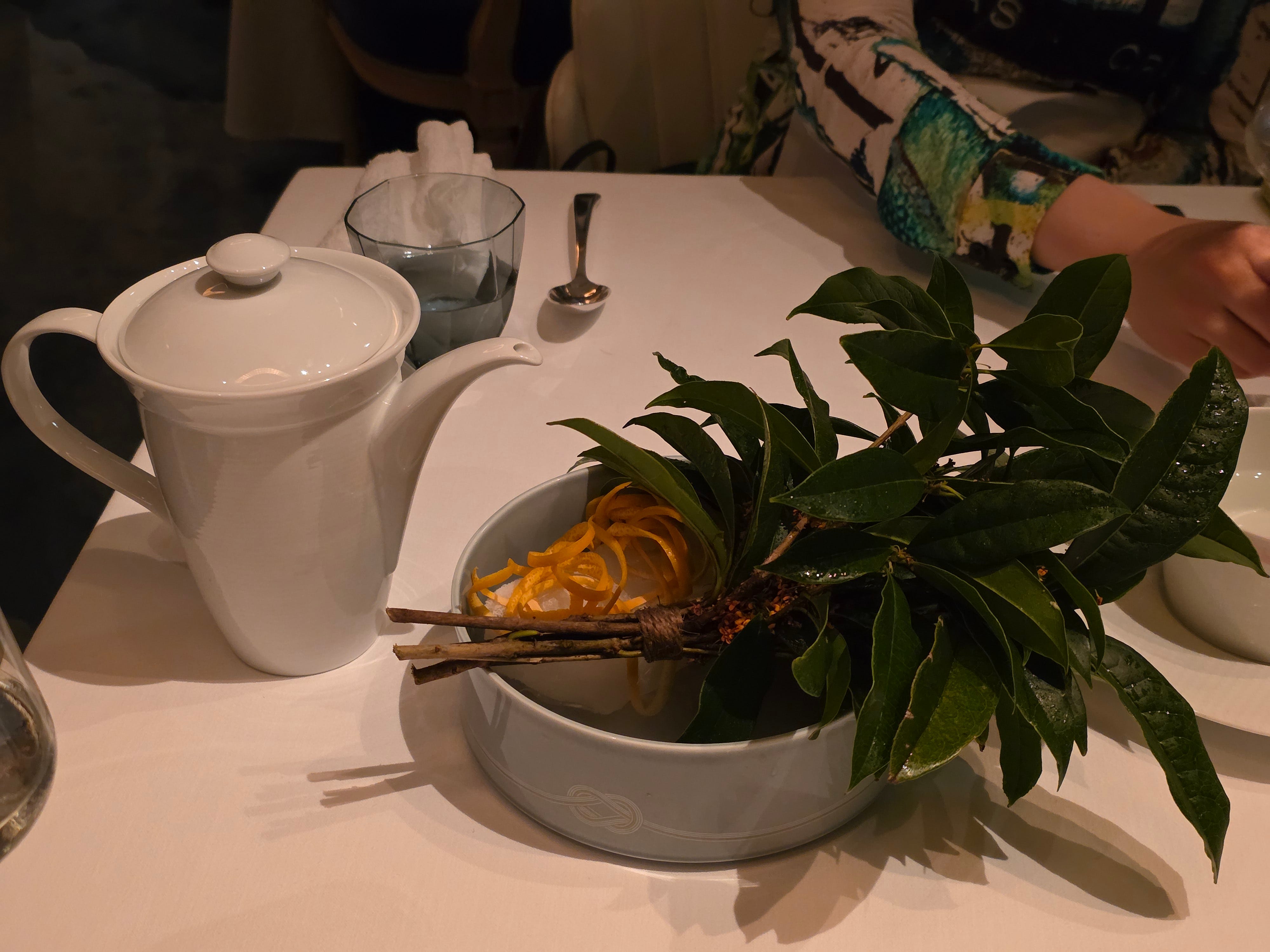 The next dish featured a unique, fragrant centerpiece with osmanthus tea poured on top of dry ice and orange peel for a pleasing aroma.