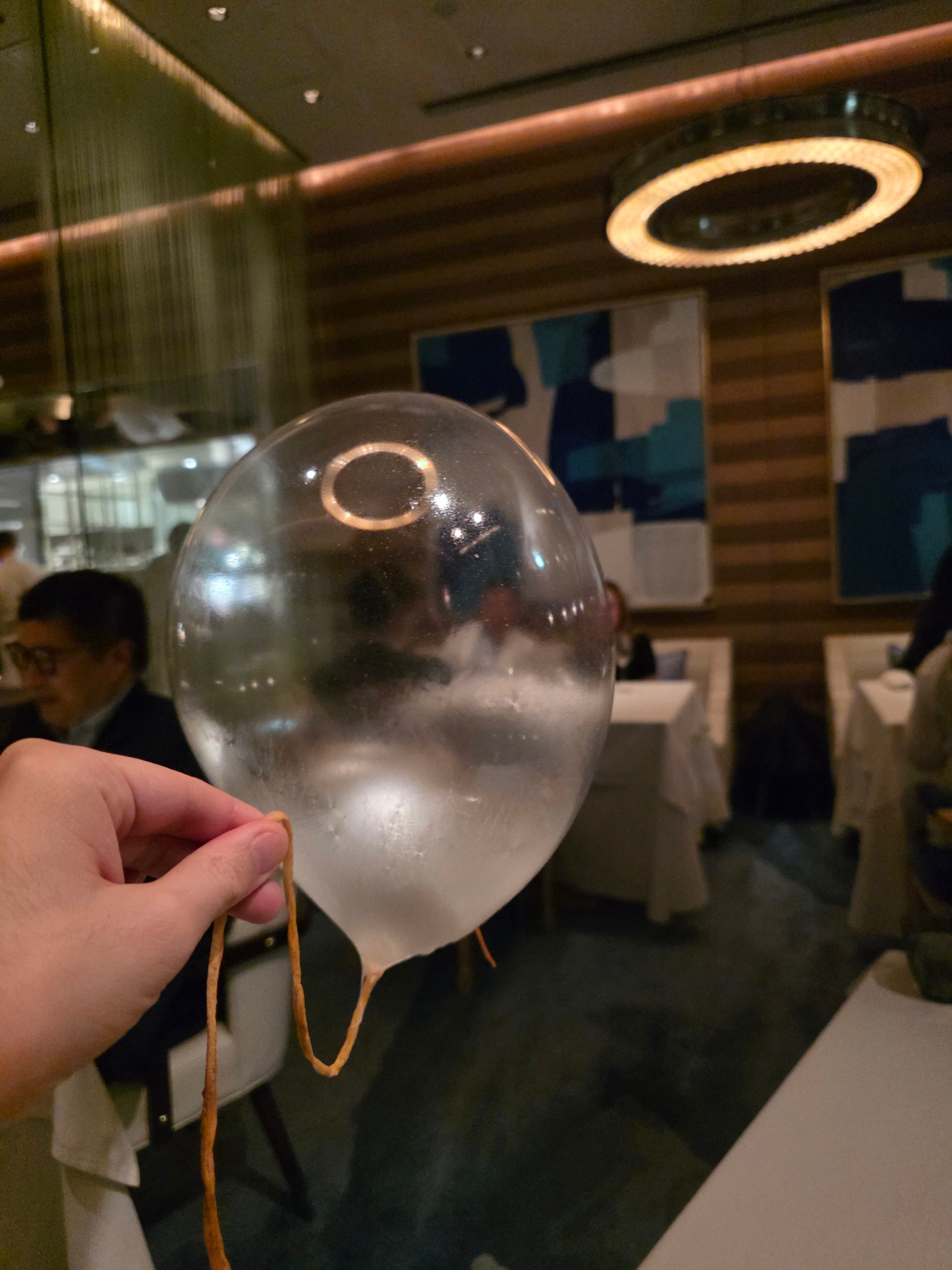 Finally, in the biggest surprise of the night, a completely edible helium balloon, all made out of apple. We were encouraged to bite into the balloon, suck down the helium, joke around, then eat the balloon and the string, before eating the apple pie. Really novel, and a completely unique experience.