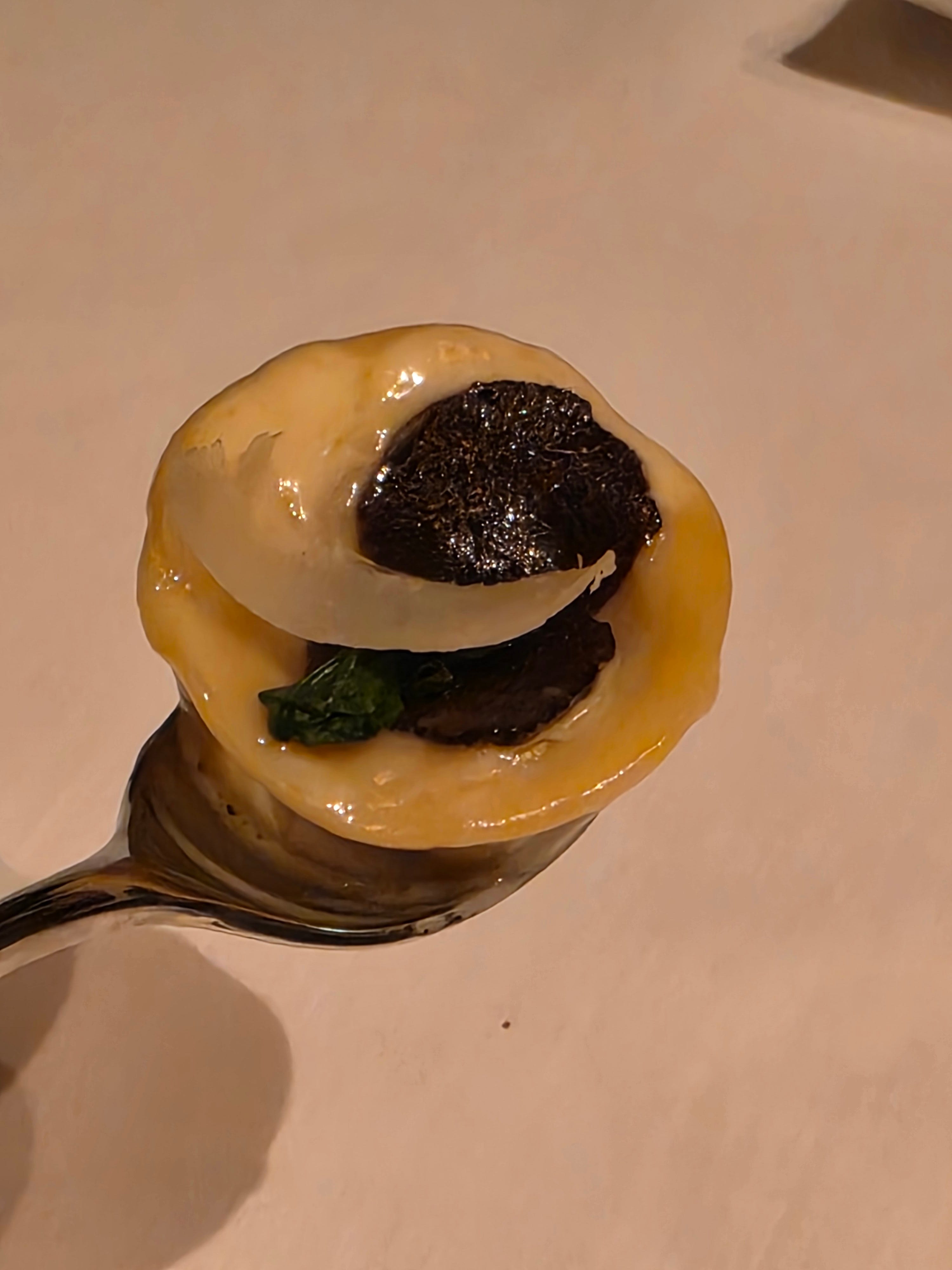 Another Alinea classic, the black truffle explosion. This was probably mind-blowing when it was first featured at Alinea 20 years ago, when the prevalence of good Chinese dumplings must’ve been pretty rare in Chicago. In Asia, where xiaolongbao are pretty common, this was a bit underwhelming.