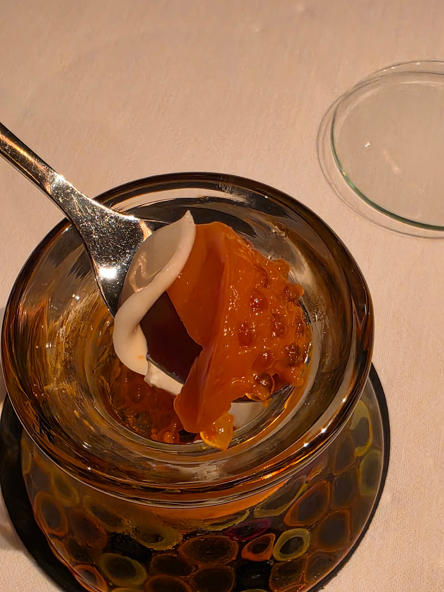 Once we finished the piece of char, we were instructed to turn the dish around to access the second preparation - char roe in a smoked carrot and lemongrass pudding, topped with a thin layer of cream.