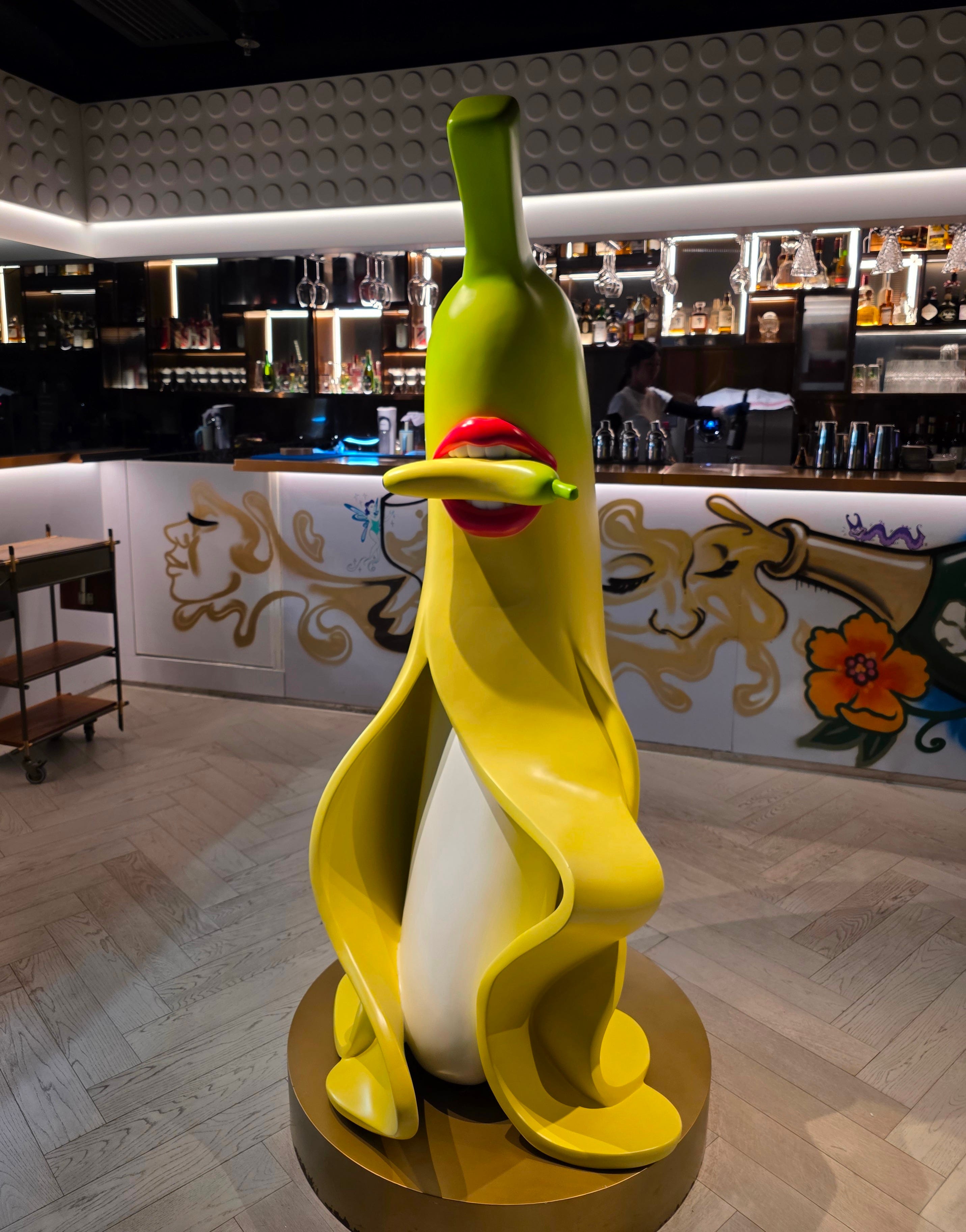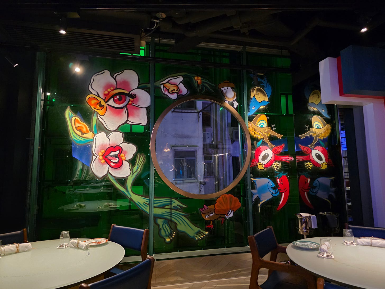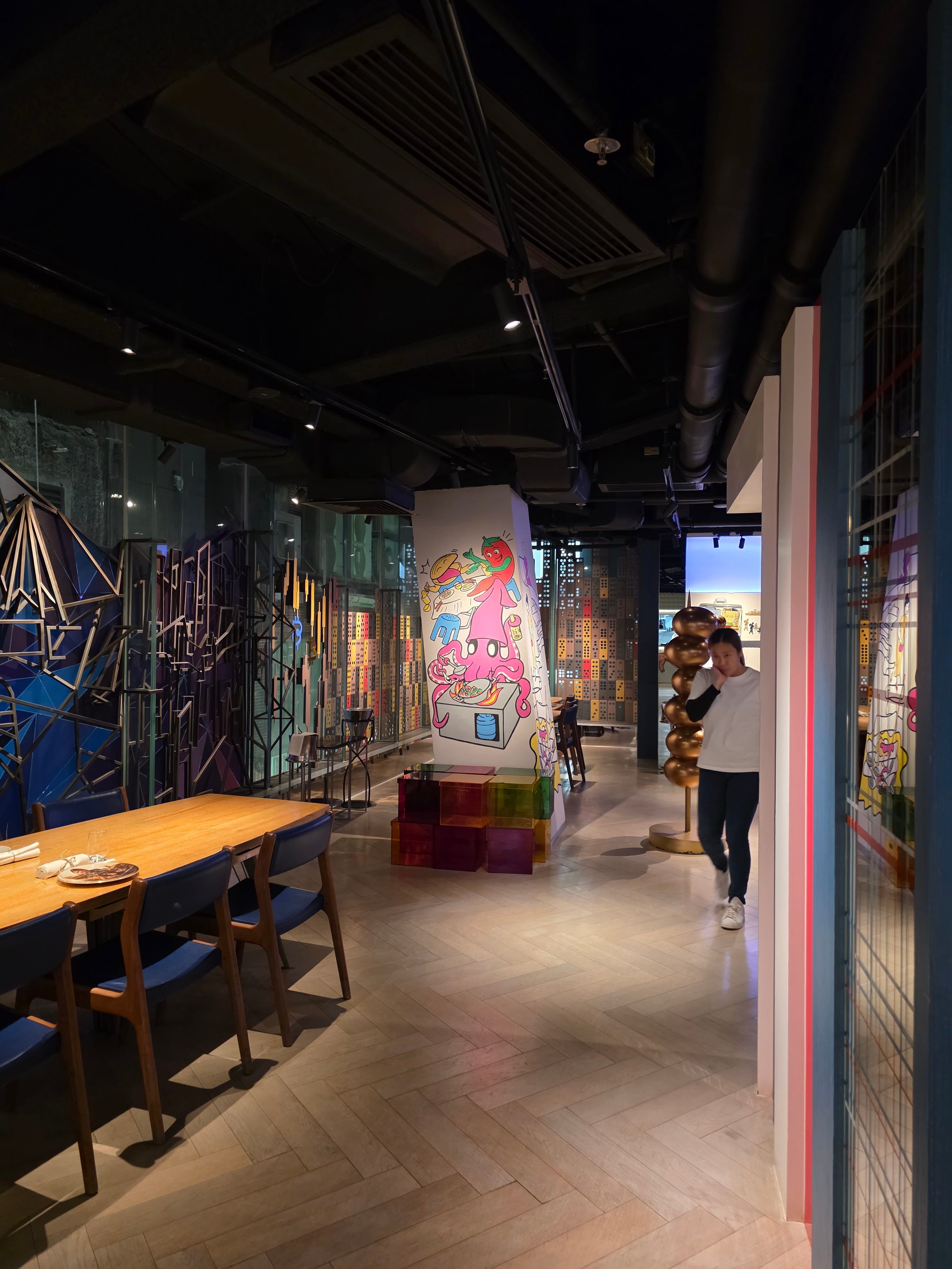 Walking into the space, it’s anything but formal. Local Hong Kong culture forms a common motif, and the mix of vibrant colours and multitude of artwork gives a bit of a surrealist, abstract vibe.