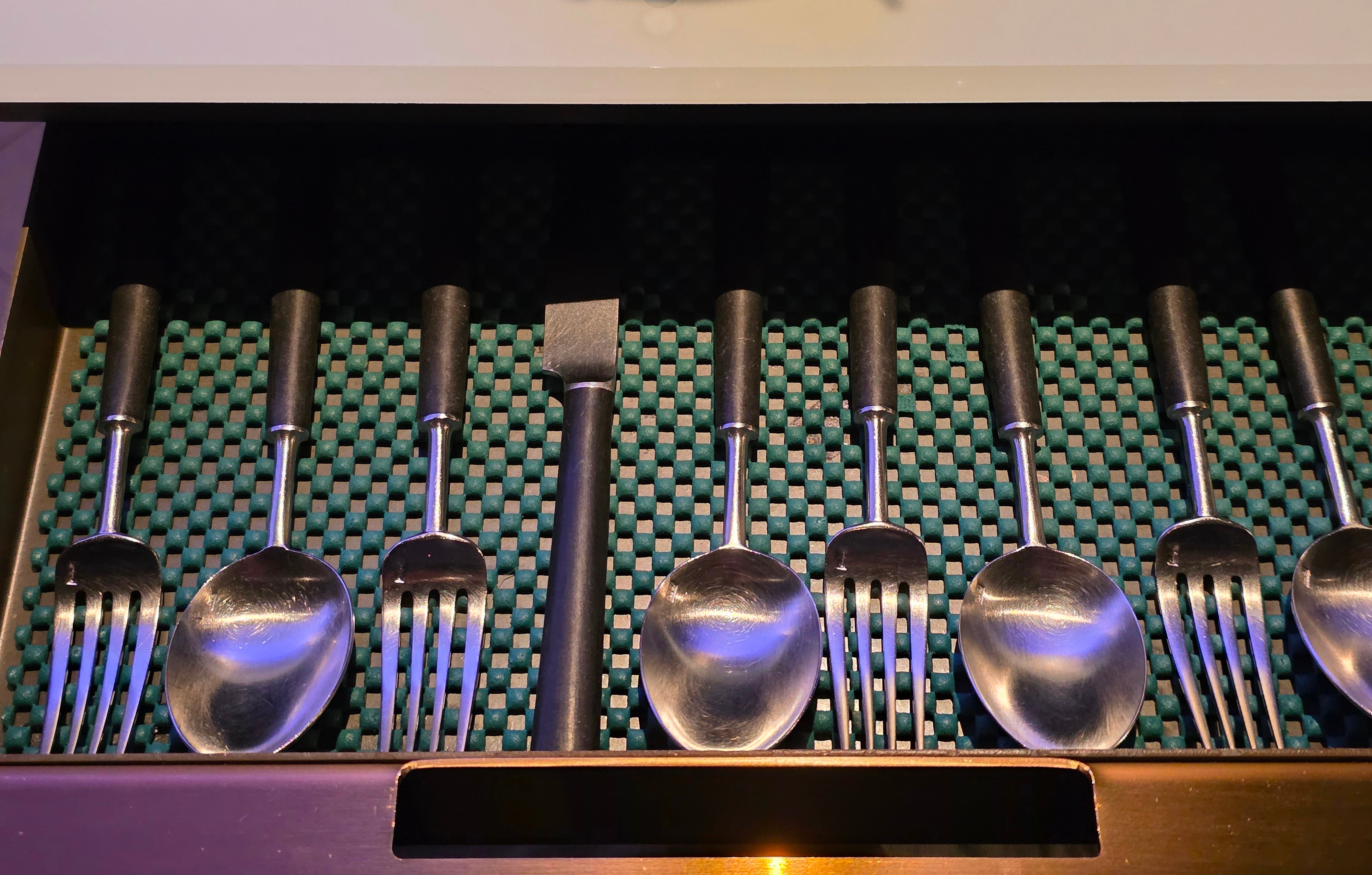 Like a mahjong table or a cha chaan teng, all the cutlery for the meal was stored in a little drawer beneath the table. Another little reference to local Hong Kong culture.