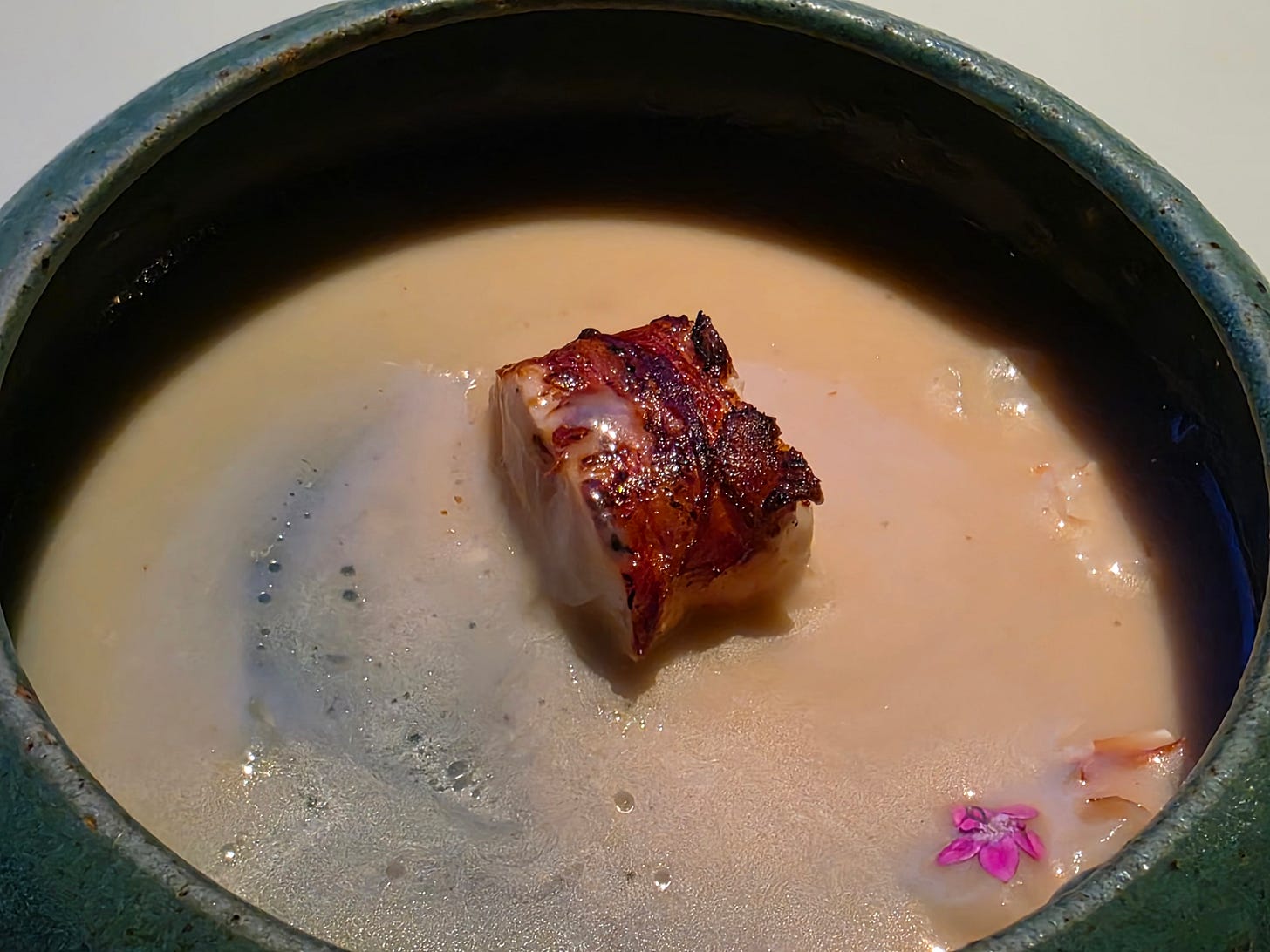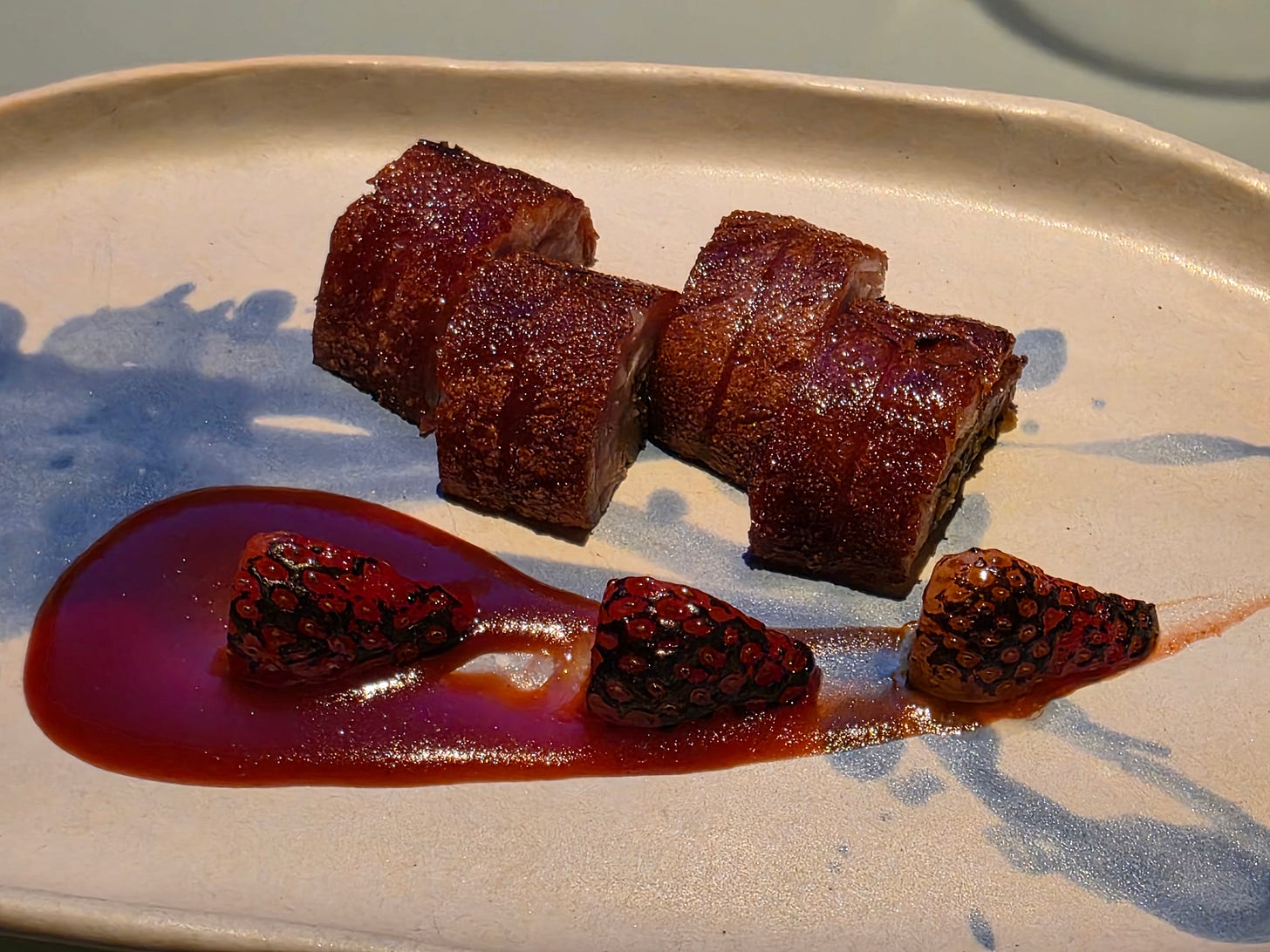 The signature molecular xiaolongbao came next. A sphere filled with condensed pork broth, ginger and aged vinegar with a kick of Szechuan peppercorn. A very classic molecular gastronomy technique that would’ve been very impressive ten years ago. A bit underwhelming for the signature supplement. Would’ve been a good amuse bouche though.
