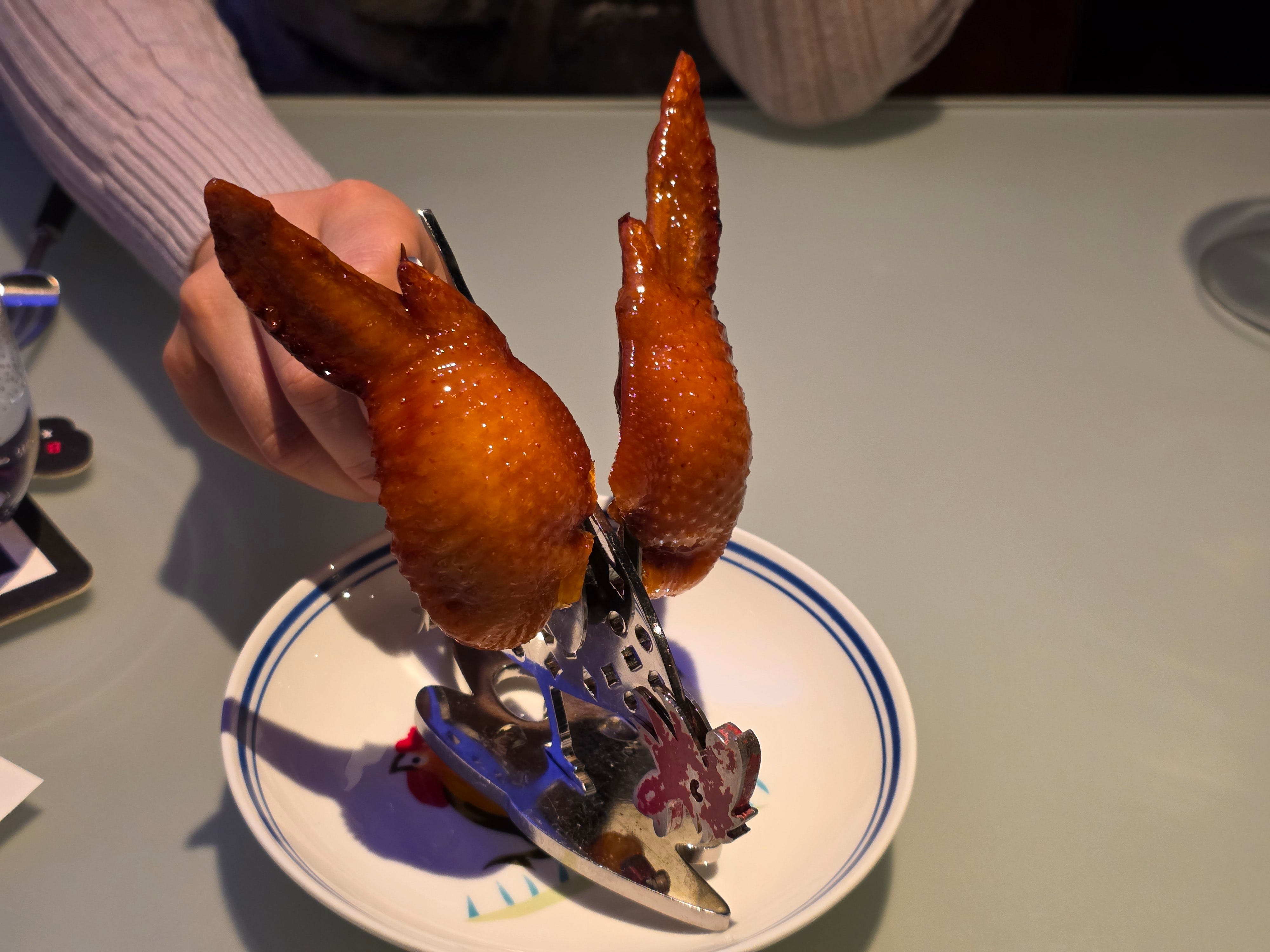 Moving back to the tasting menu, the stuffed chicken wing, deep fried to a crisp, stuffed with shrimp coral. The presentation was neat, with the wings mounted on a metal chicken.