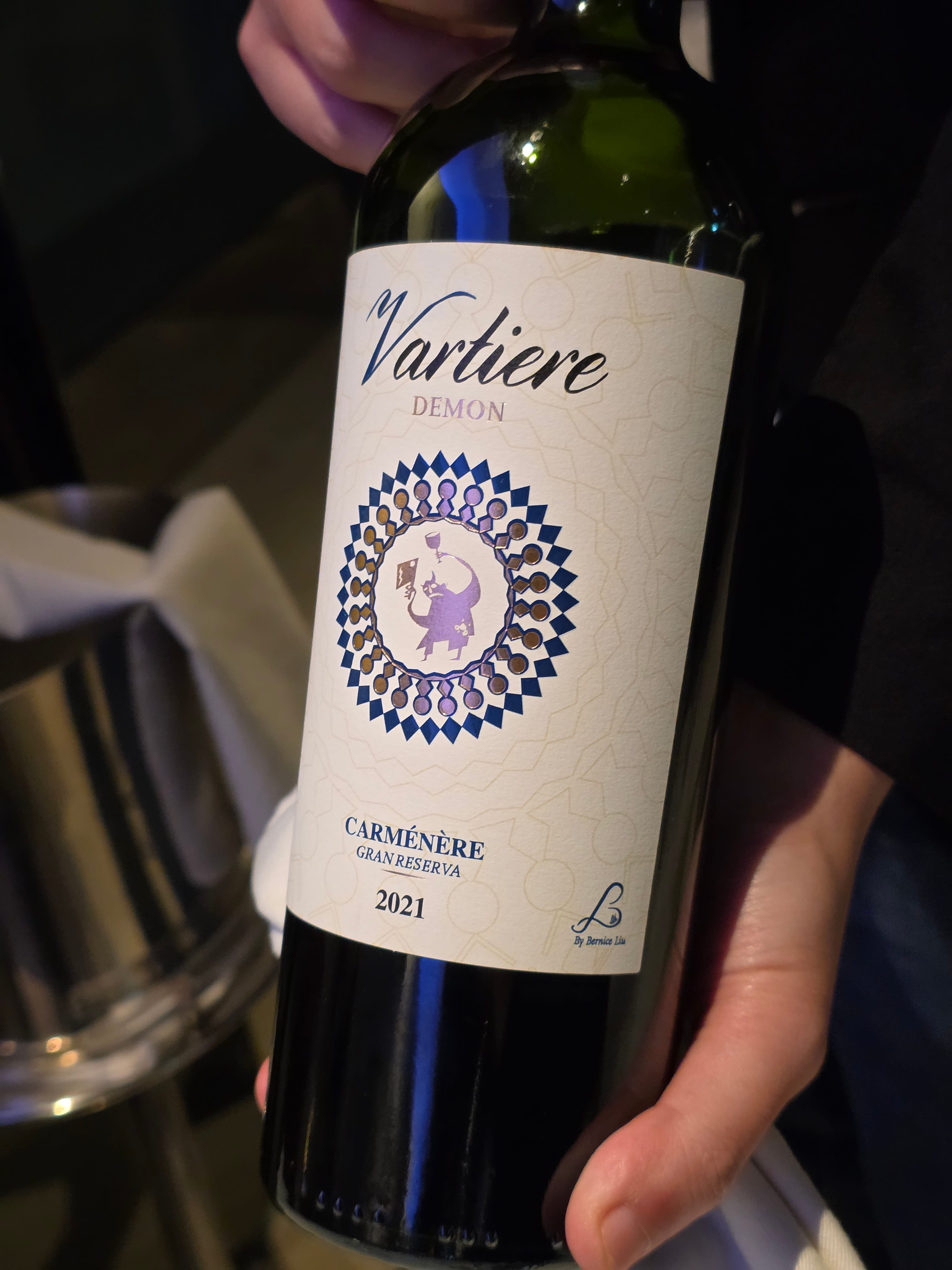Vartiere Gran Reserva Carménère, a Chilean wine bottled specifically for Chef Leung. Intensely red, complex, and well- balanced.