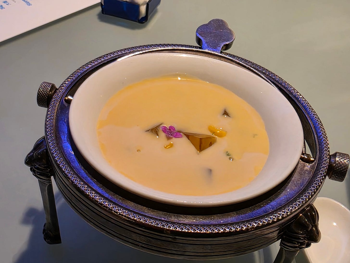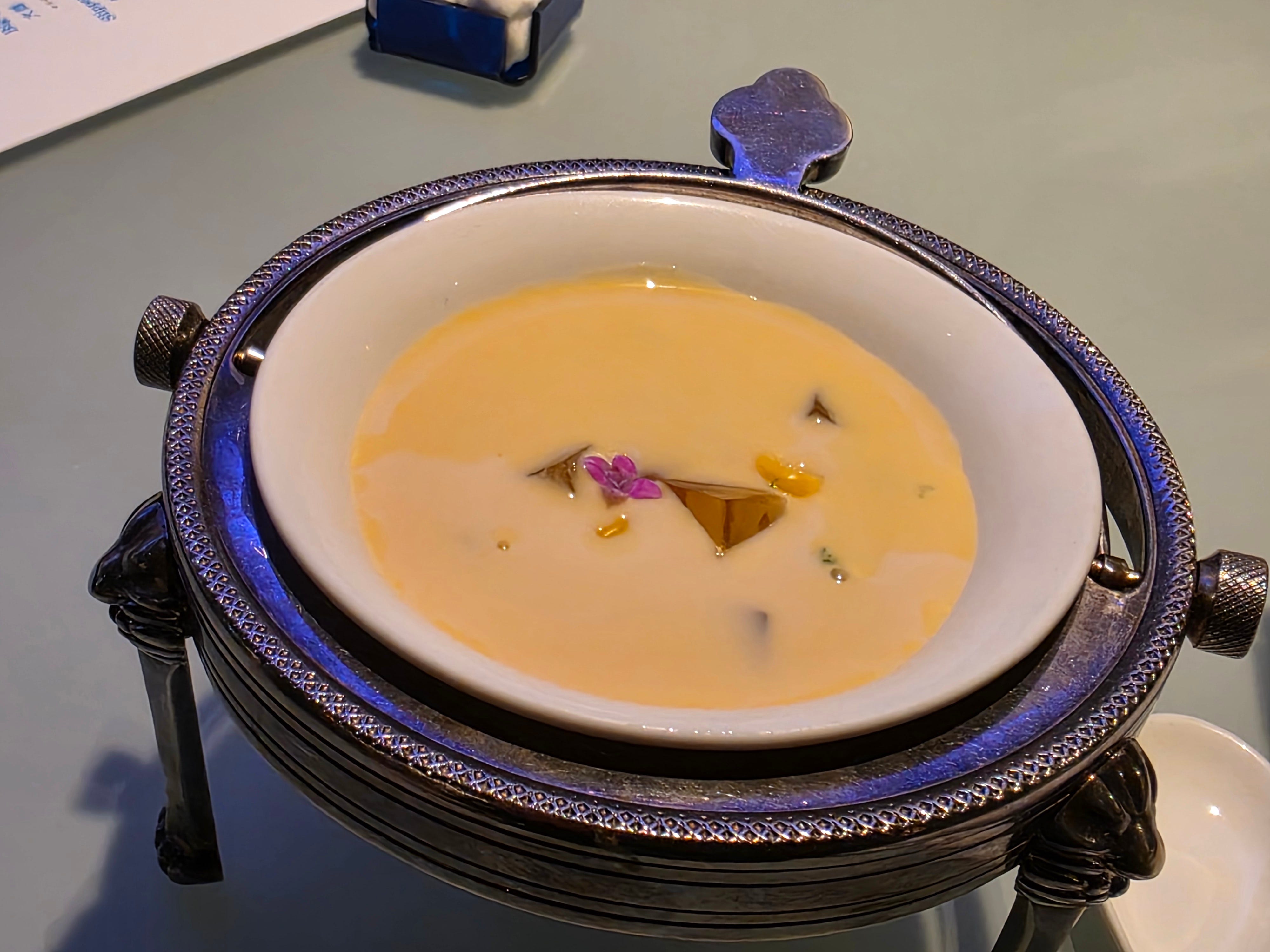 The predessert, “Children of the corn” came next, served in a classic “shark fin” presentation. Didn’t really get this one. A sweetened corn soup served with grape jelly and lime curd. Floral, grassy, and not my favourite.