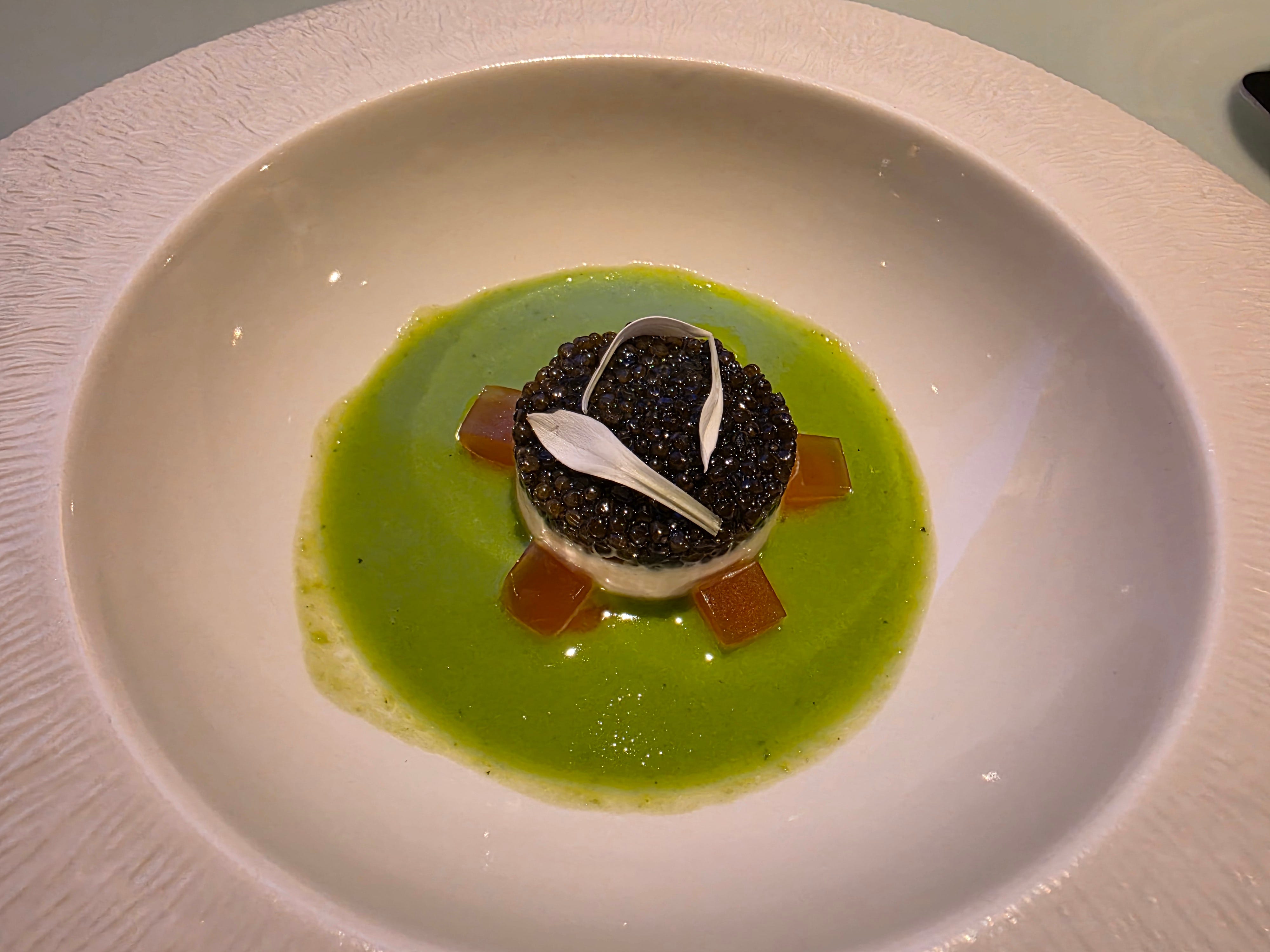 The next course skewed a lot more British than Chinese. A smoked eel mousse, topped with caviar, and cubes of bonito dashi jelly, sauced with a sweet pea and lemon emulsion. Fresh, popping with the sweet pea flavour contrasting the briny caviar and smokiness of the eel. I failed to find any Hong Kong connection, but well executed nonetheless.