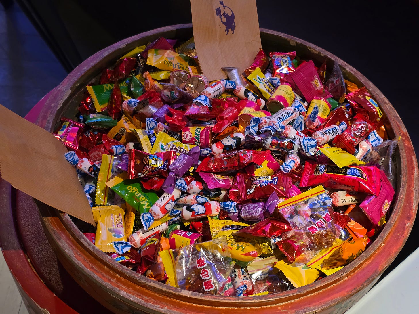 Instead of petit four, we were given paper bags and told to fill them with a selection of classic Hong Kong candied. A trip down nostalgia lane - white rabbit candies, cola hard candies, soft mango gummies and hawthorn crackers, all snacks that any schoolchild growing up in Hong Kong would remember fondly.