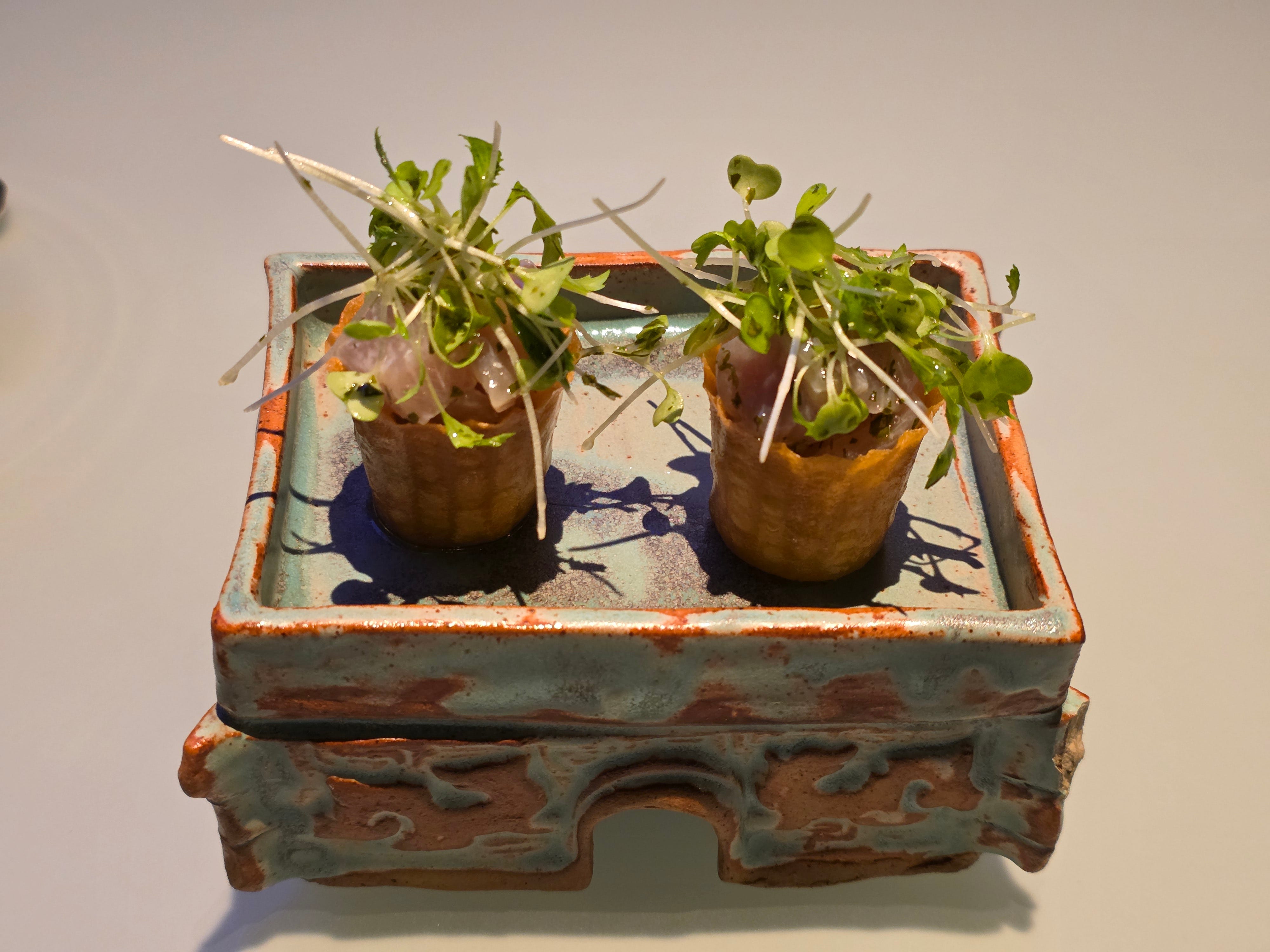 Dried aged Hamachi with watercress. Funky, oily mouthfeel with a hit of acid to balance the fishiness. Really great way to start the meal.