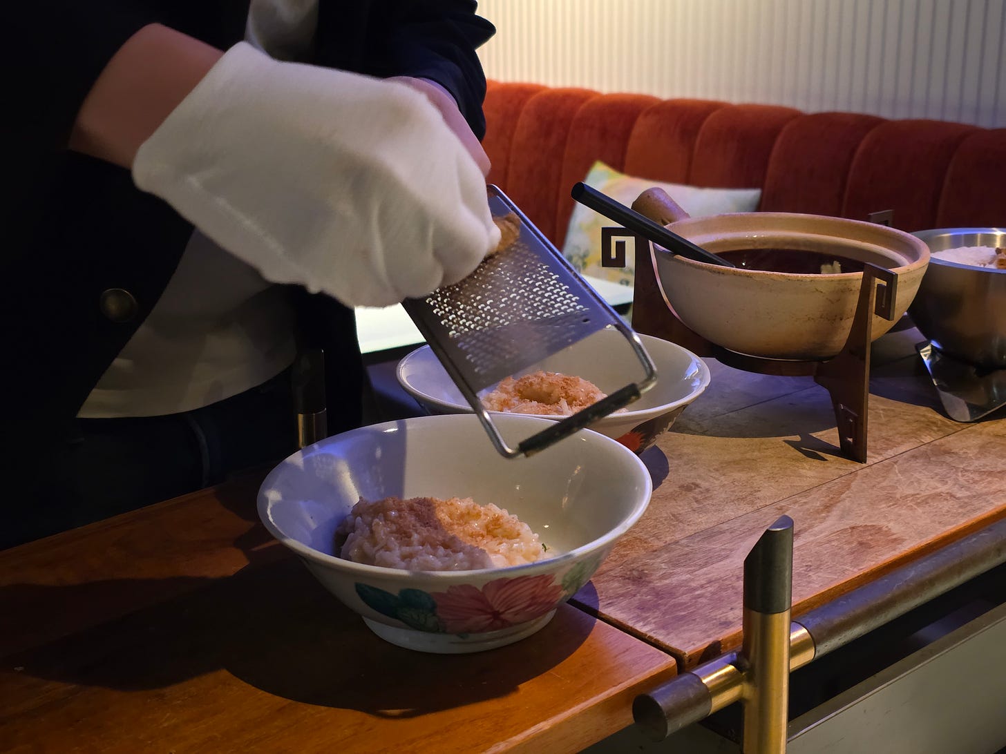 Everything from the wet towelette is served theatrically. In this case , fragrant water poured on top of the towelette pills and dry ice, creating a thick smoke drifting across the table.