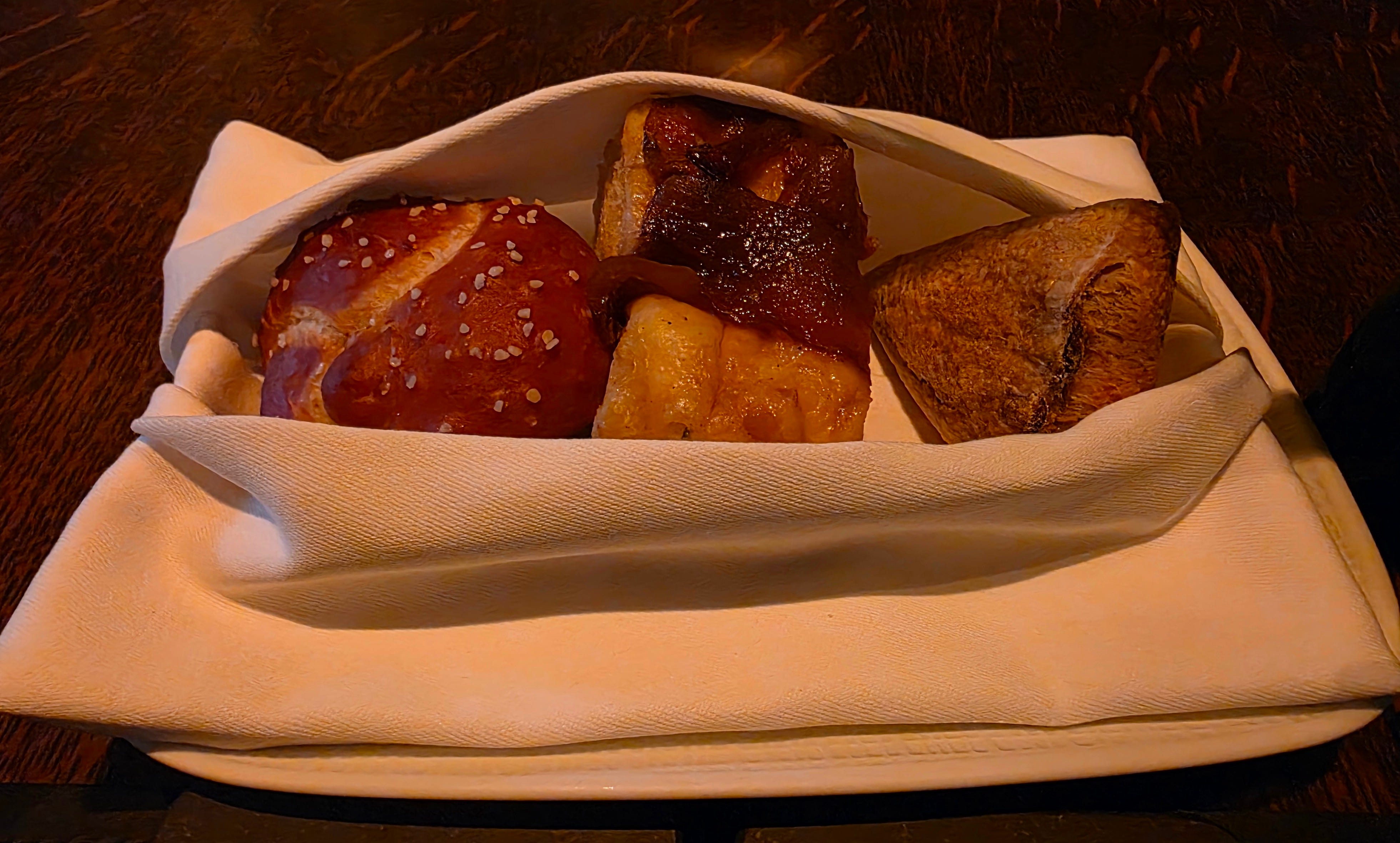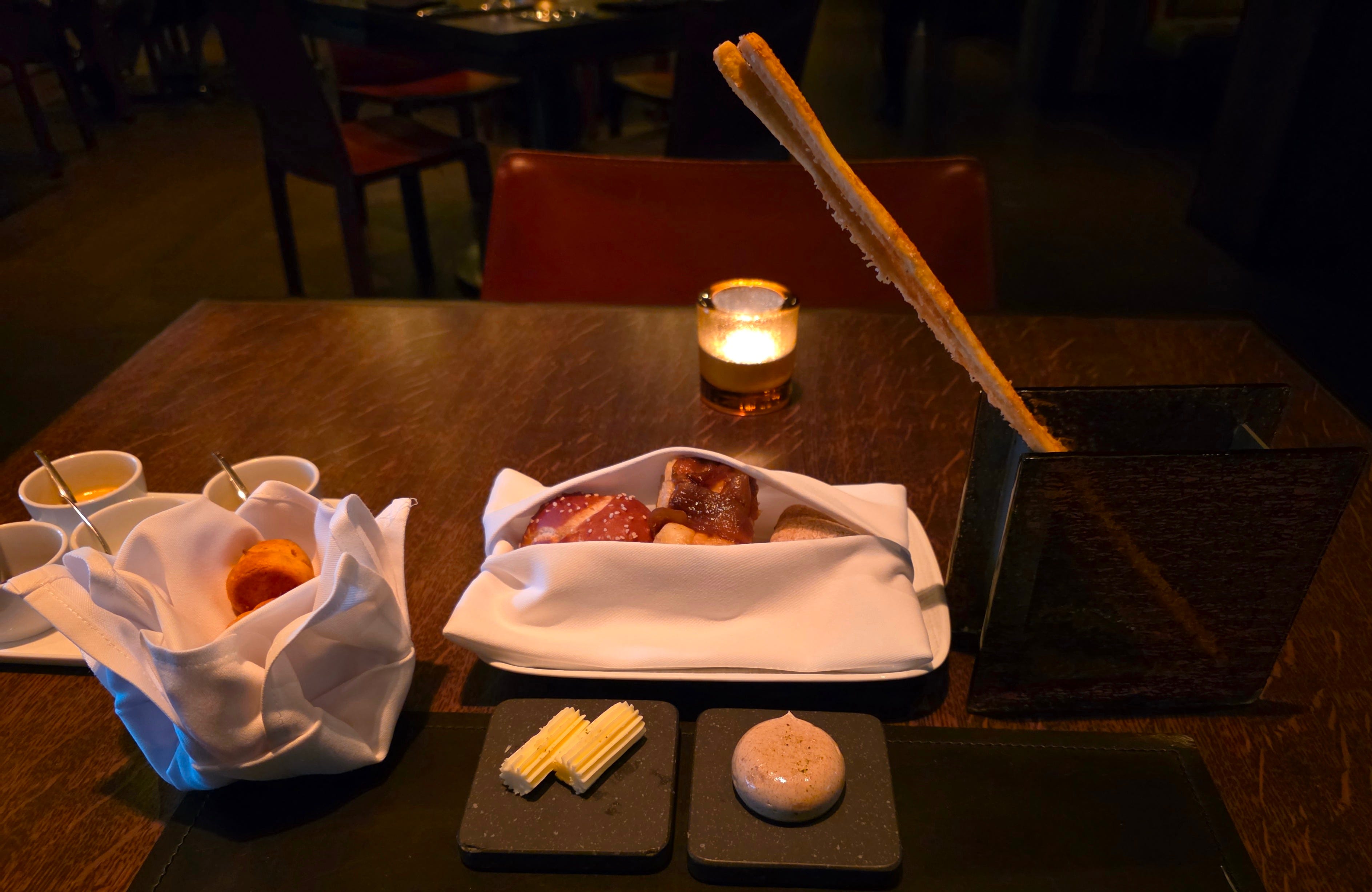 Some classic cheese puffs were brought out, before a variety of breads (a pretzel loaf, onion focaccia, French loaf, long parmesan-dusted breadsticks), served with French butter, and a beef tallow compound butter. The real standout here was the pretzel loaf, which was absolutely delicious, and I ended up finishing, even though I promised I’d leave room for the main event.