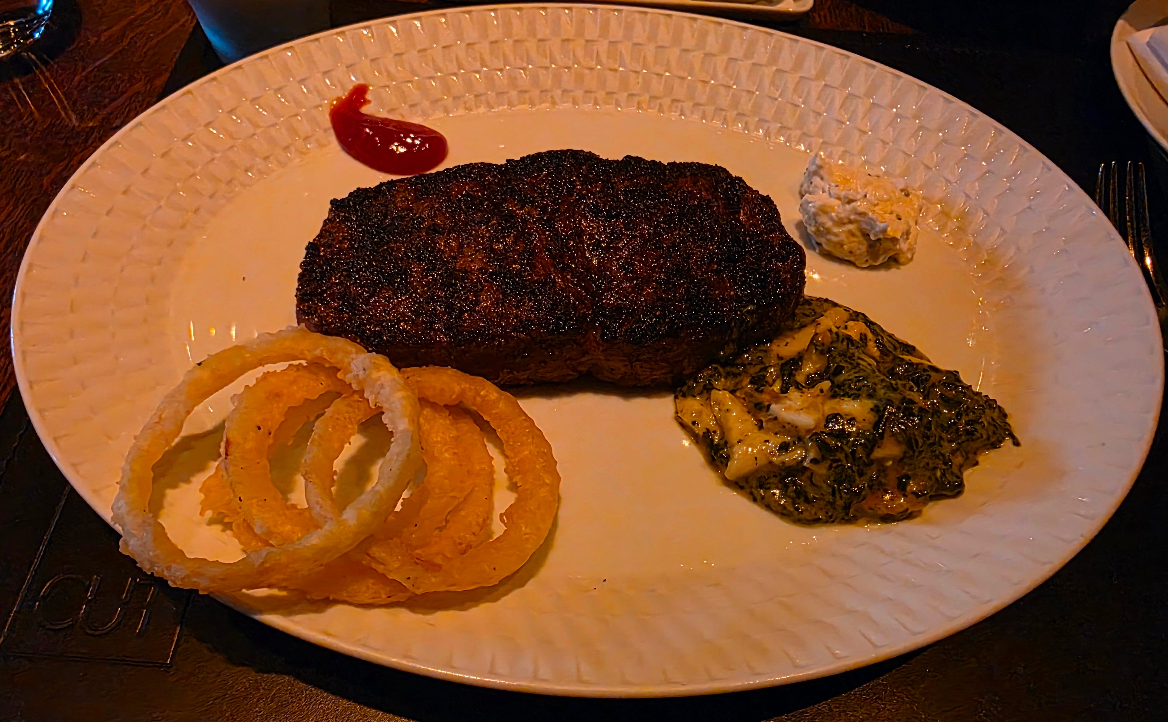 The next difficult choice was the sides. I knew I couldn’t order too many, but they had all the classics - mac and cheese, onion rings, potato mash, creamed spinach, brussel sprouts, fries. I ended up going with two classics - the onion rings and the creamed spinach. Thank goodness I only ordered two, because the serving sizes were massive.