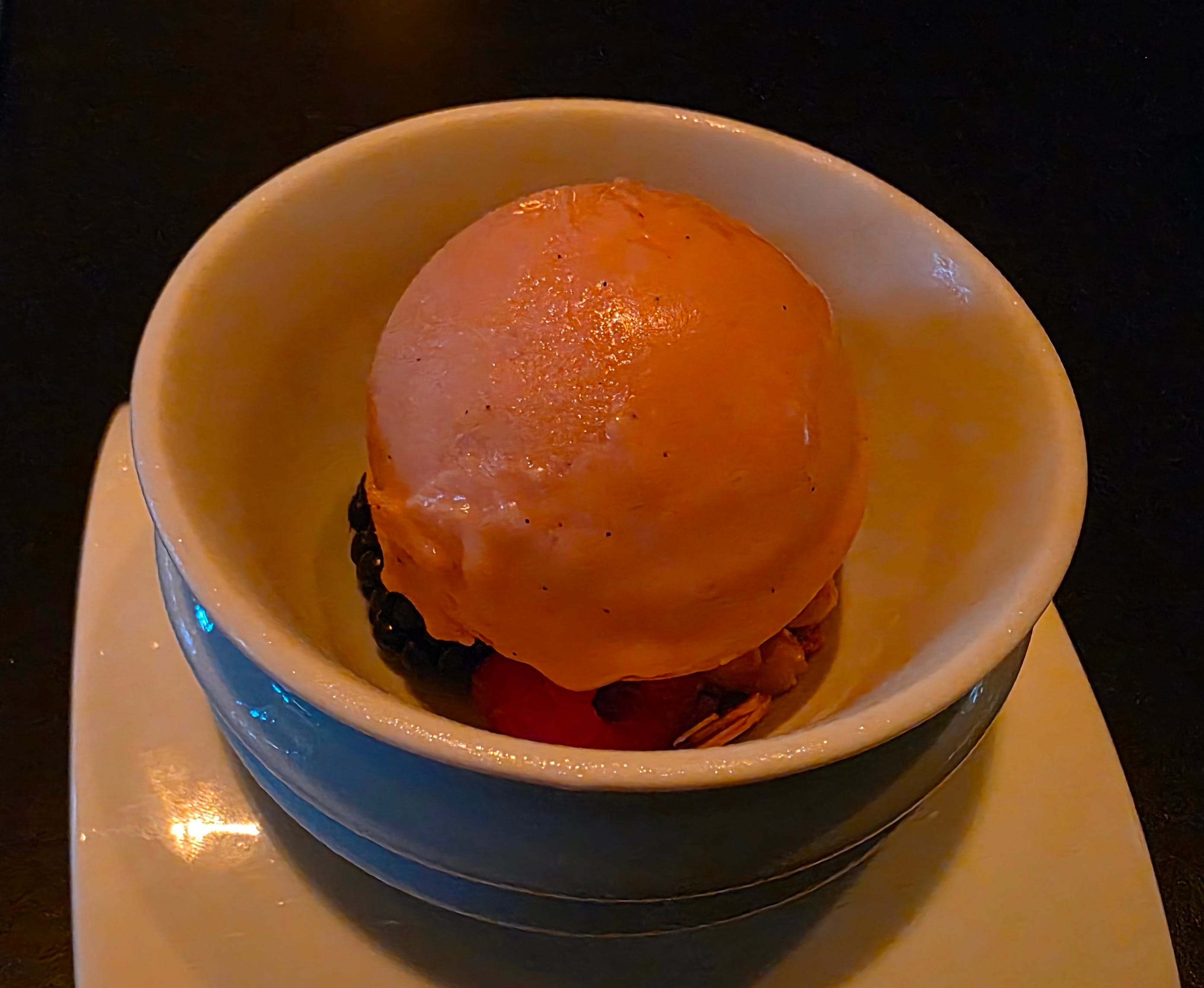 I was pretty surprised when dessert came - I didn’t even need to order anything. A Passionfruit guava sorbet on a bed of blueberries and toasted sliced almonds. A bit of texture along with a tart and sweet sorbet.