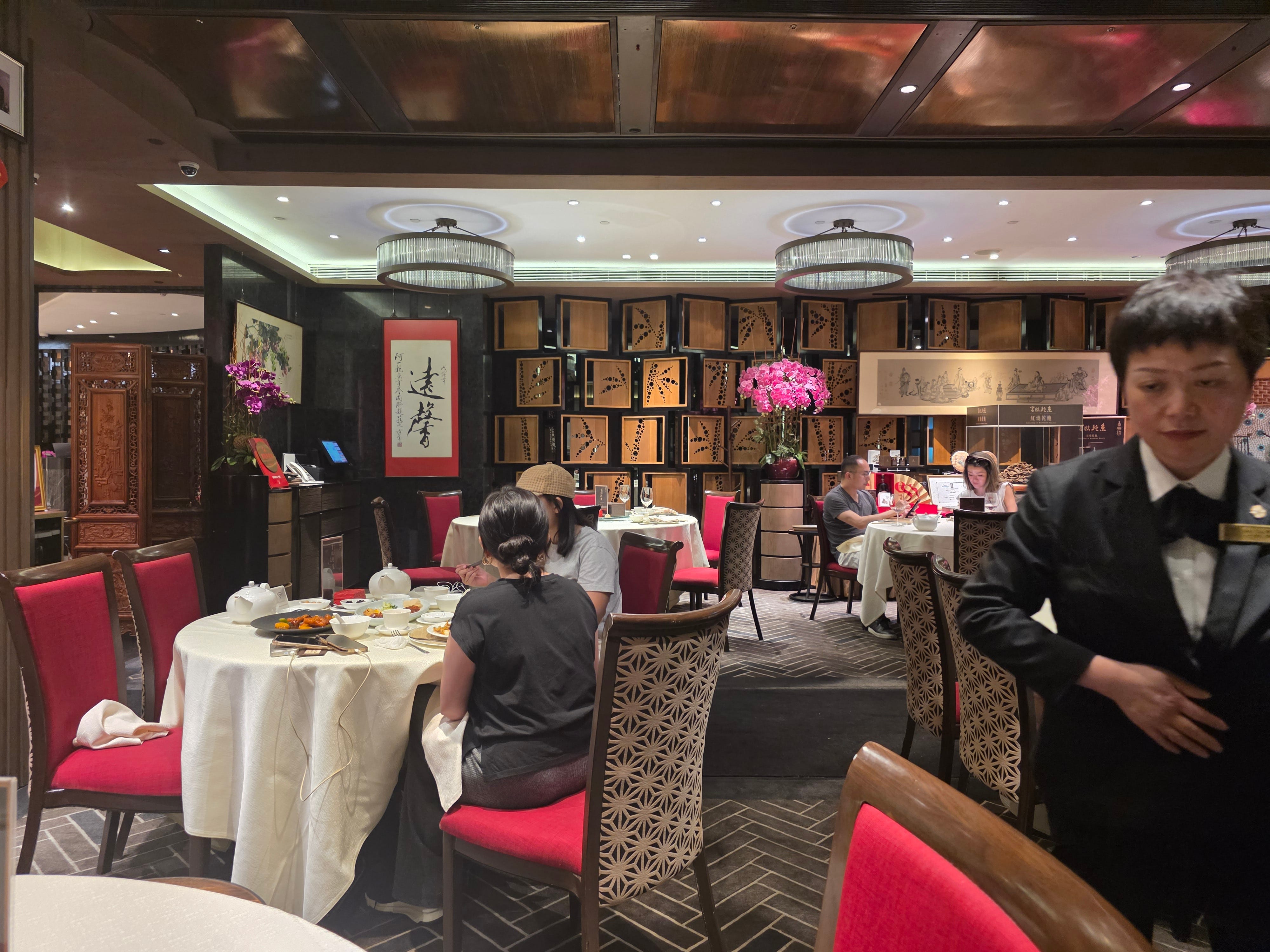 The room itself feels exactly as an old guard Cantonese dining room probably should. Slightly dated Chinese décor, polished surfaces, red accents, dark wood screens, chandeliers, porcelain vases, and the sort of understated formality that now feels increasingly rare in Hong Kong. It is not fashionable in the contemporary sense. It does not need to be. The whole place feels like a preserved piece of another era, more banquet hall than tasting-menu theatre.