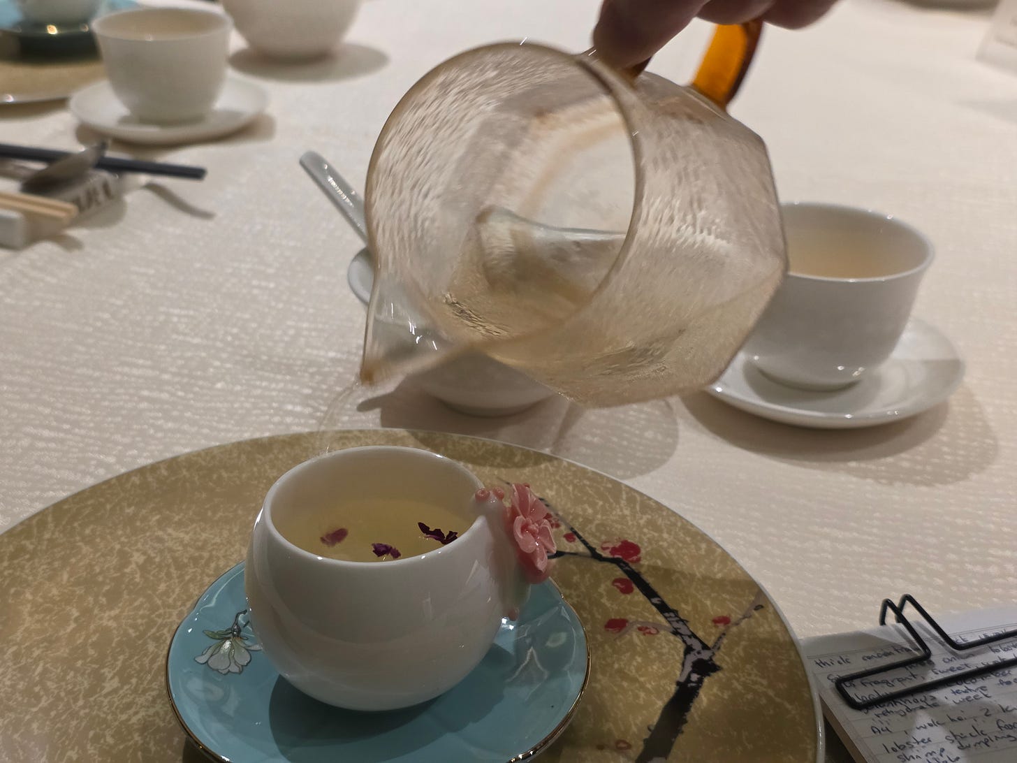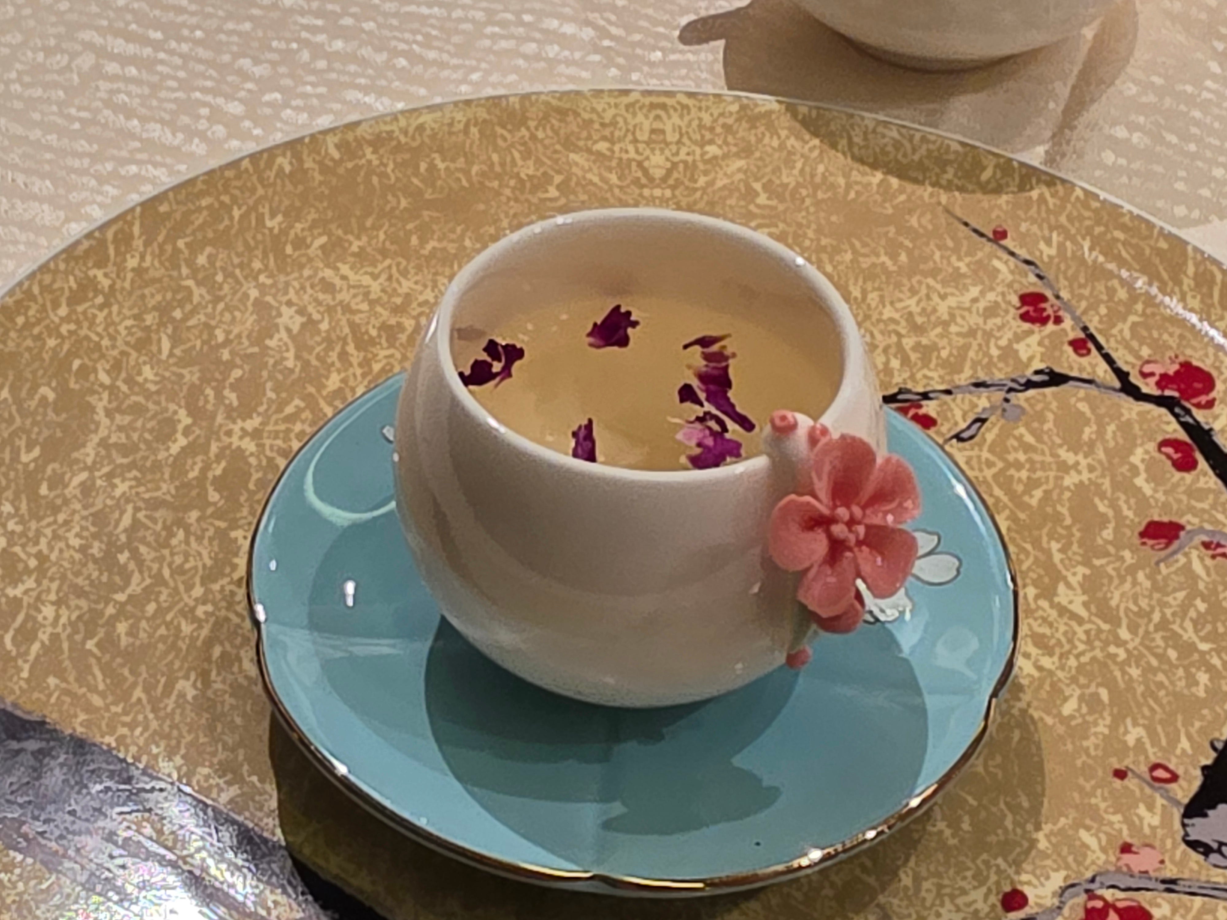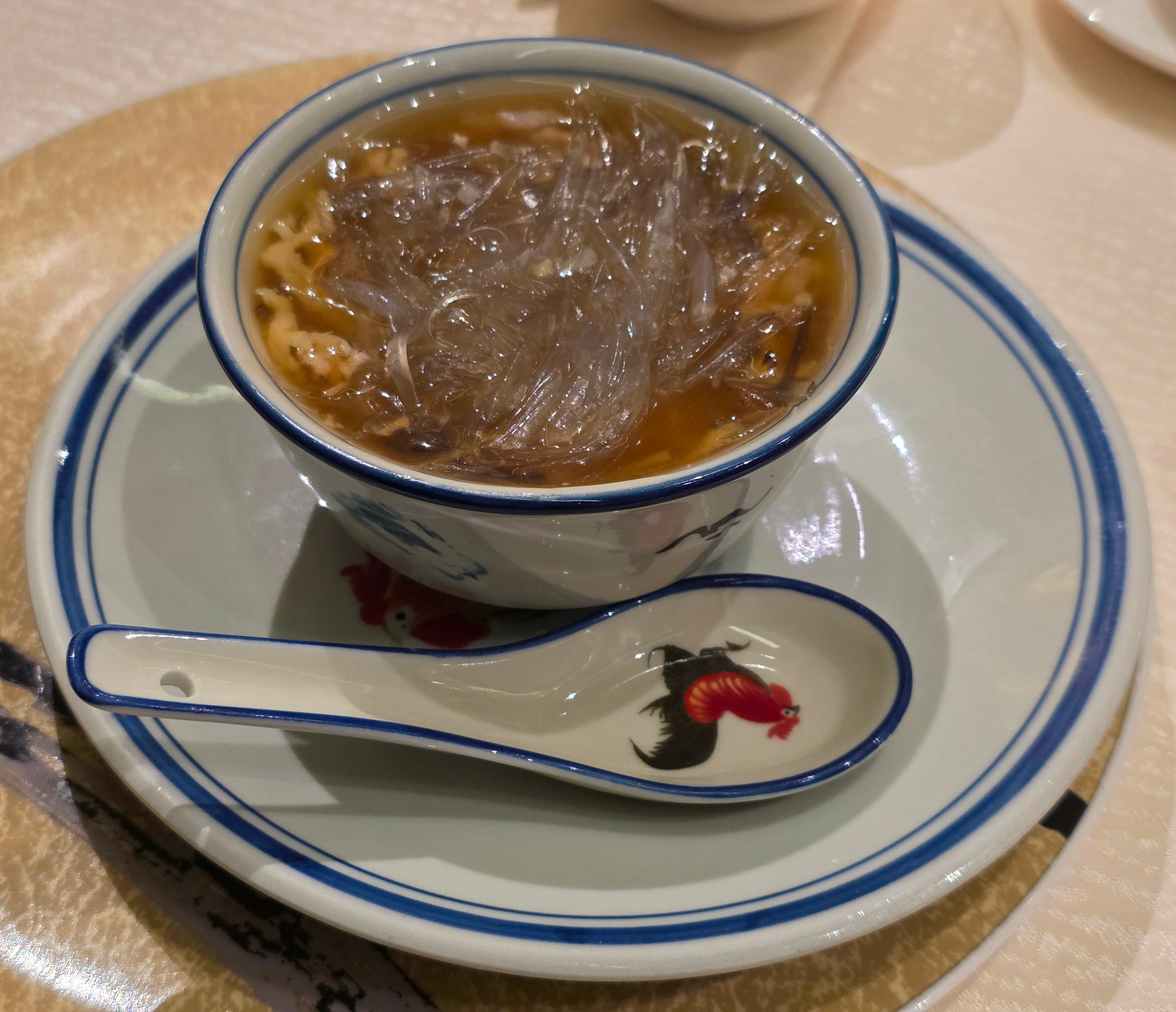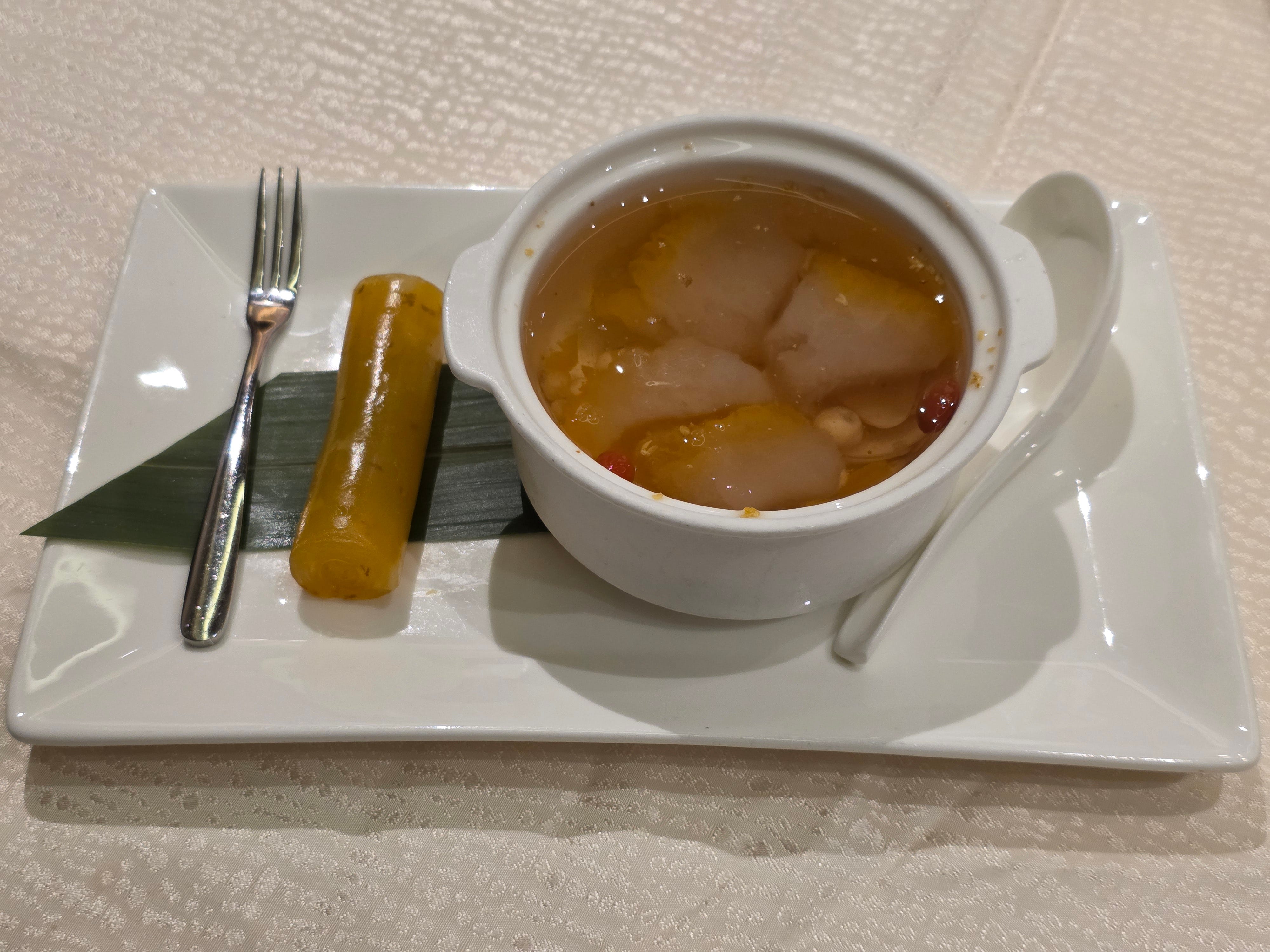 Dessert was less convincing. A chilled Cantonese sweet soup arrived with crispy aged lily buds, osmanthus, spongey Chinese fungus, and barley-like grains, alongside an osmanthus jelly roll topped with water chestnut flakes. It was certainly interesting, but not my favourite part of the meal. The textures felt slightly awkward together, and the whole thing leaned more unconventional than delicious.