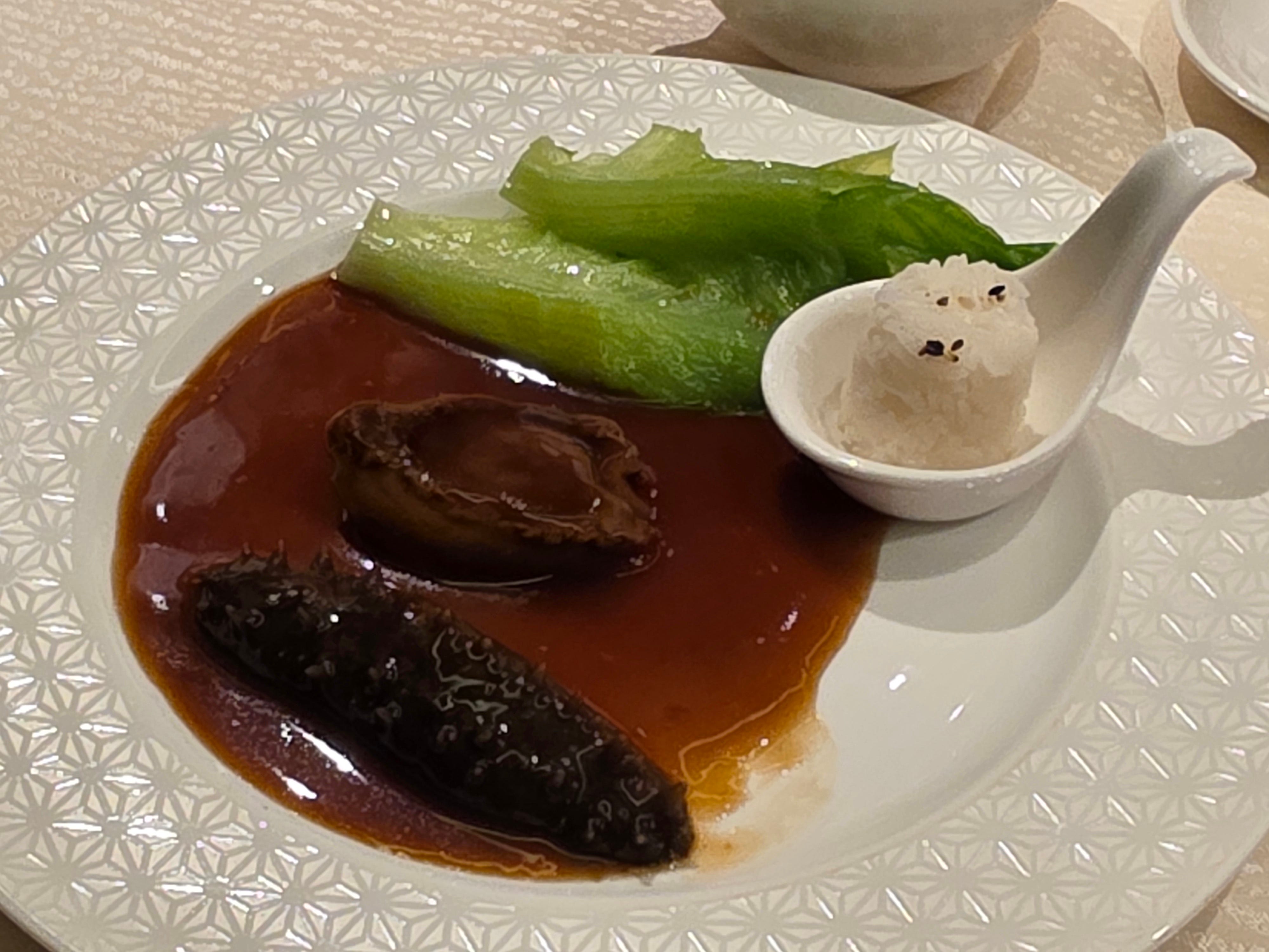 Then came the dish most closely associated with Forum, and the one that explains why Yeung earned the title “King of Abalone”. This was a deeply traditional preparation of rehydrated dried seafood, featuring a whole braised abalone and sea cucumber served with Chinese lettuce and a small ball of rice to mop up the sauce. Both sea cucumber and abalone are texture foods as much as flavour foods. On their own, they are relatively restrained, absorbing the essence of whatever they are cooked in. Sea cucumber tends toward a gelatinous springiness, while abalone can easily turn tough if mishandled. Here, both were superb. The abalone sauce had that dense, savoury depth that only comes from long reduction and patience, and the little rice ball was a smart touch, because wasting that sauce would have been unforgivable.