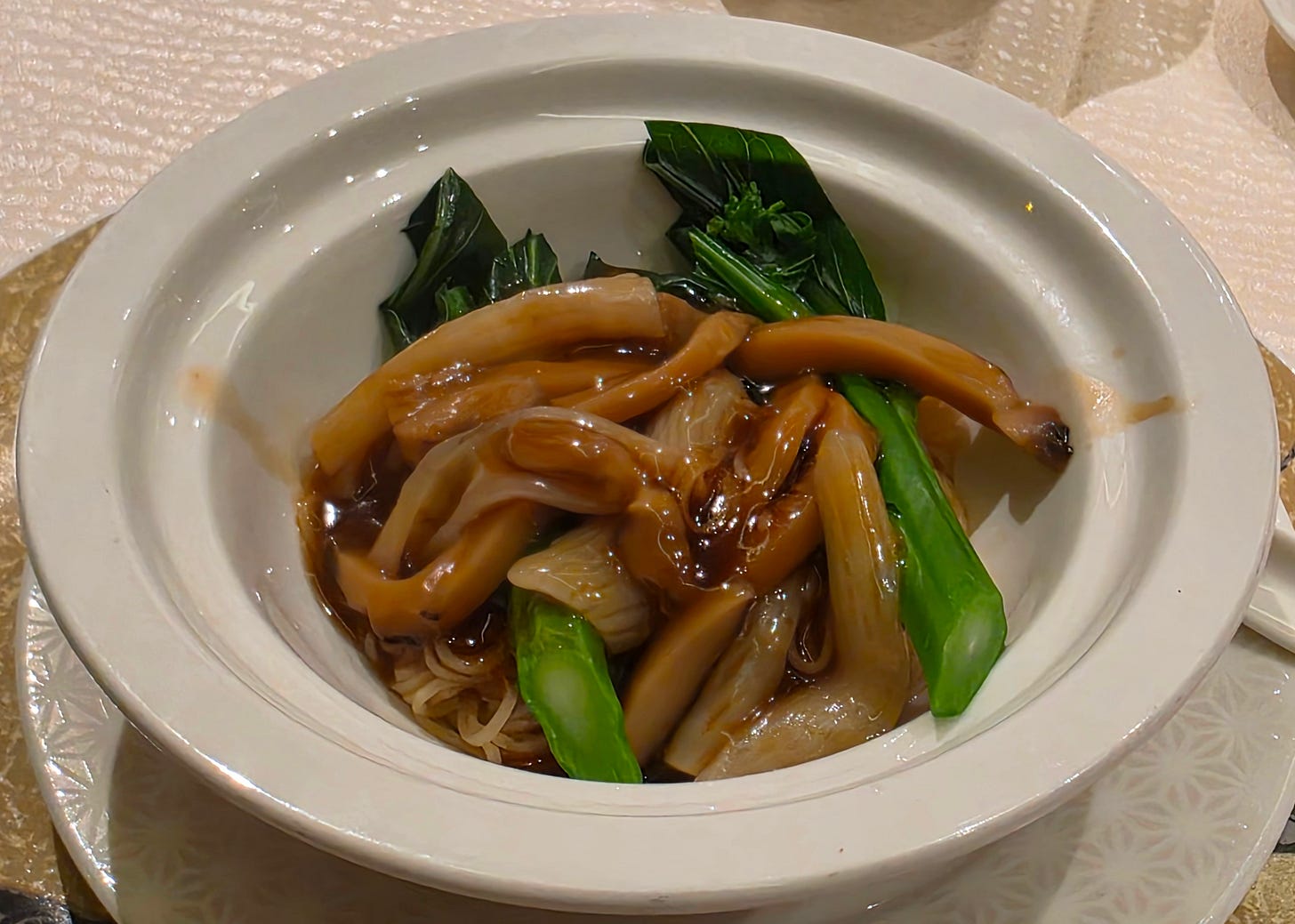 To round out the savoury part of the meal, we were served dry-stirred vermicelli with braised mushrooms, shredded fish maw, poached gai lan, and more of that excellent abalone sauce. This was a deeply satisfying closing starch, the sort of dish that feels far more luxurious than it sounds on paper once all the sauce and concentrated seafood flavours begin to settle in.