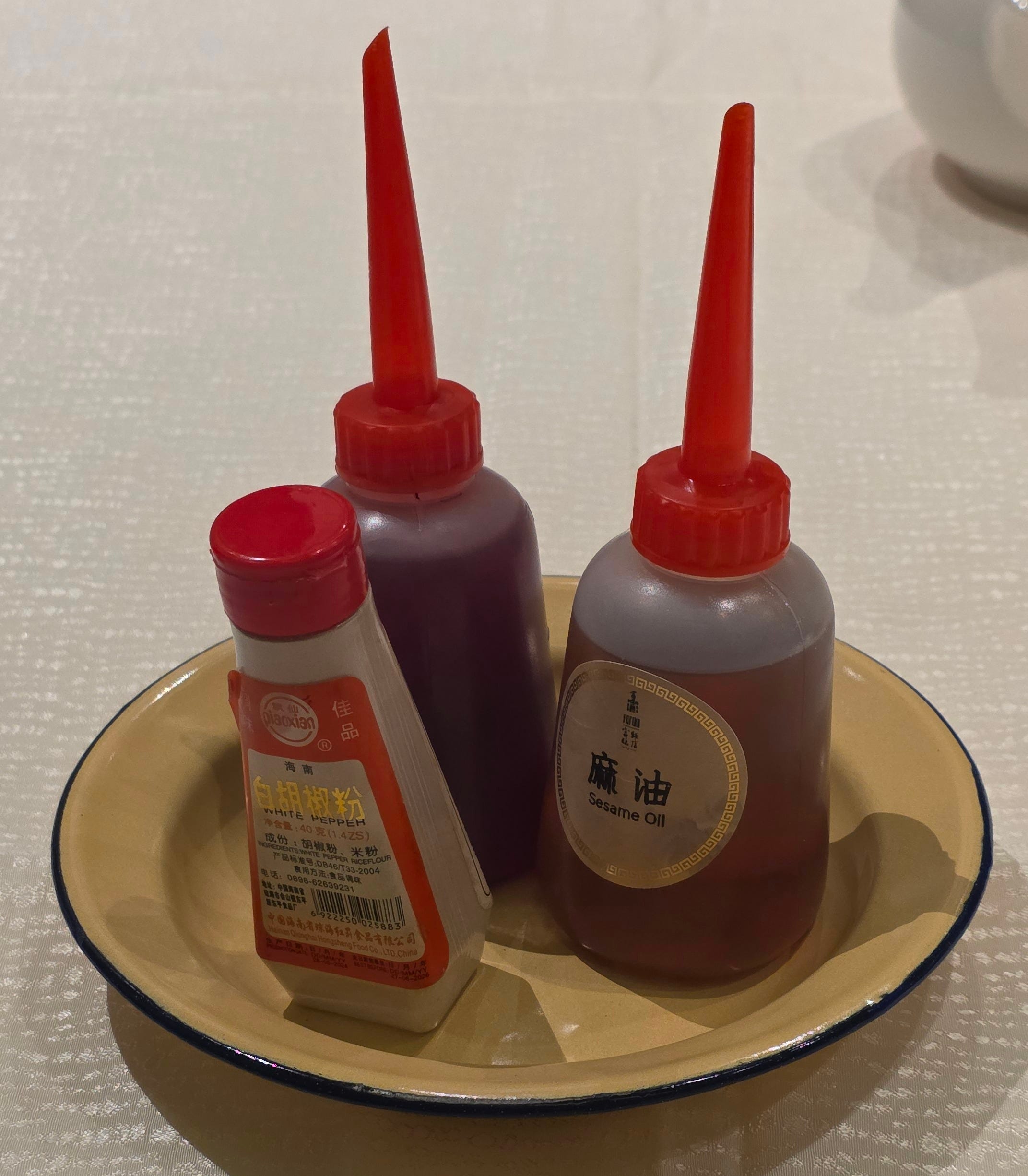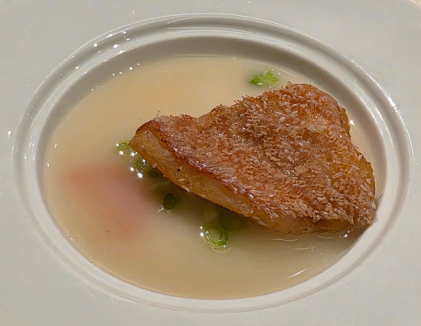 One of the highlights of the night came next, Forum’s luxurious take on imitation shark fin soup. This is the sort of dish you can find all over the city in humbler form, where vermicelli stands in for shark fin in a thickened broth with shredded chicken and mushrooms. Forum reversed the substitution and put the real thing back in, serving an actual shark fin soup with the traditional street-side condiments on the side: red vinegar, sesame oil, and fine white pepper. The result was wonderful. There was something faintly amusing about presenting such a luxurious version of such a familiar Hong Kong comfort dish, but it worked beautifully. The broth was rich and deeply savoury, and the condiments gave it that nostalgic local identity.
