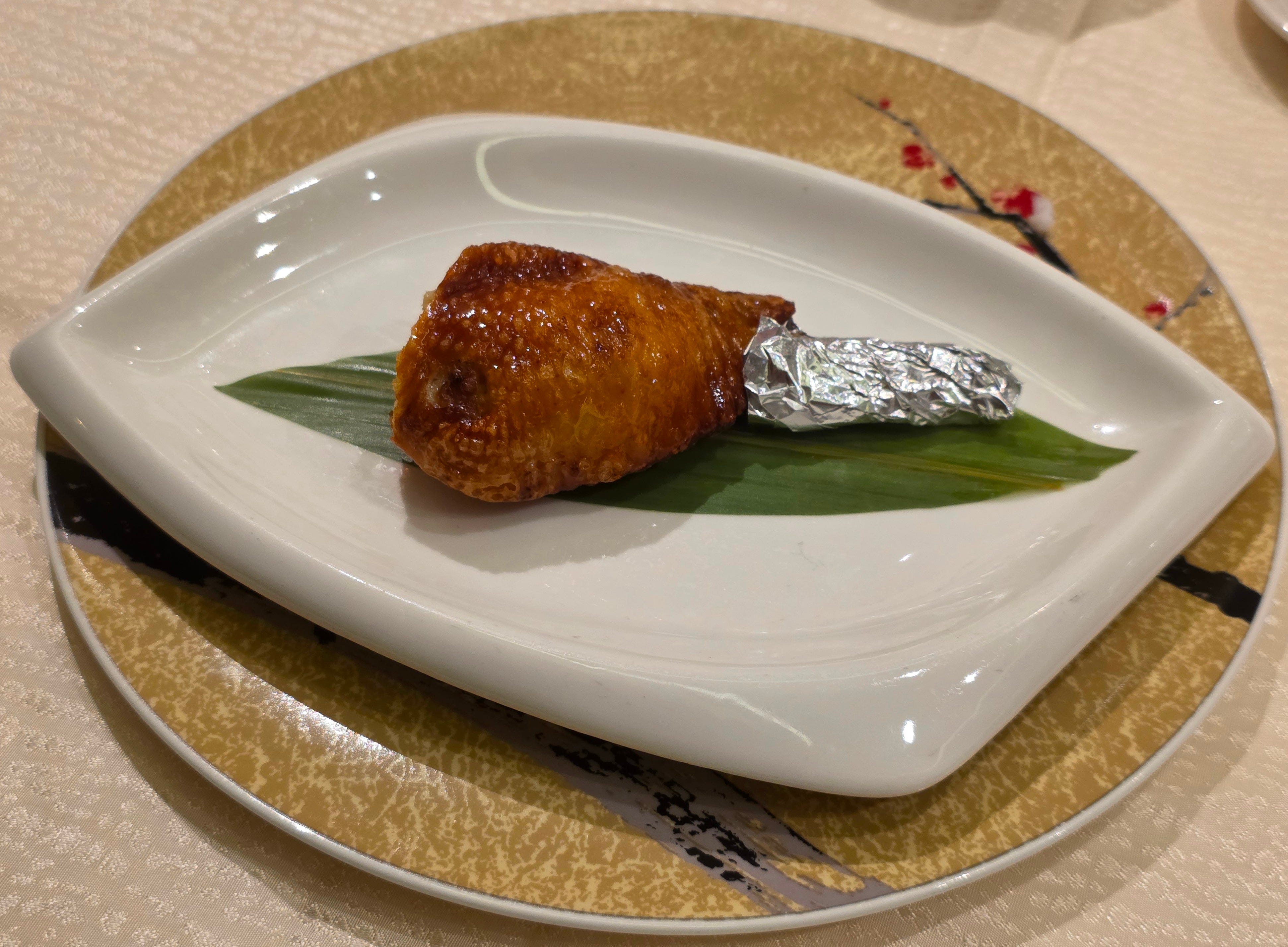Another of the more playful dishes followed: a deboned chicken wing stuffed with fennel pork mince. Juicy, aromatic, and unexpectedly herbal, it almost read more European than Cantonese. In fact, the flavour profile reminded me more of a good British pork sausage than anything I usually associate with banquet Cantonese cooking. Strange in theory, but enjoyable in practice.
