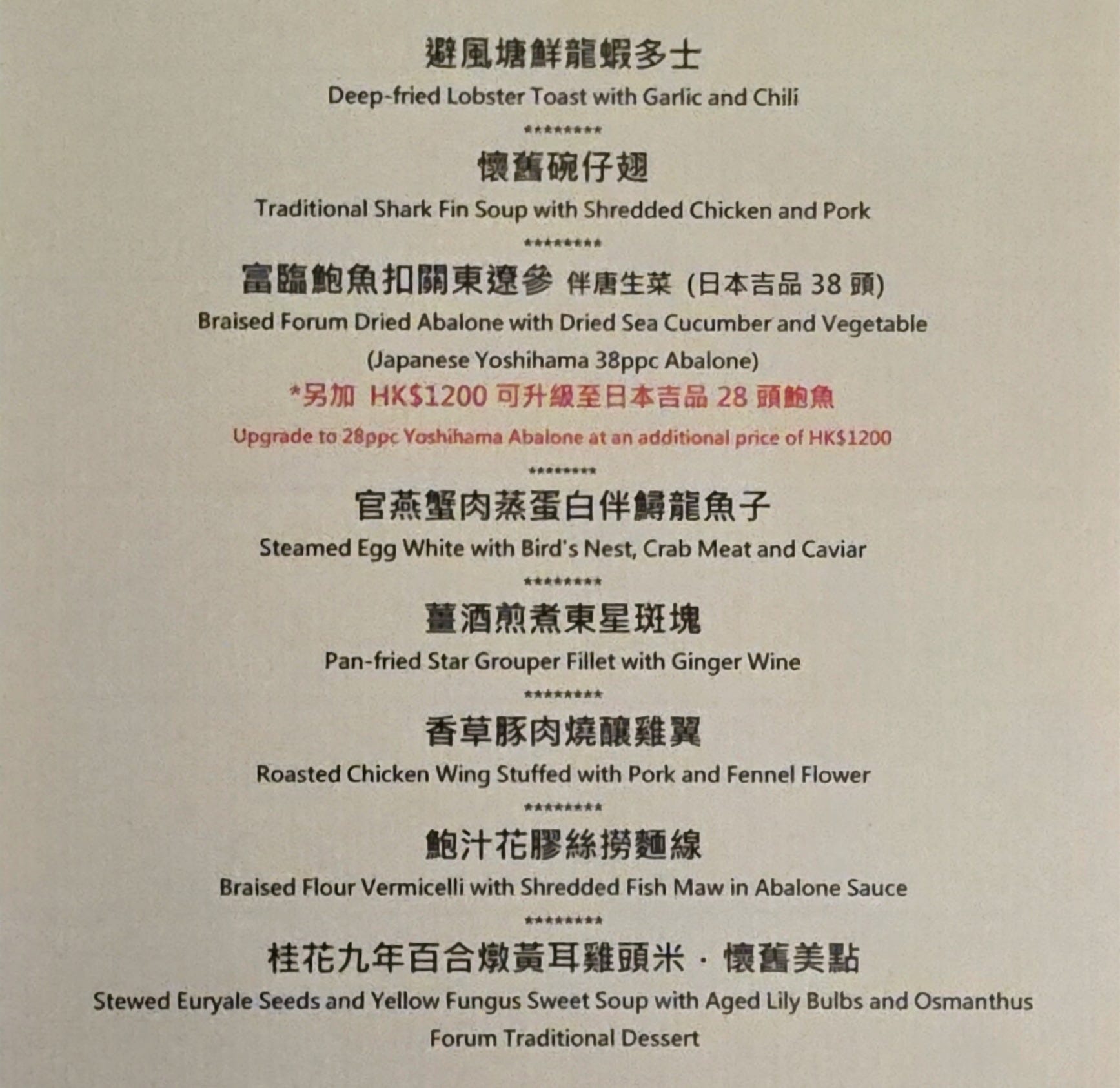 There were several tasting menus on offer, alongside a thick à la carte menu full of the restaurant’s classics. We decided to go with one of the tasting menus, partly because it allowed the kitchen to show its range, and partly because it seemed the best way to understand how Forum thinks about luxury Cantonese food. As the meal unfolded, one of the more interesting themes became clear. Several dishes took familiar Hong Kong street-side or everyday formats and elevated them using premium ingredients and banquet-style techniques.