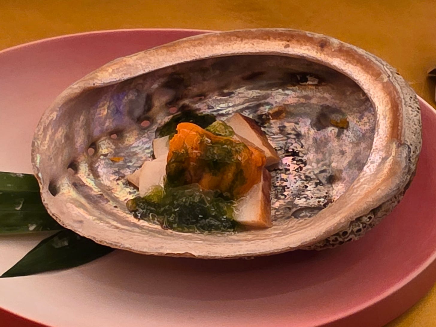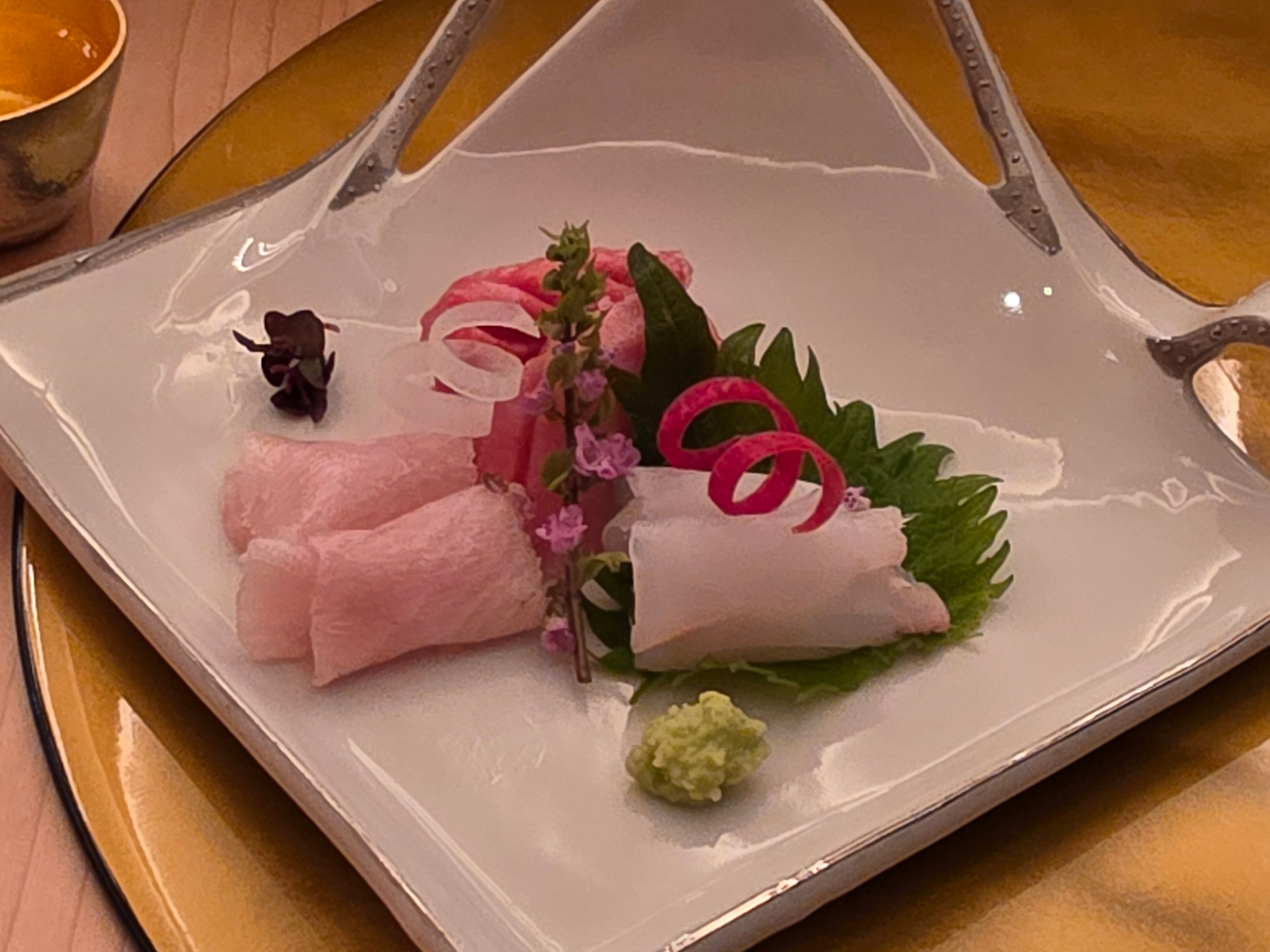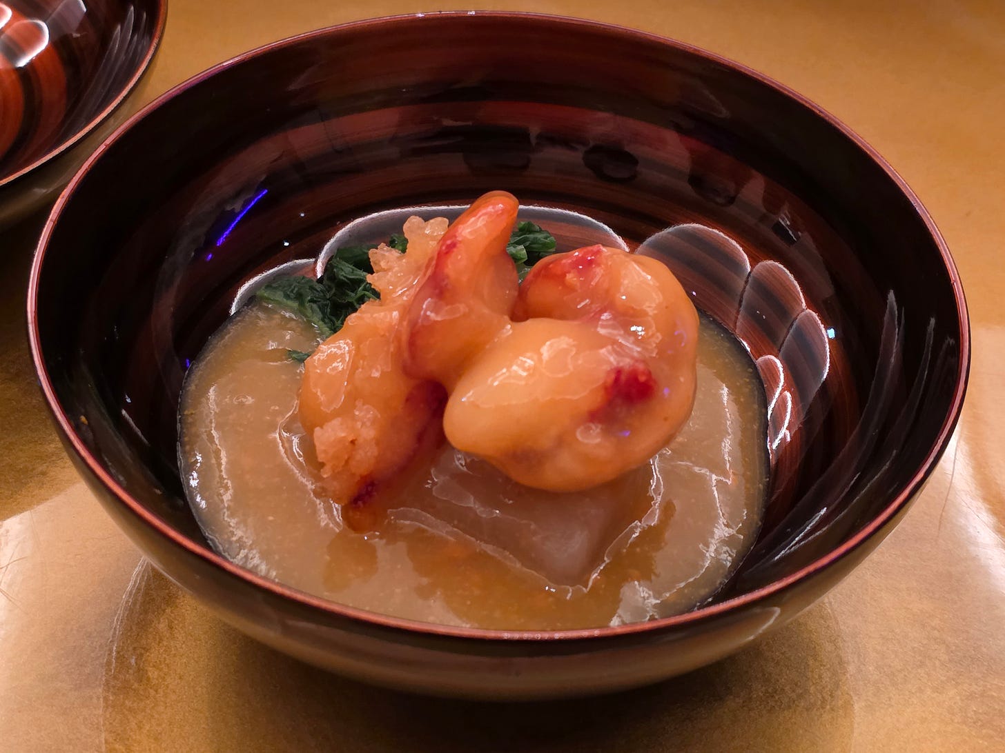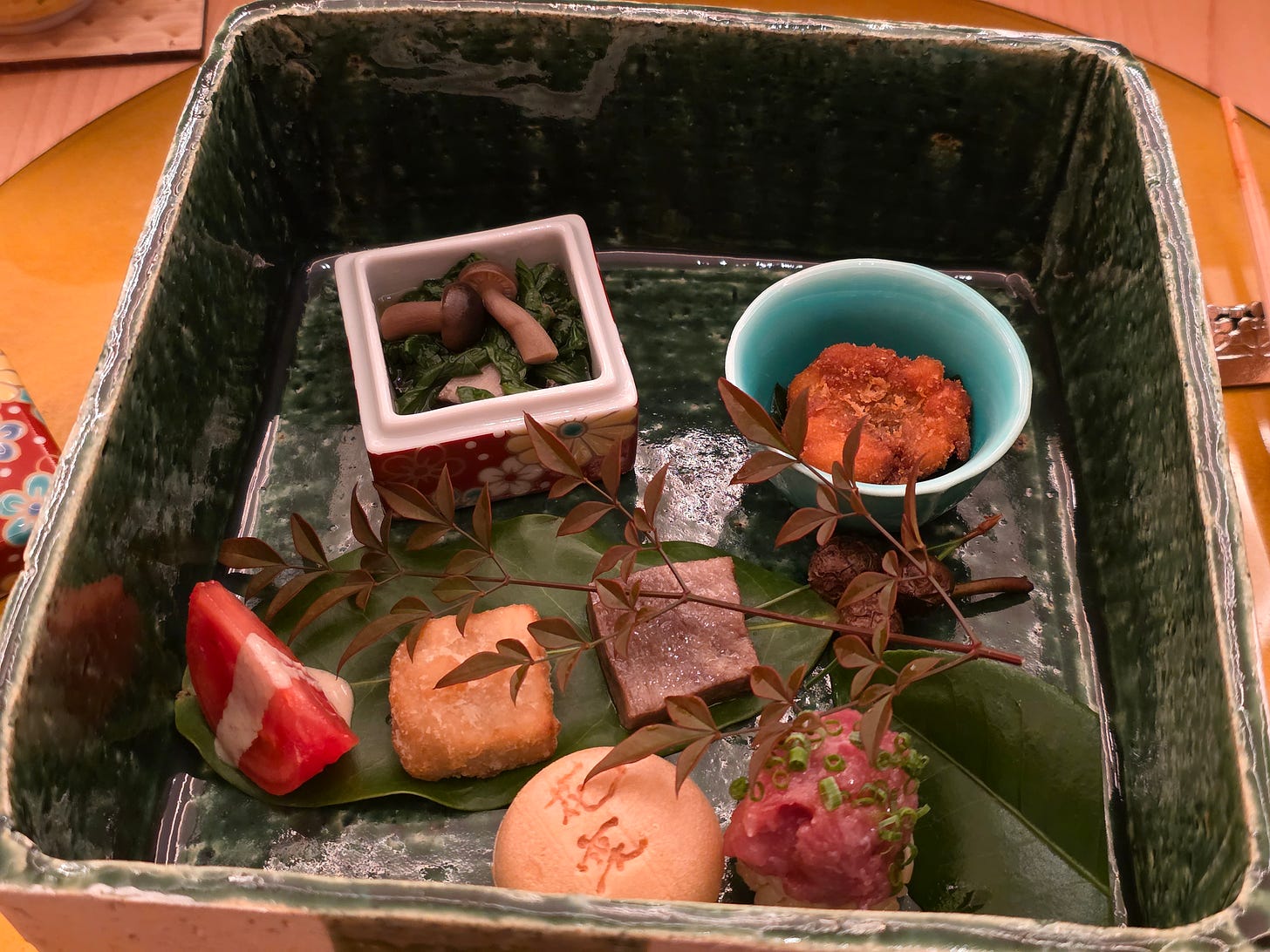 A classic Kaiseki or Kappou dish, the Hassun. Originating from the tea ceremony, it’s served in a square dish with little morsels of food, pairing food from the sea next to food from the mountain. We were told to try it in order, from right to left, top to bottom