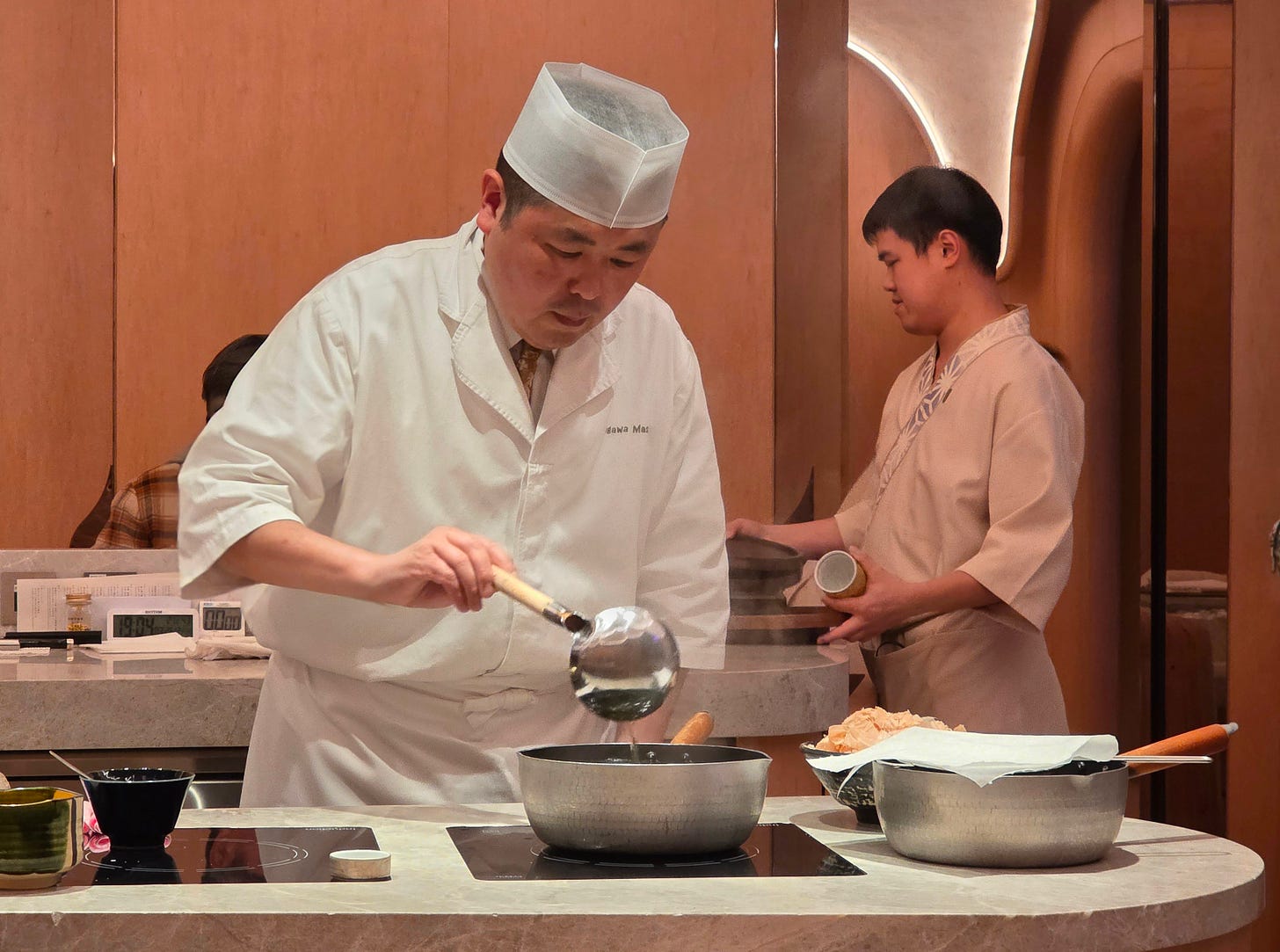 The chef was in the center, already preparing a clear broth for a dish later in the meal.