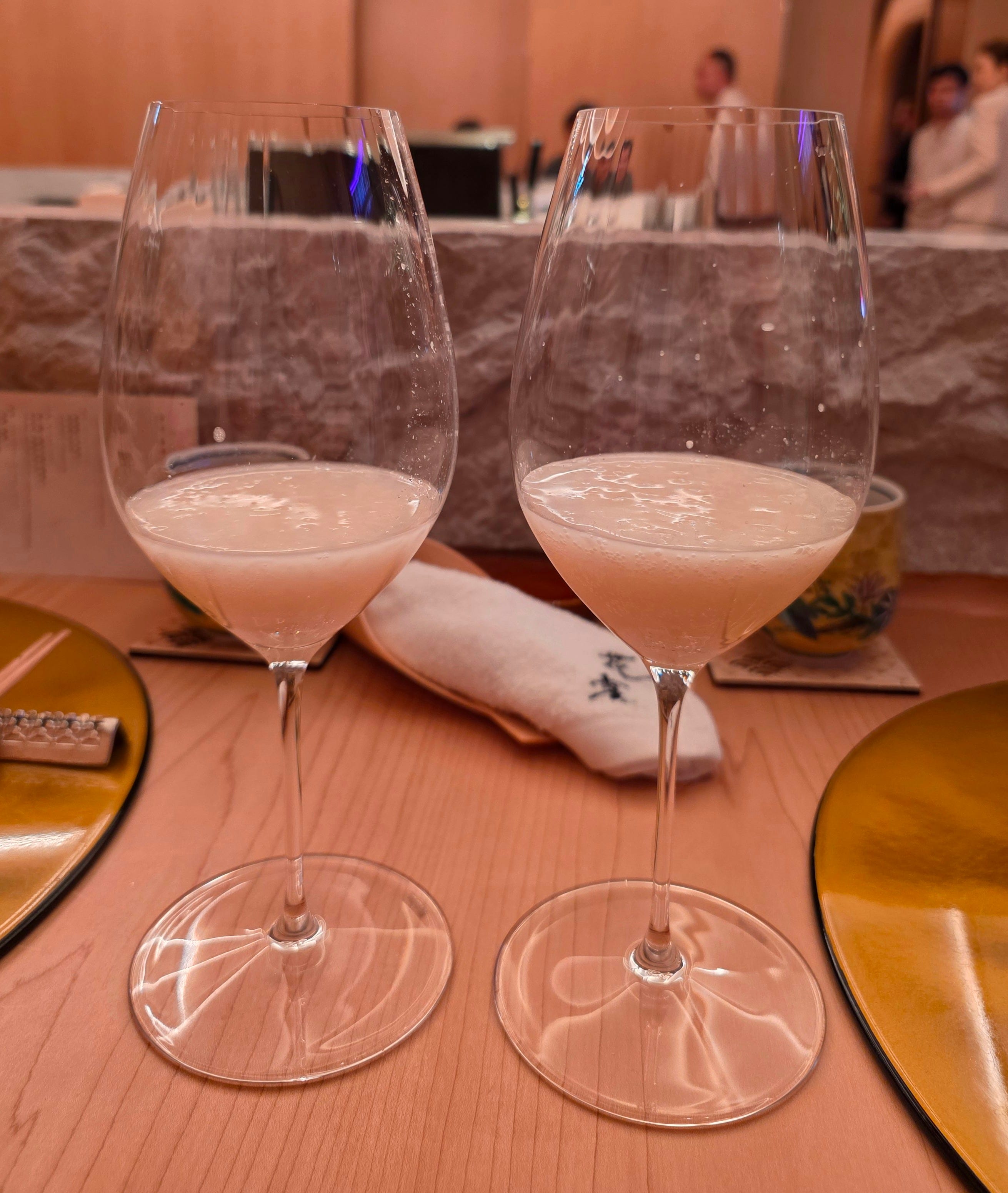 We decided to go with a cloudy sake, but neither we nor the sommelier seemed to pick up on the fact that it was highly carbonated. A loud pop and the cap landing in my companion’s lap later, we were served sake in wine glasses.