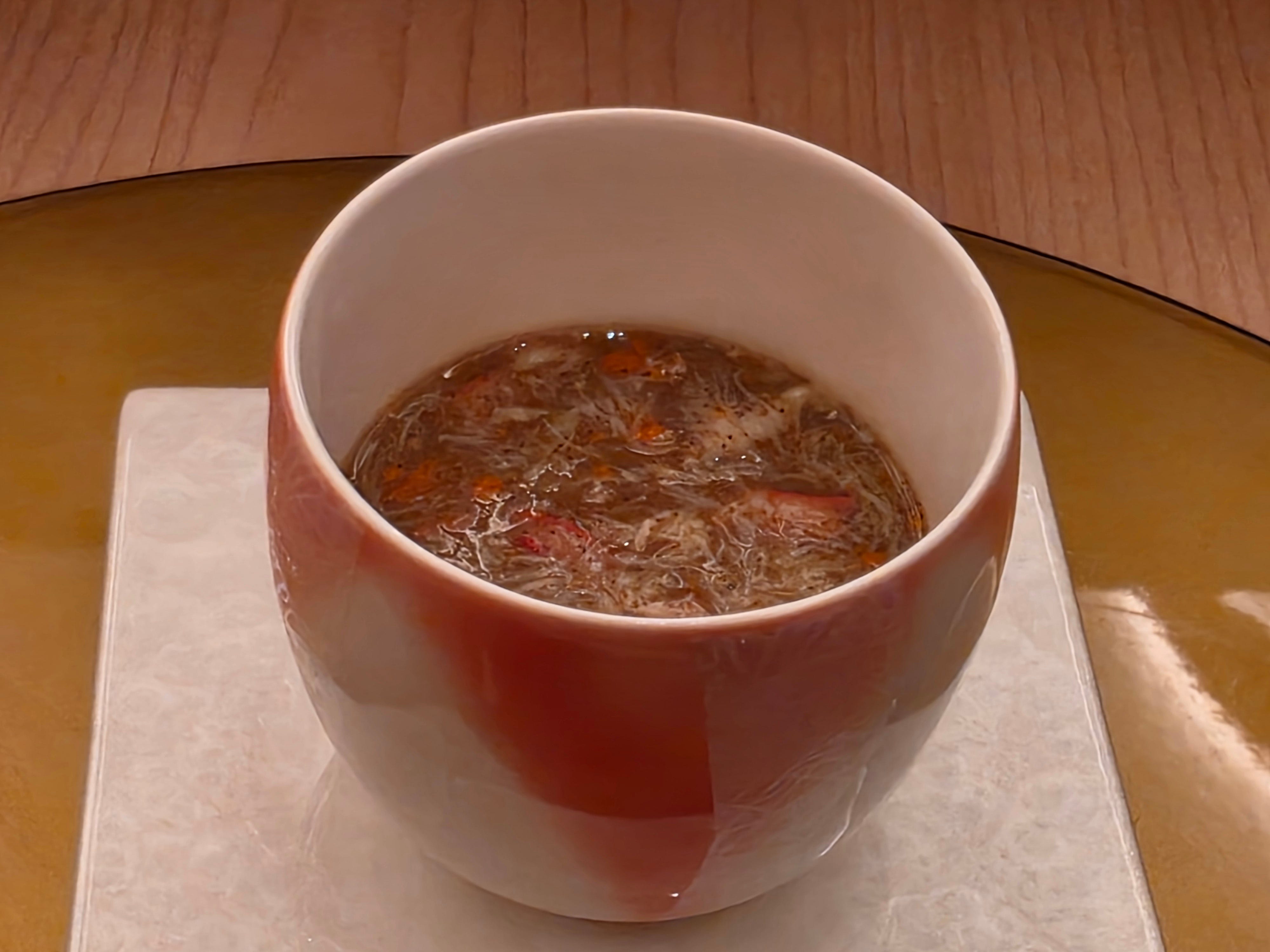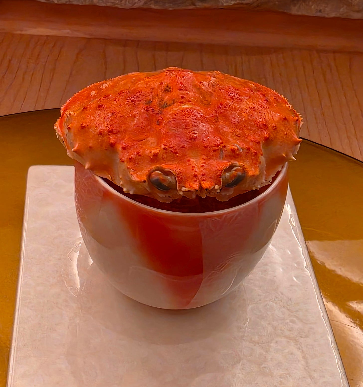 The second course came next, with a steamed egg chawanmushi topped with a thick layer of crab meat and crab roe, and capped with the crab shell. Strong, a bit fishy, and a bit different than the usual chawanmushi with the ingredients embedded within the silky egg custard.