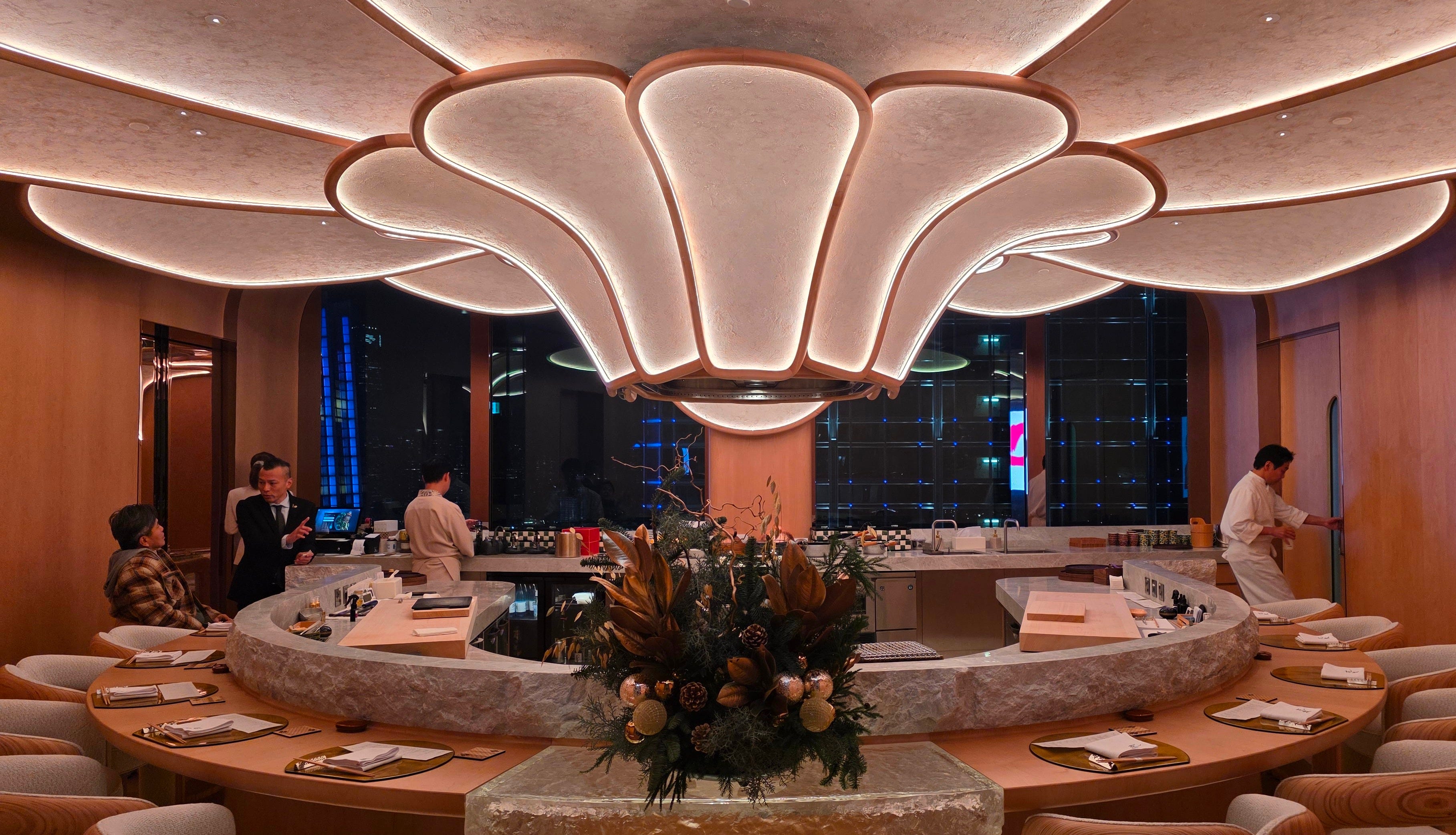 Stepping into the restaurant provides a much more serene environment, with wood and stone surrounding the central chef’s counter and diffuse lighting emanating from the ceiling designed to look like blooming flower petals.