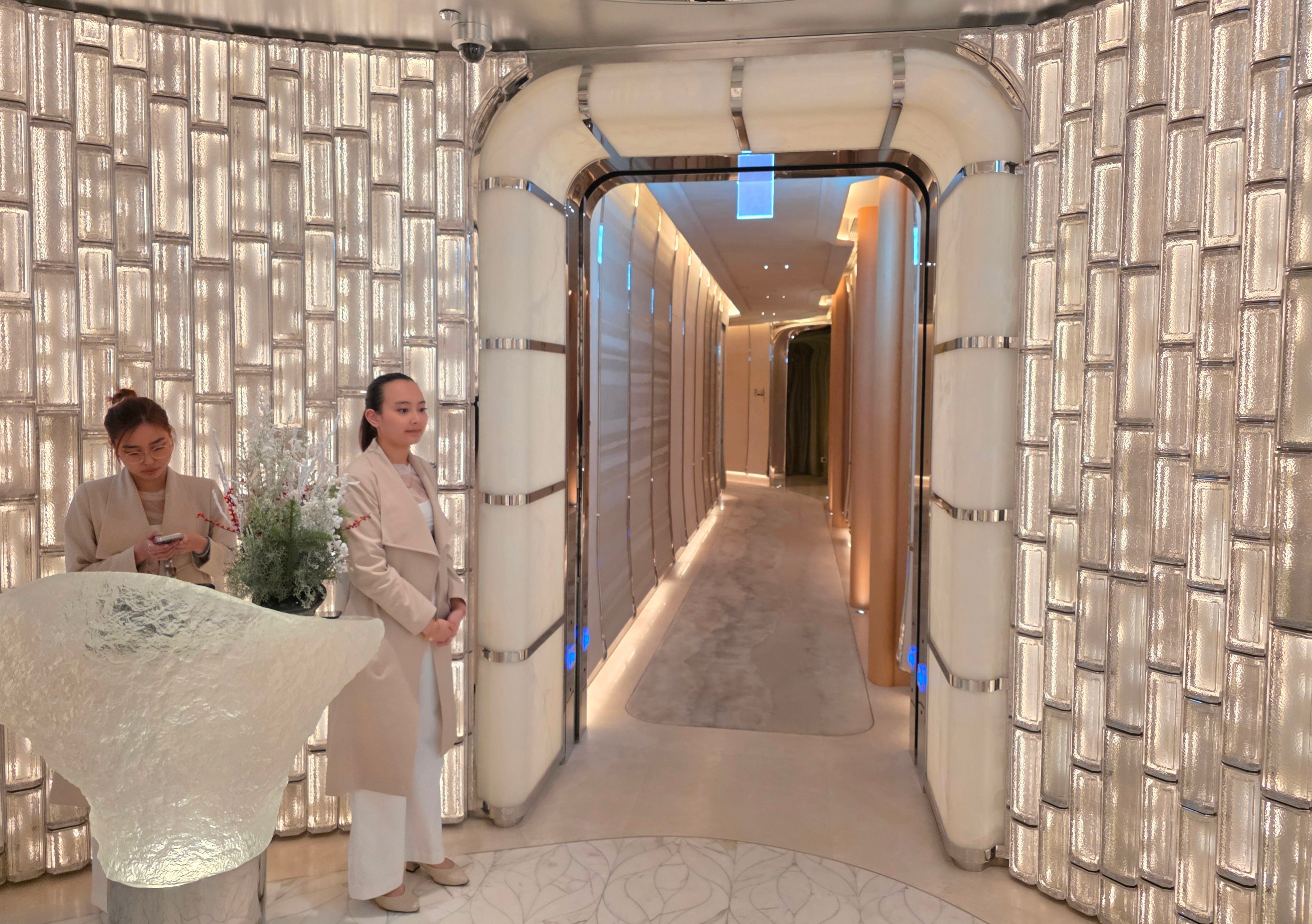 Located at the 38th floor of the new Henderson, the restaurant shares the floor with a cocktail bar and has an entryway a bit reminiscent of a spaceship.