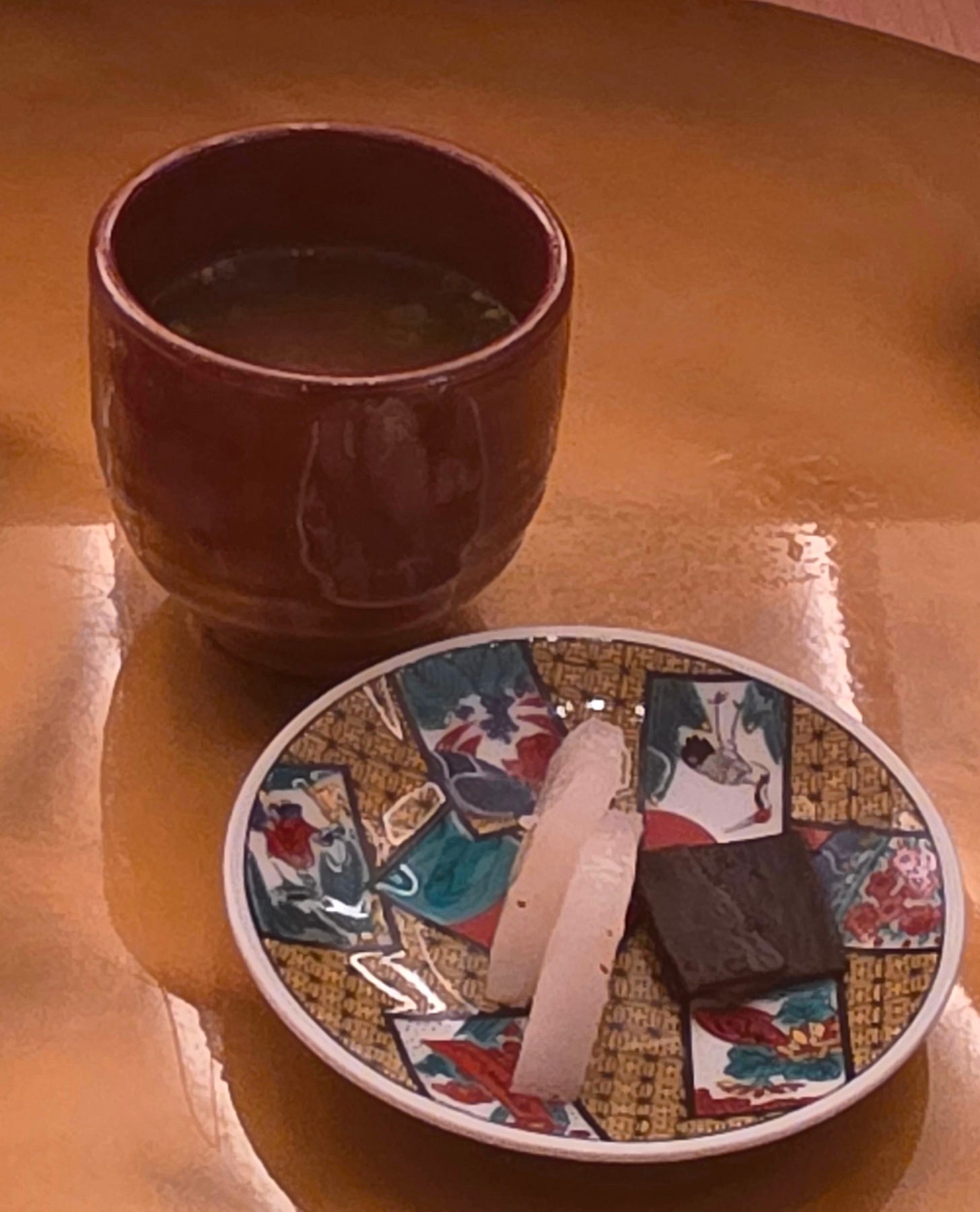 Winding down after the main, a small cup of concentrated miso soup, and some Japanese pickles.